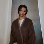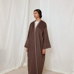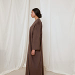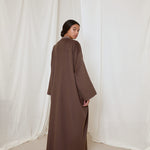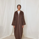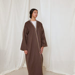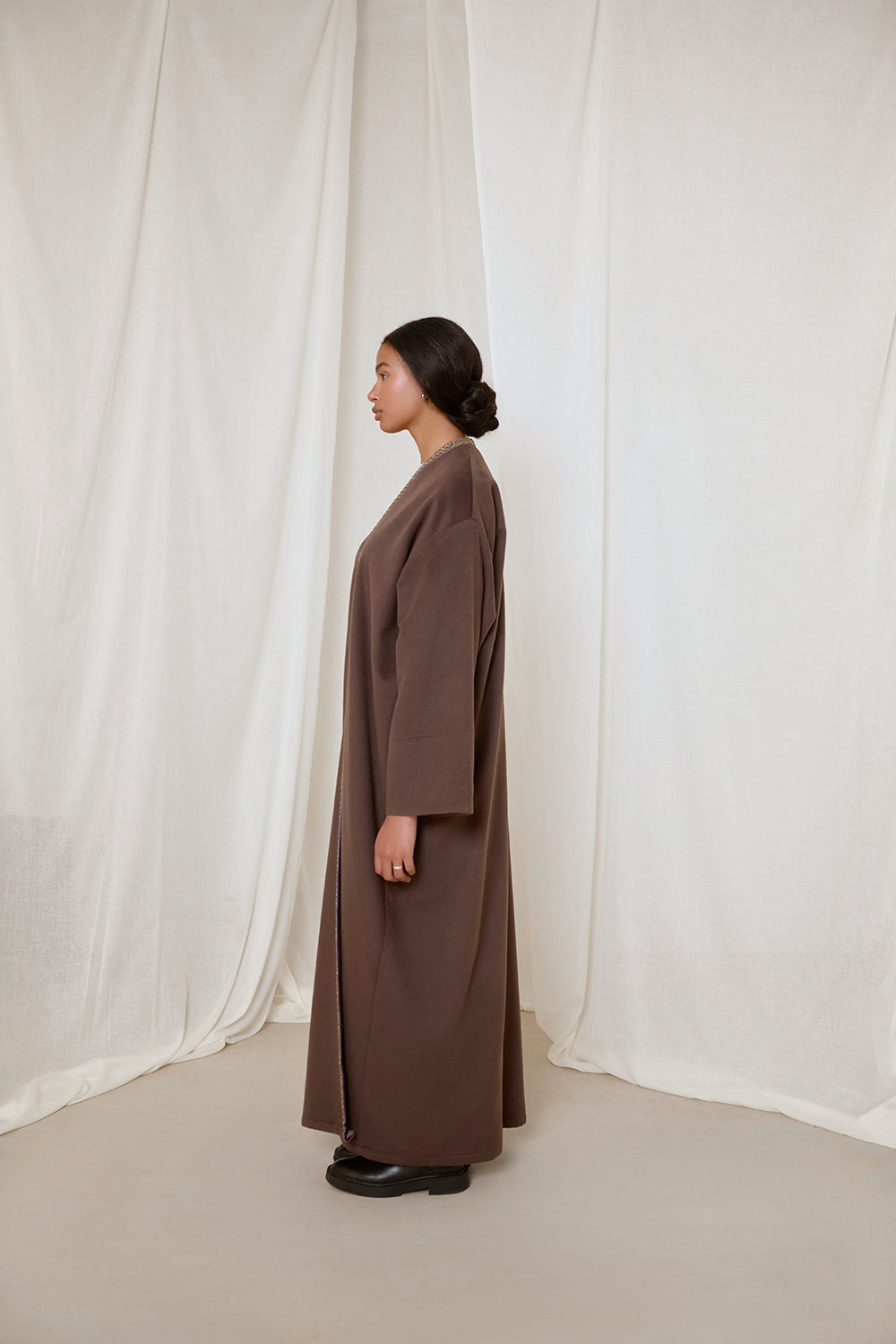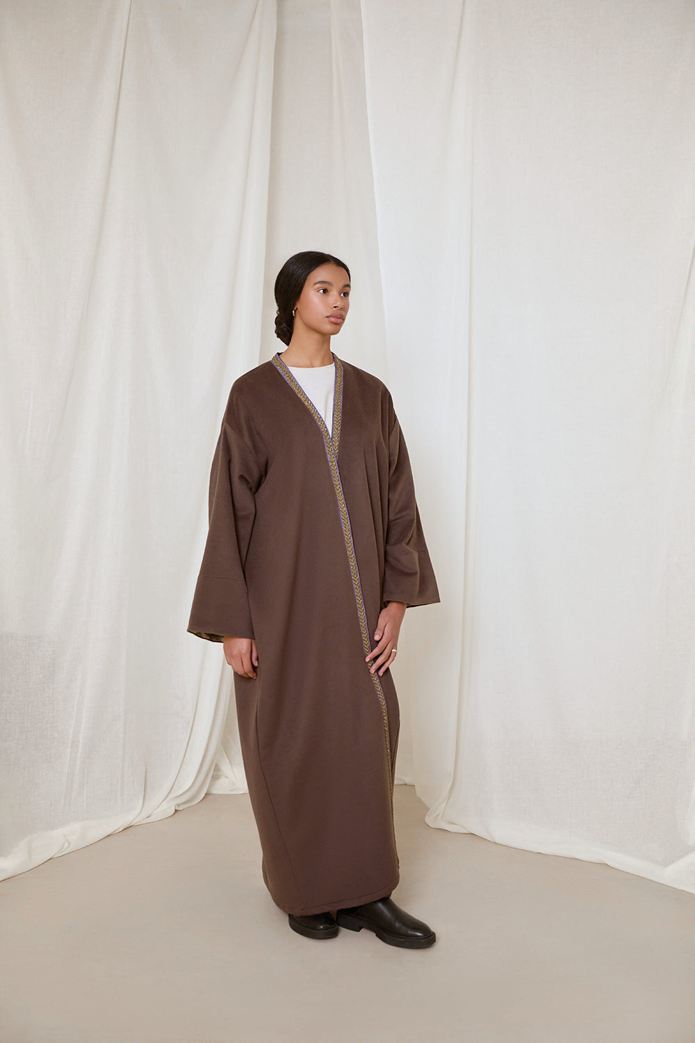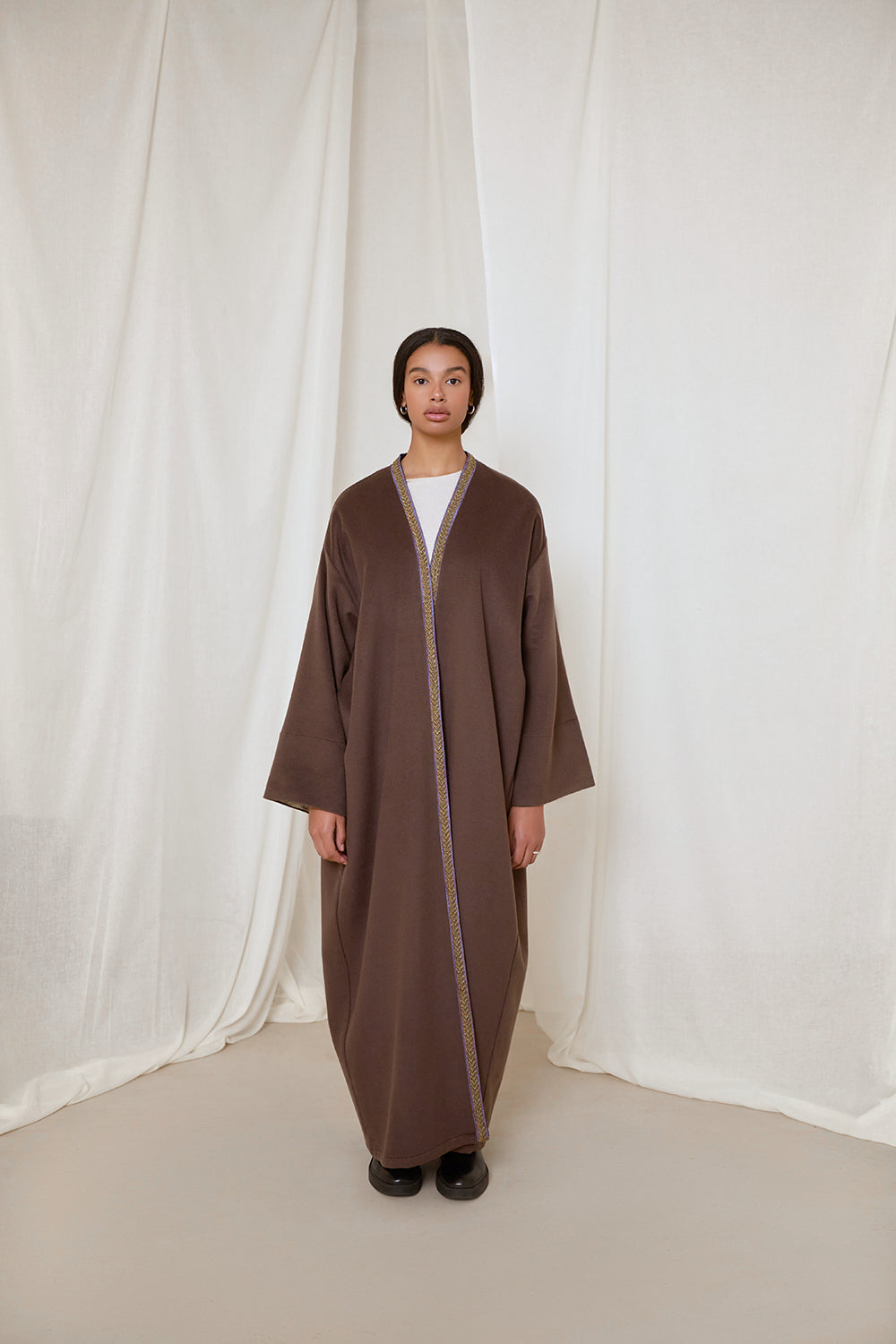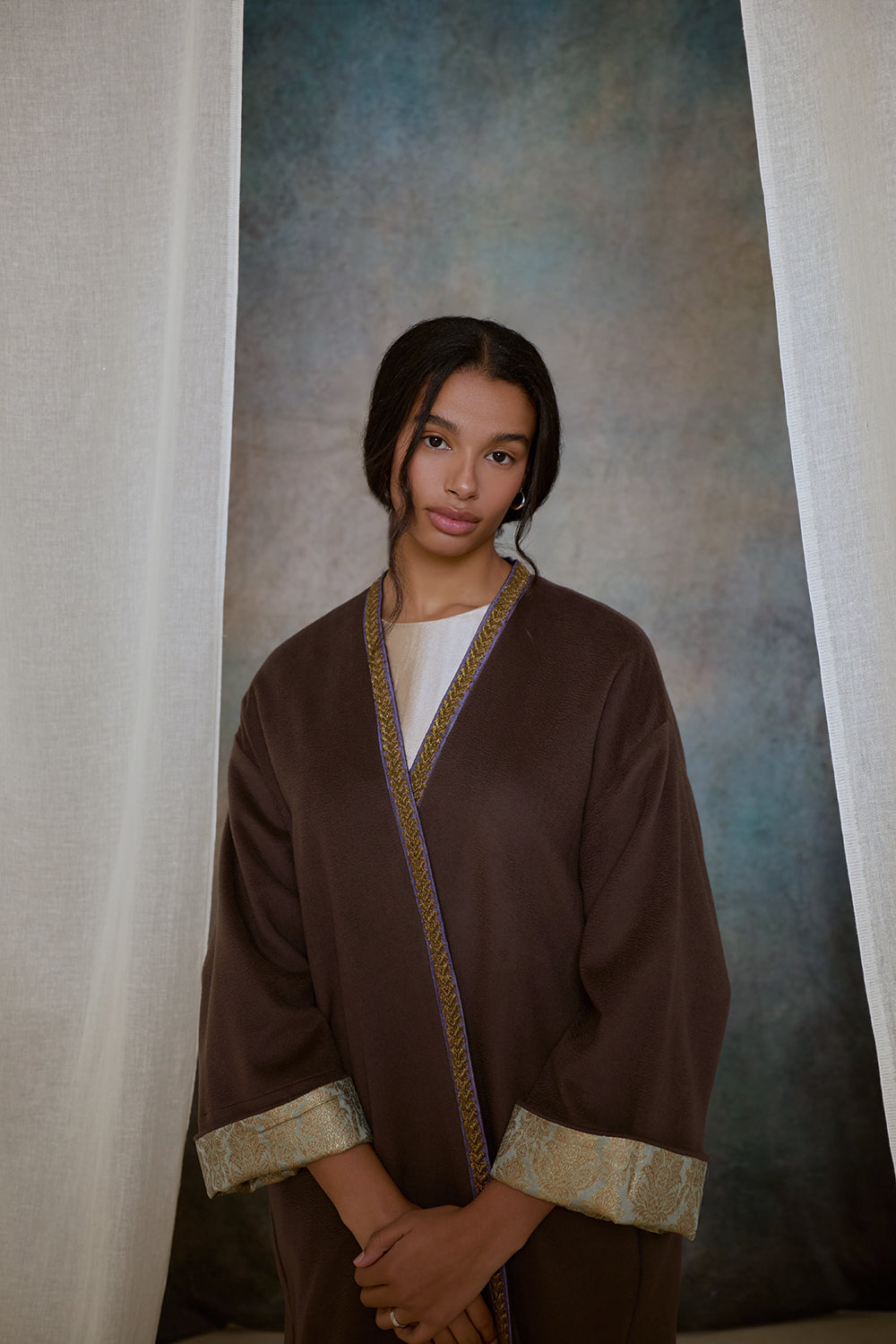 Wool and cashmere textured abaya, finished with a vintage metalwork trim from India, and brocade cuff inserts.