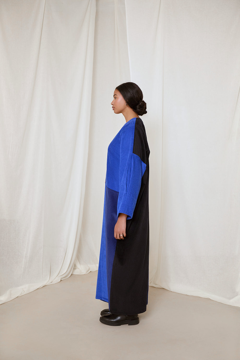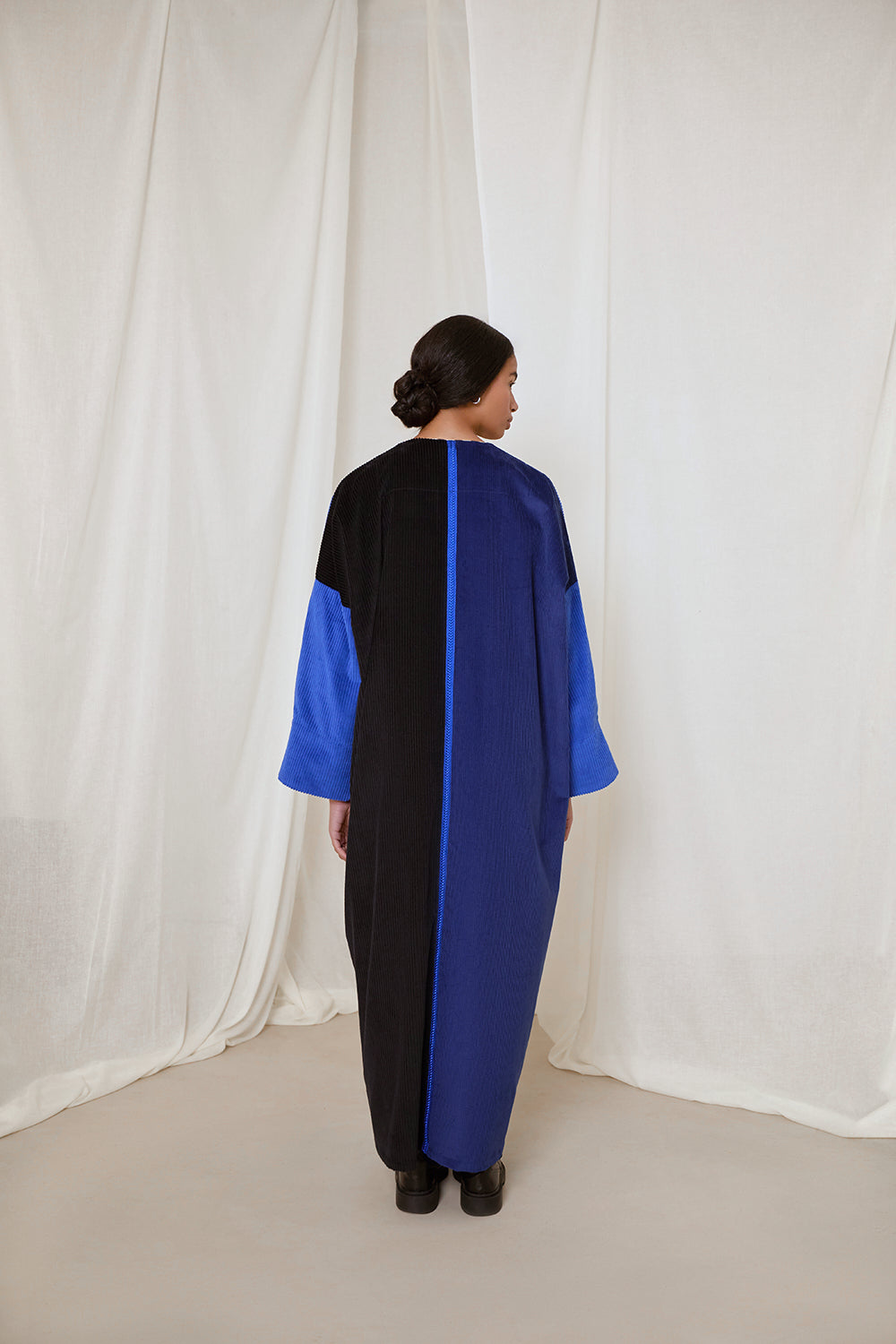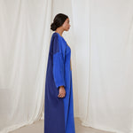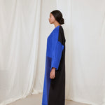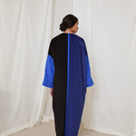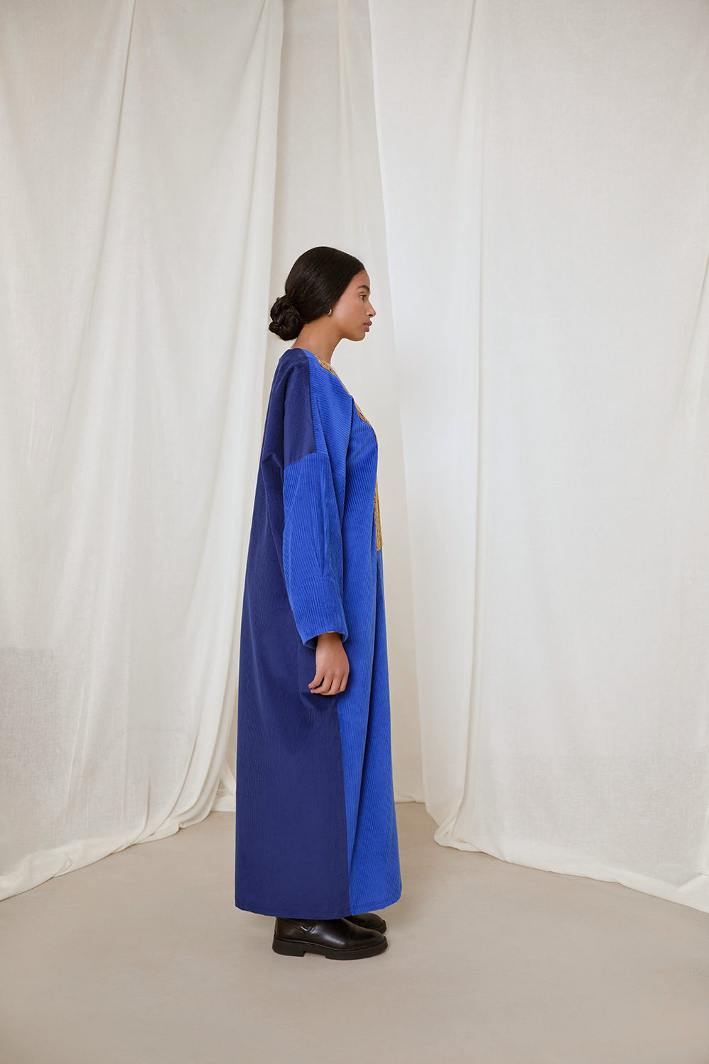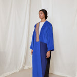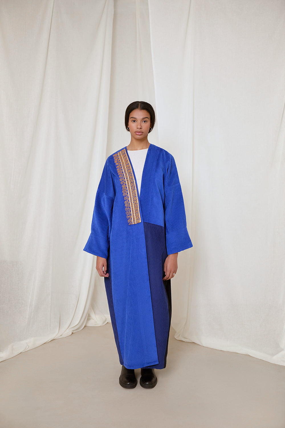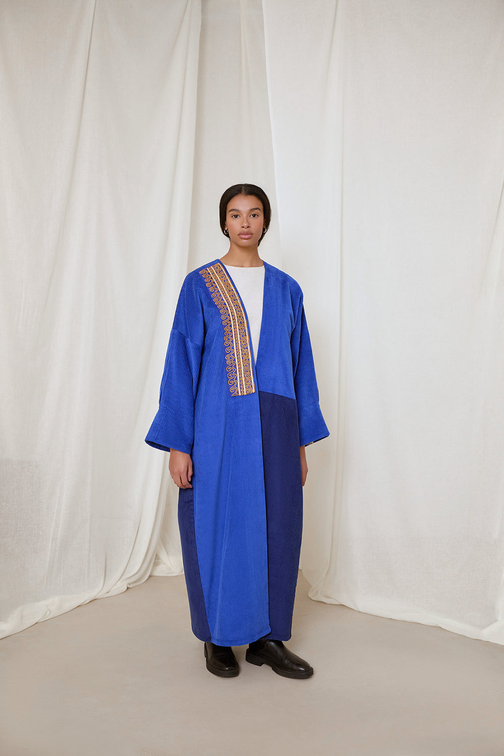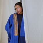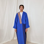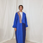 Electric and royal blue corduroy coat abaya. Finished with a rare vintage textile sourced from Afghanistan, and moroccan sfifa trim detail.