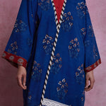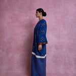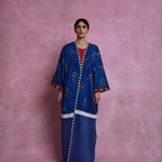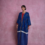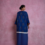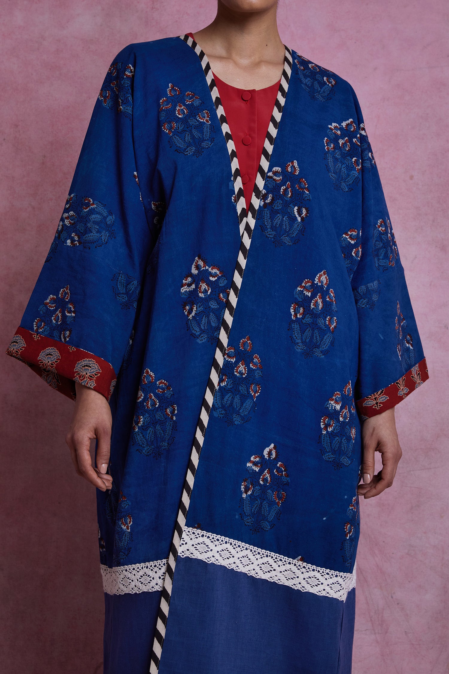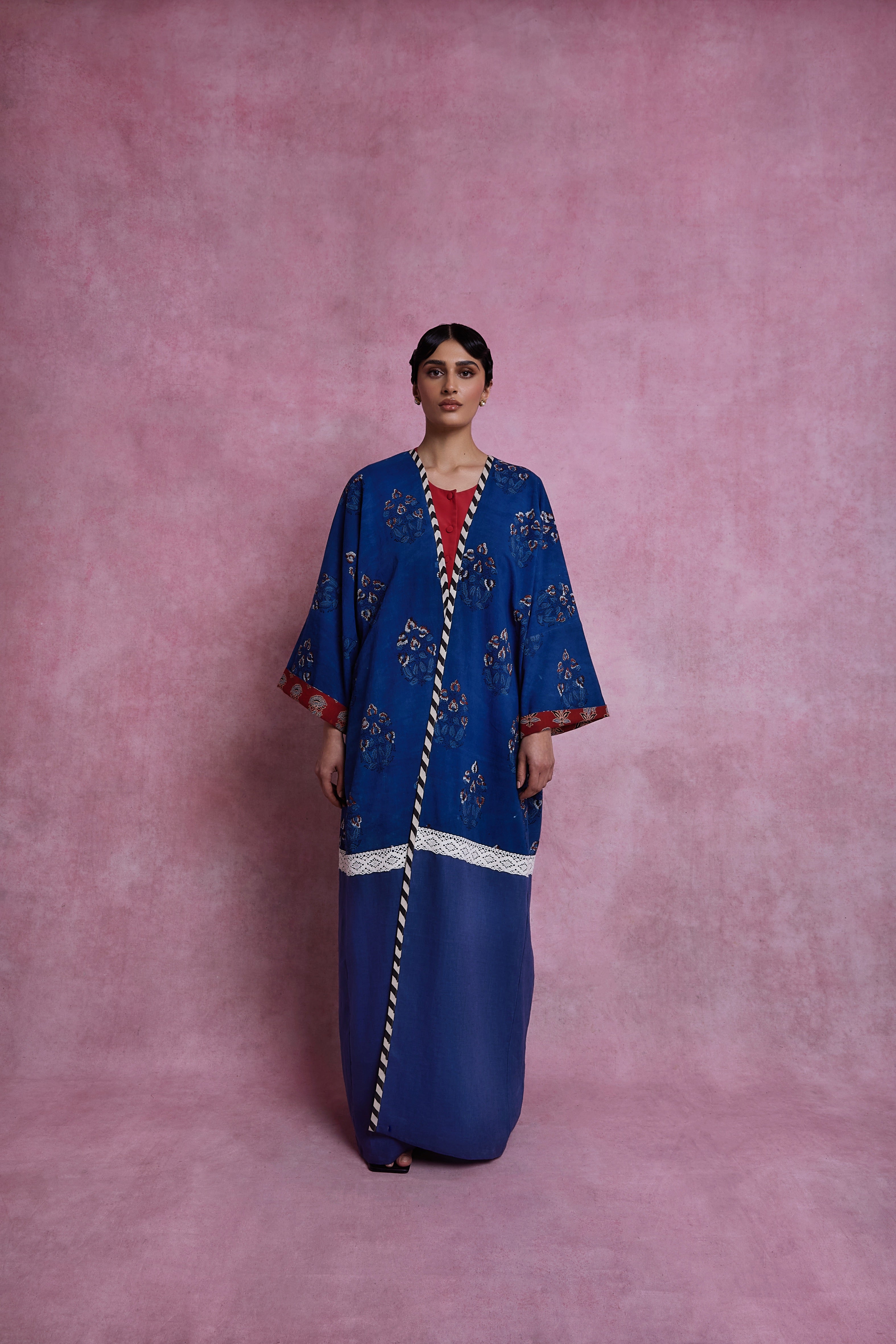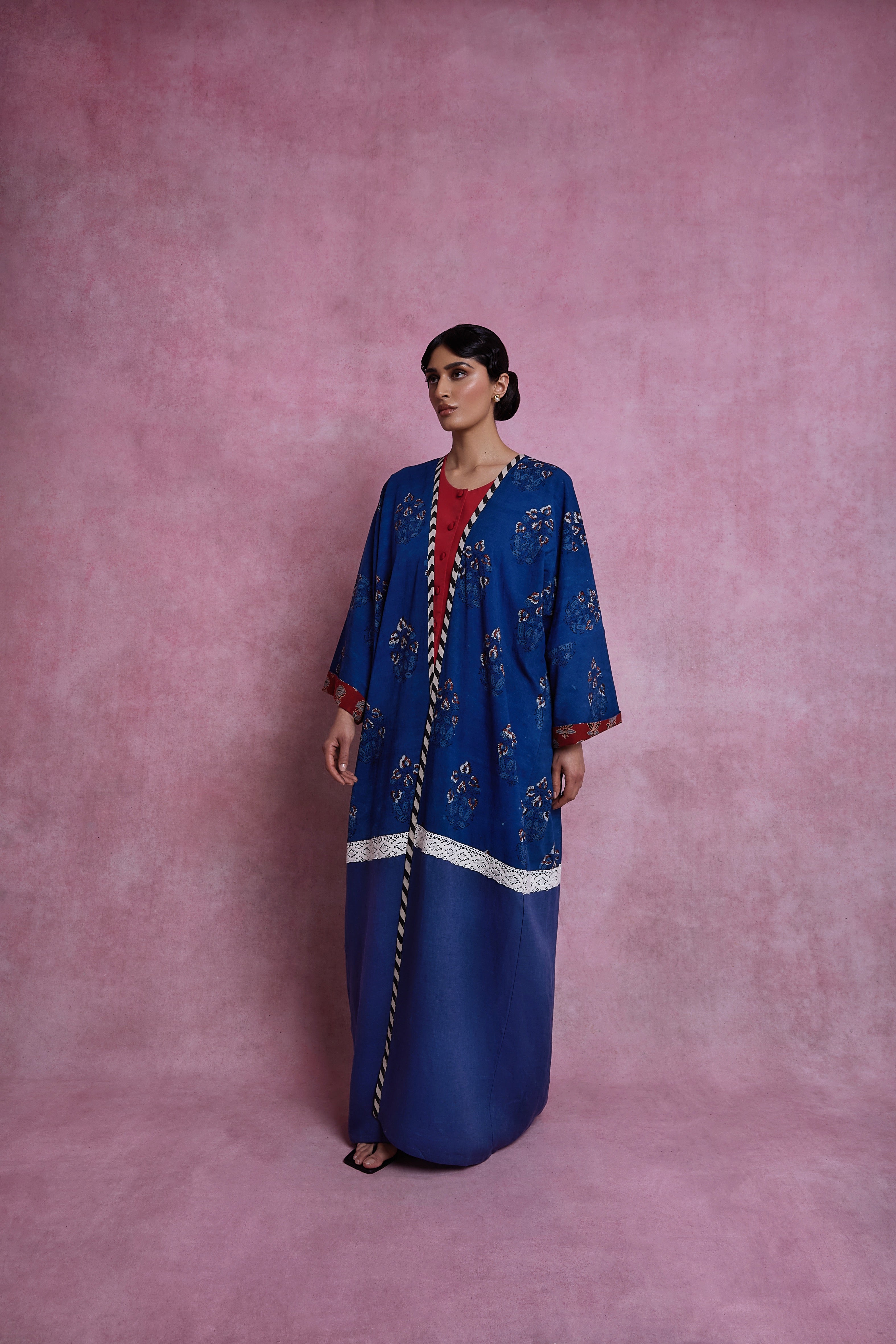 Indigo blue, hand woven and block printed abaya, combined with Italian linen. Finished with a vintage English lace - handmade over 30 years ago.