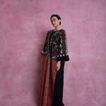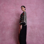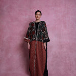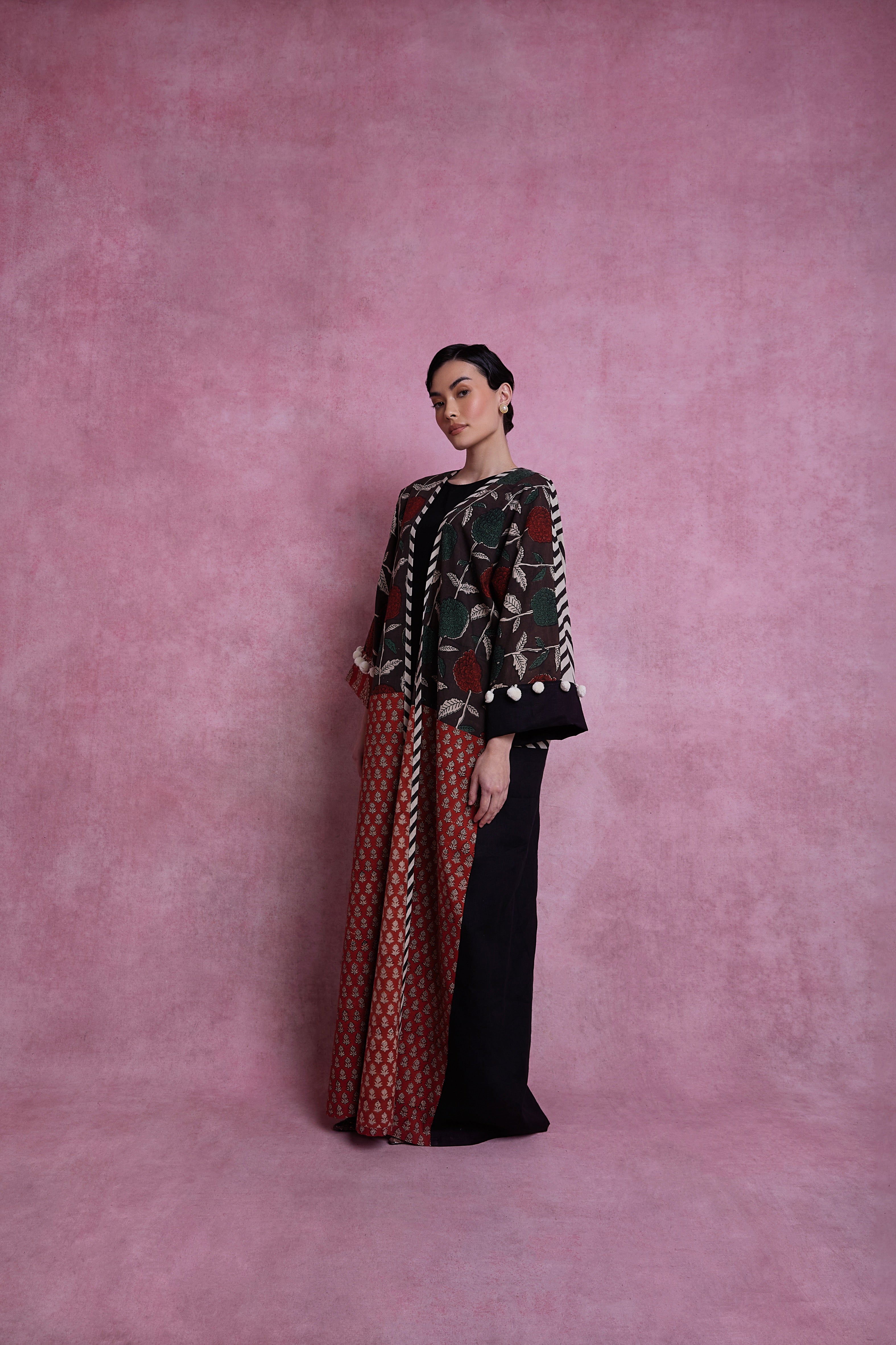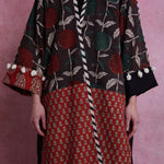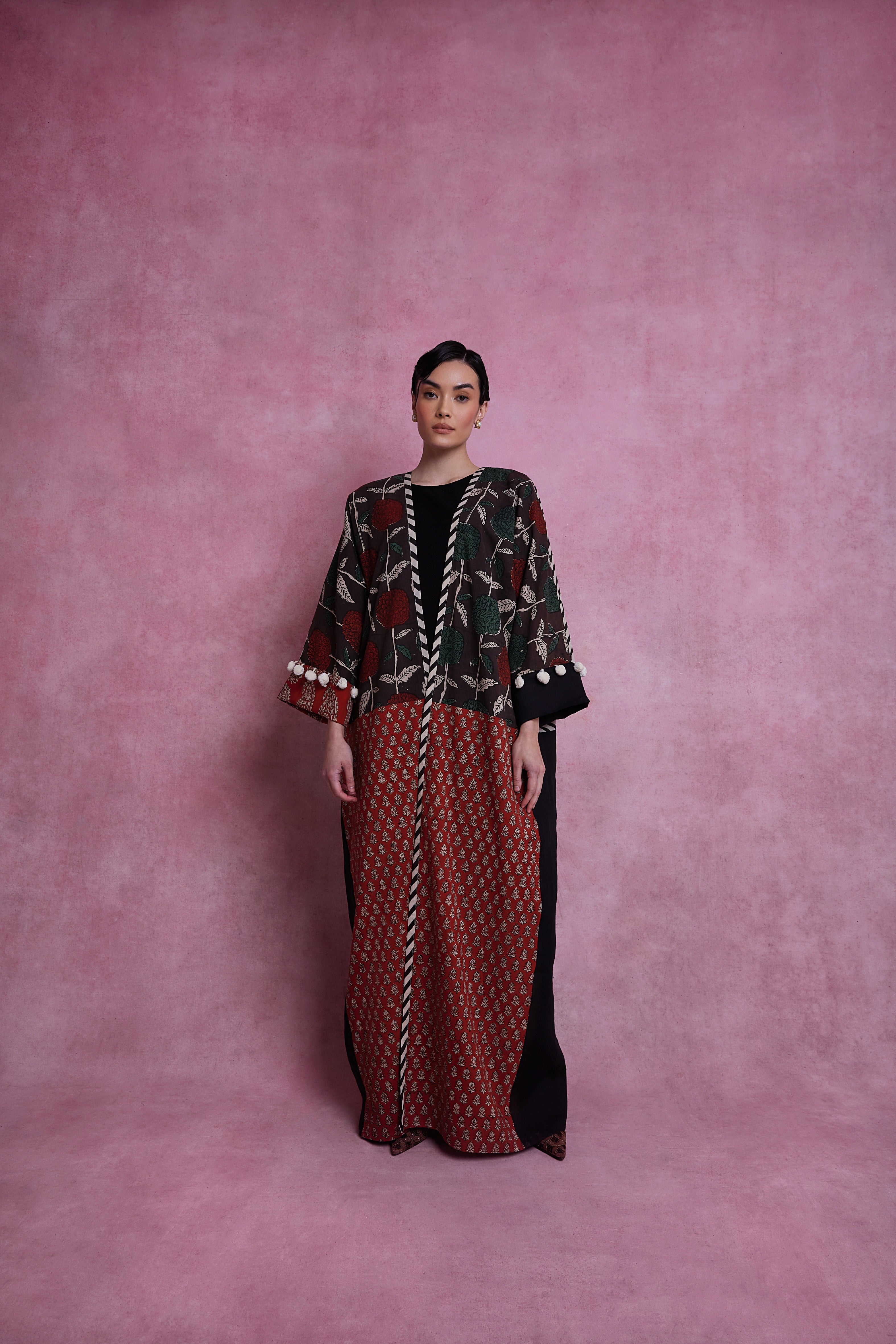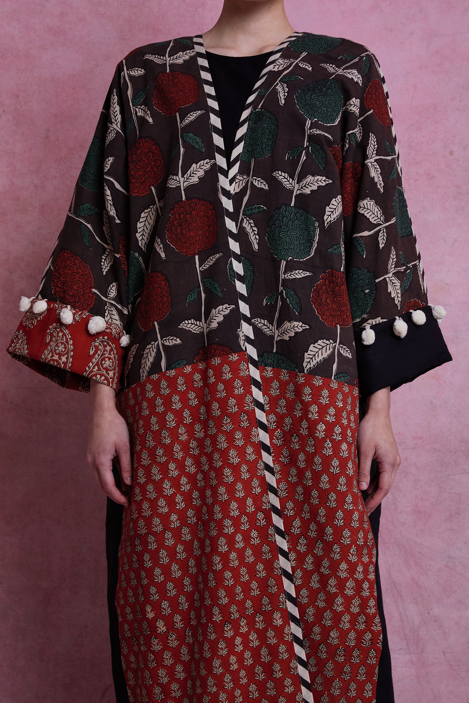Hand woven and block printed abaya, combined with Italian linen. Finished with organic cotton pom-poms