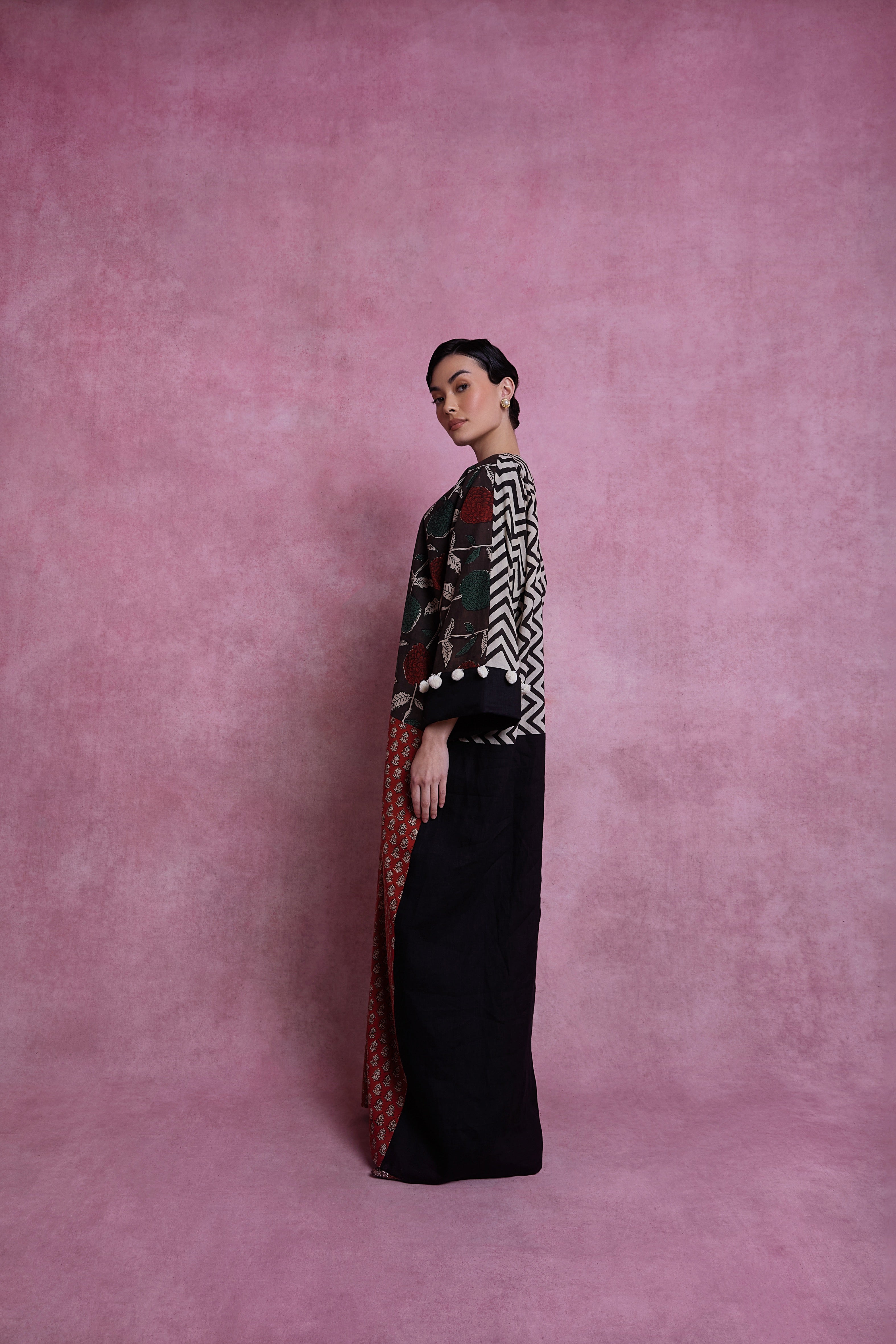 What we did: We have have specially hand selected all the components for this abaya. The front of the abaya is an Indian block print cotton - handcrafted without the use of any machinery, using ancient fabric making skills in India. The bottom part of the back is made using a fine Italian linen. The pom-poms used at the cuffs are made from organic cotton and in their natural colour, without any beaching or process.