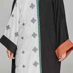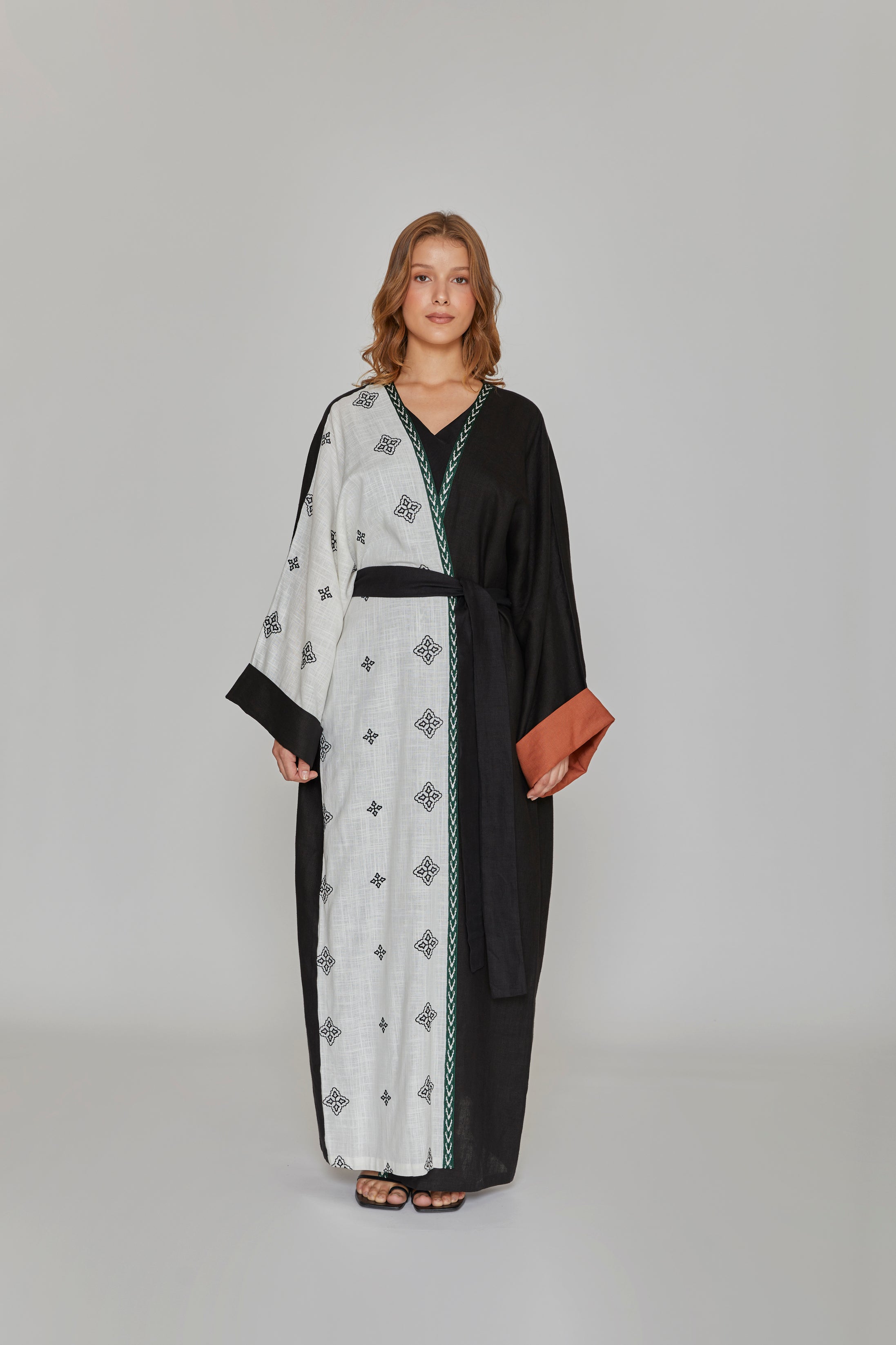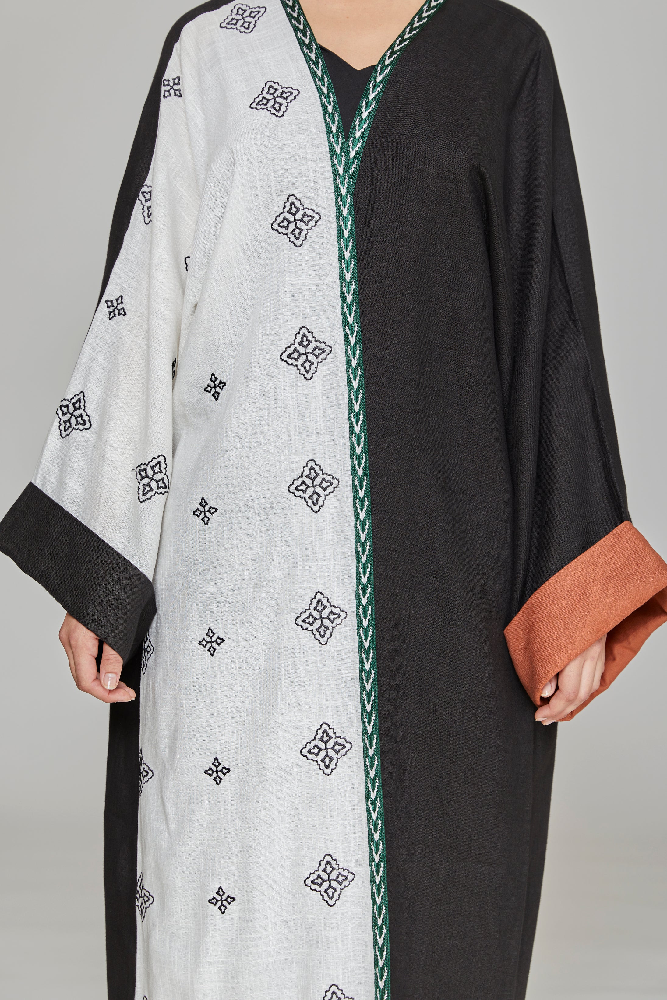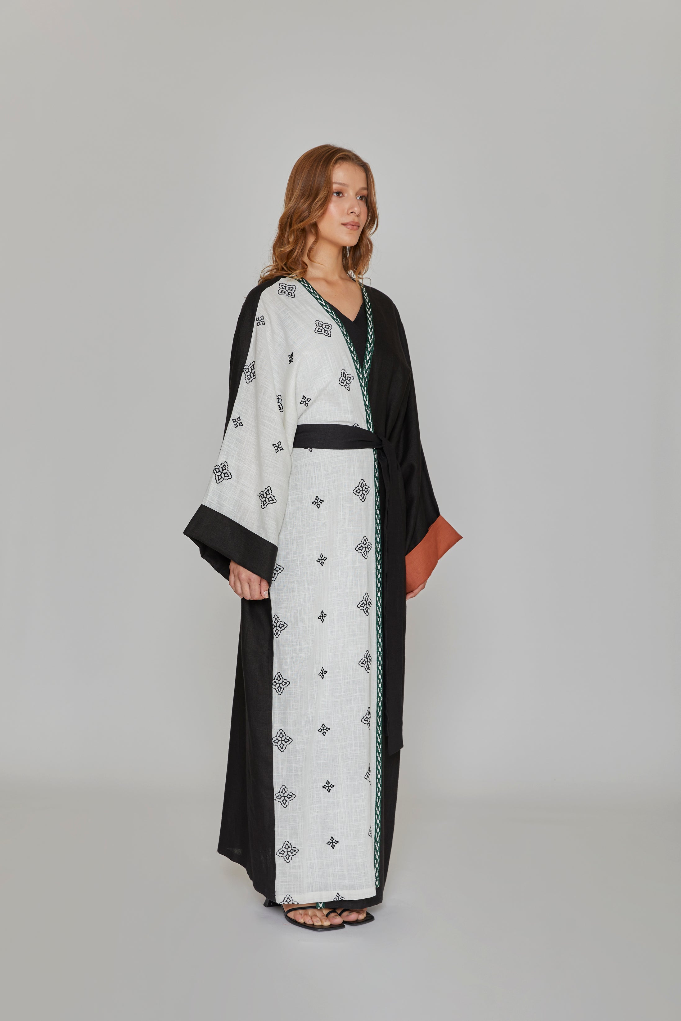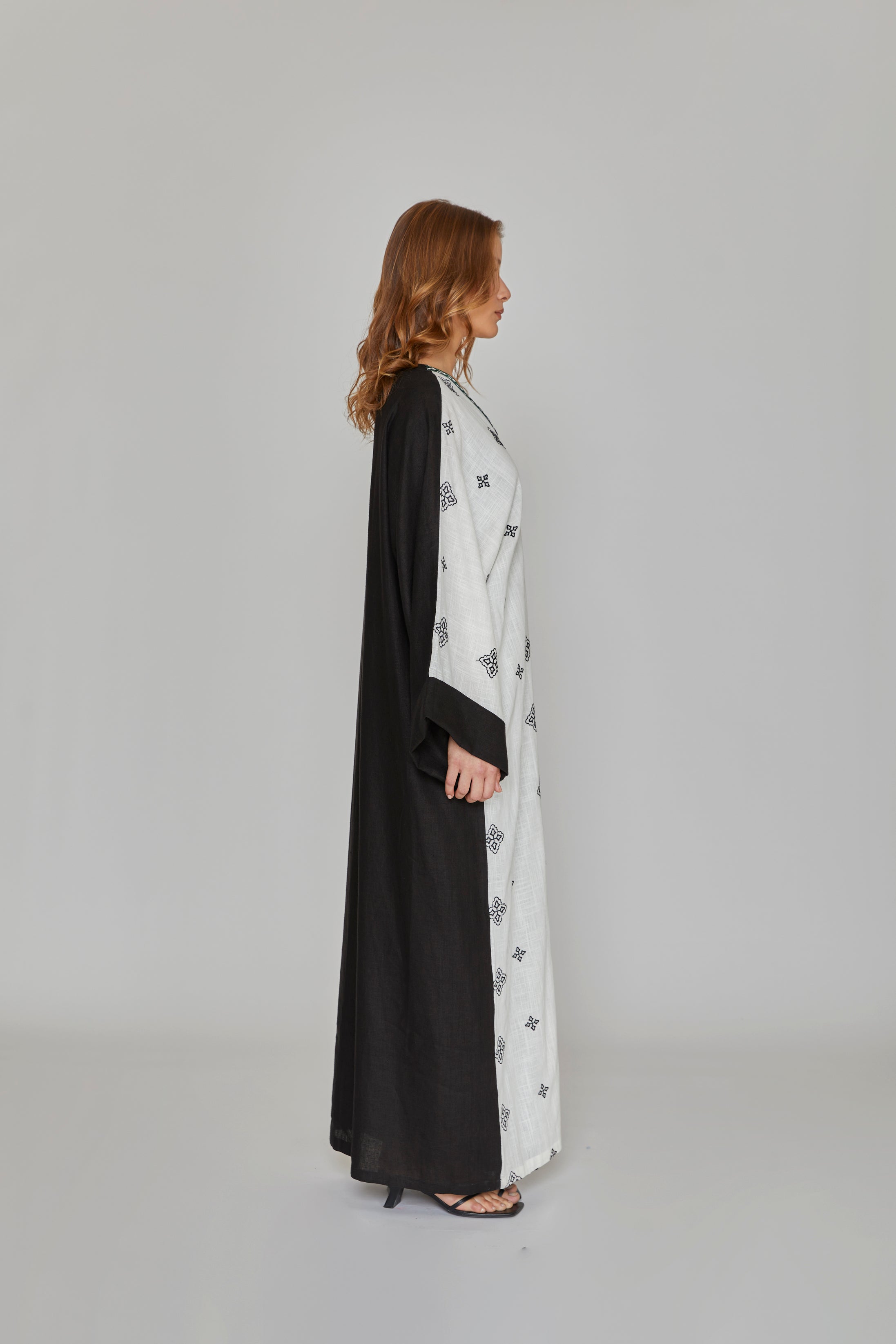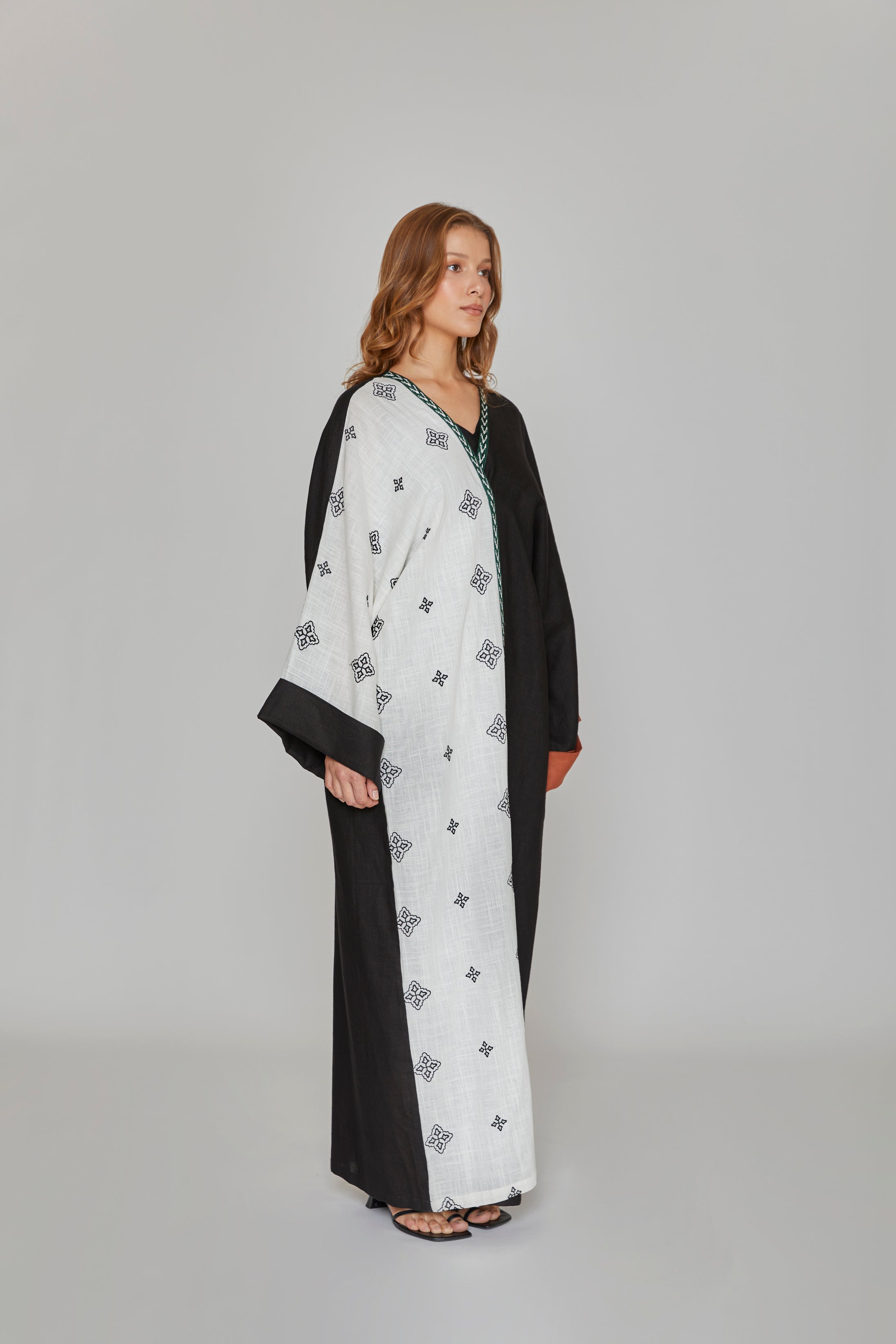 Special embroidered linen abaya with floral motifs, paired with Moroccan linen and finished with a traditional Moroccan sfifa trim.