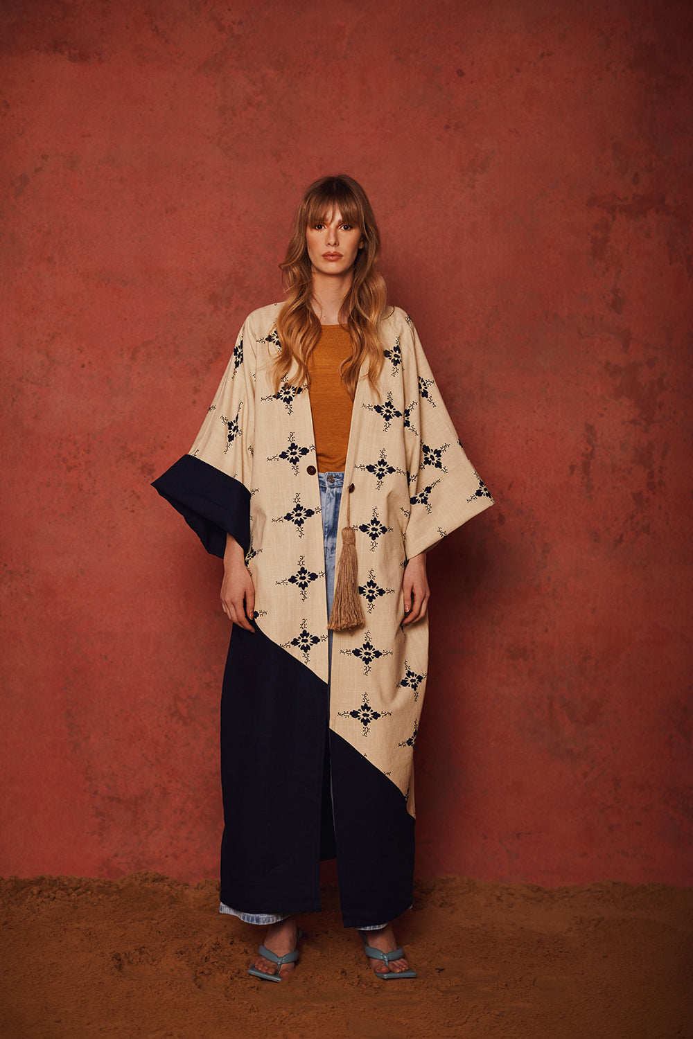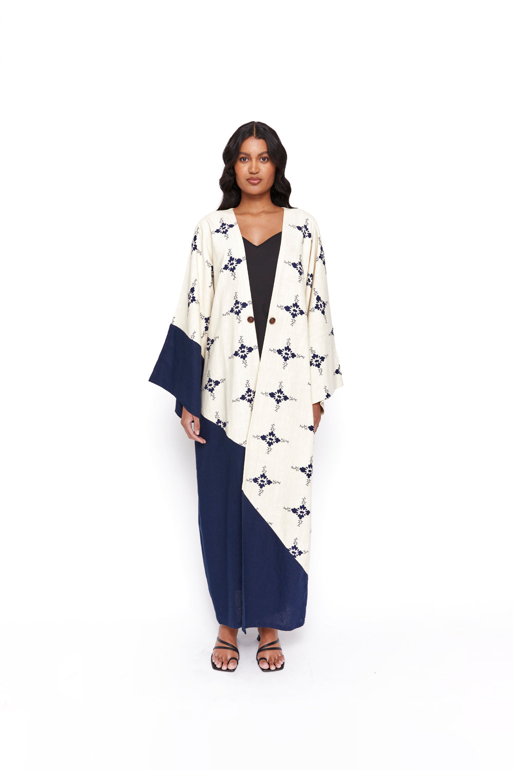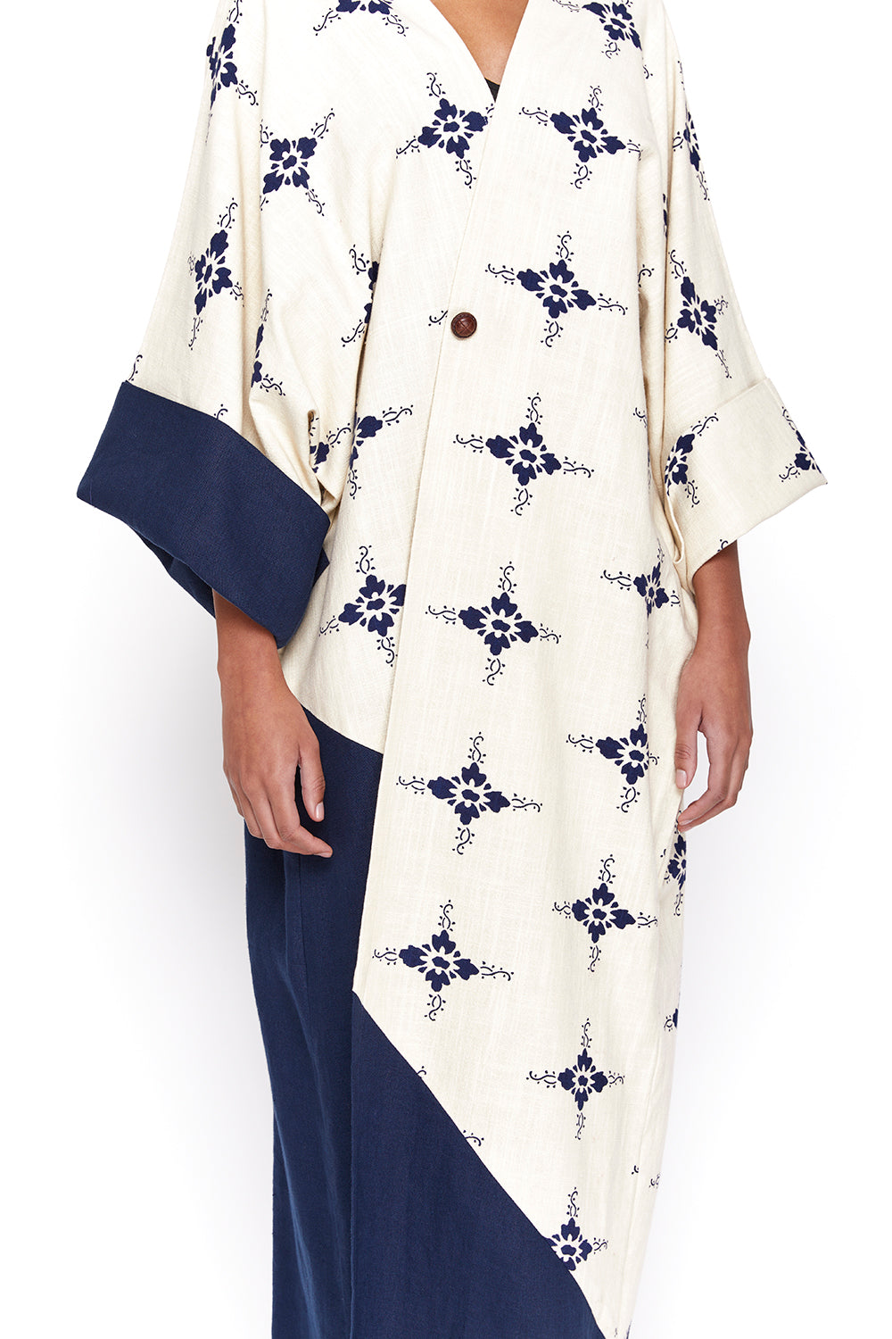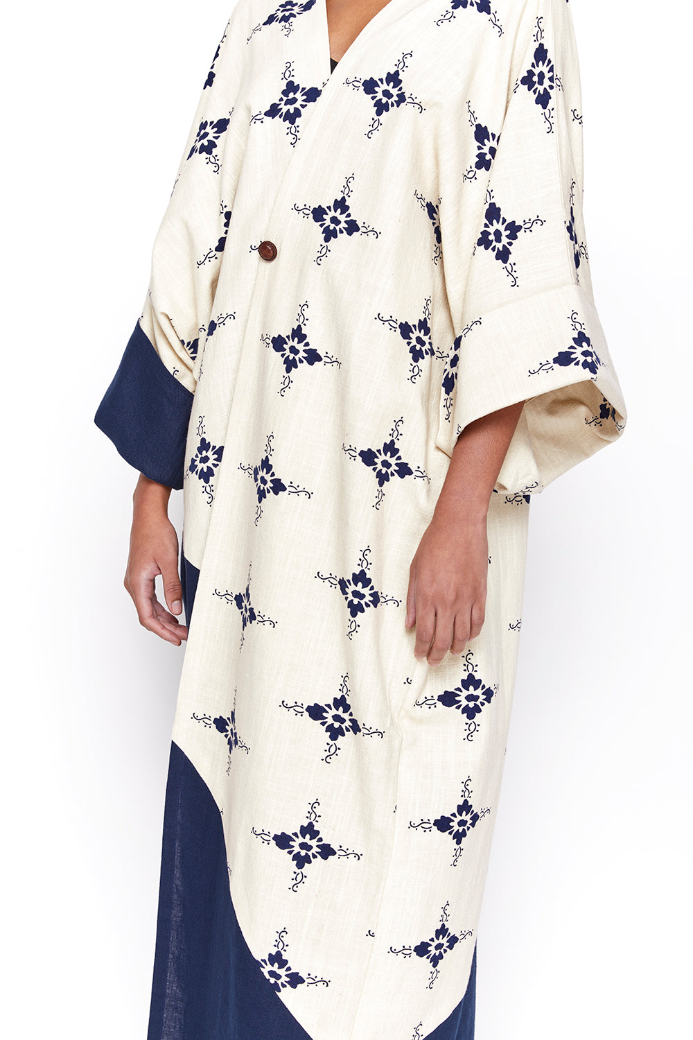 Hand screen printed Indian cotton and Japanese linen abaya. Finished with a jute tassel. Specially commissioned design, which was handprinted on a linen-like textured handwoven cotton in India.