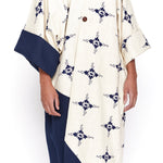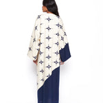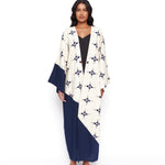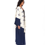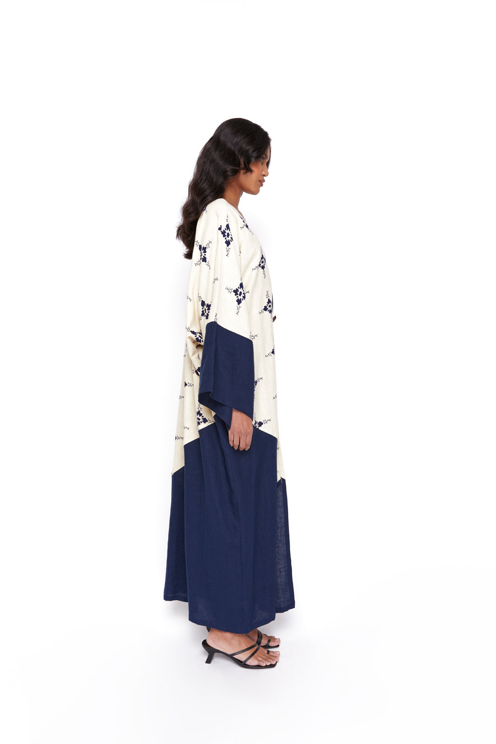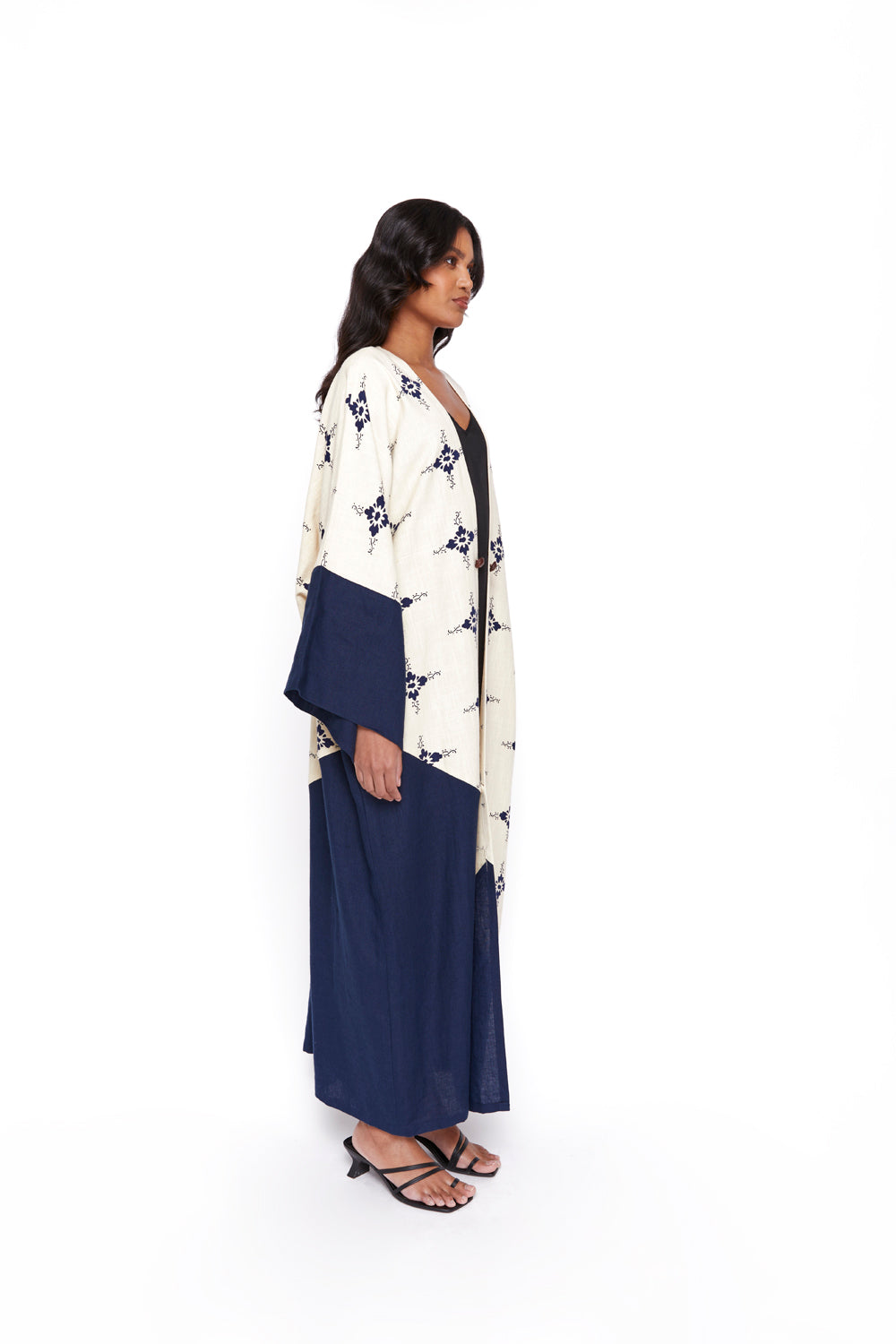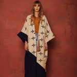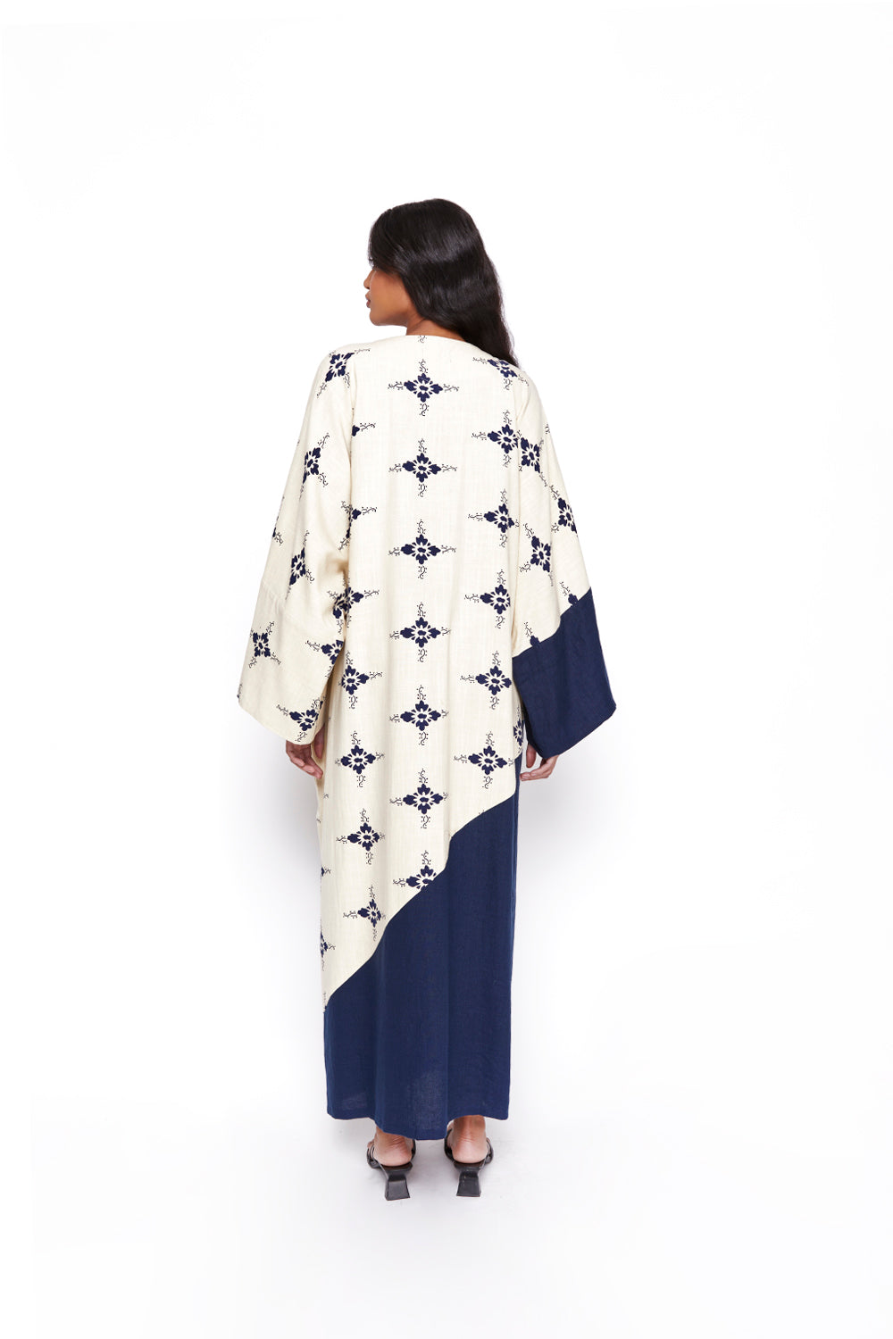 Hand screen printed Indian cotton and Japanese linen abaya. Finished with a jute tassel. Specially commissioned design, which was handprinted on a linen-like textured handwoven cotton in India.