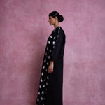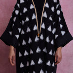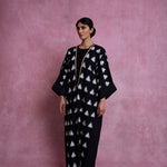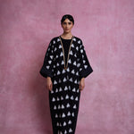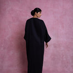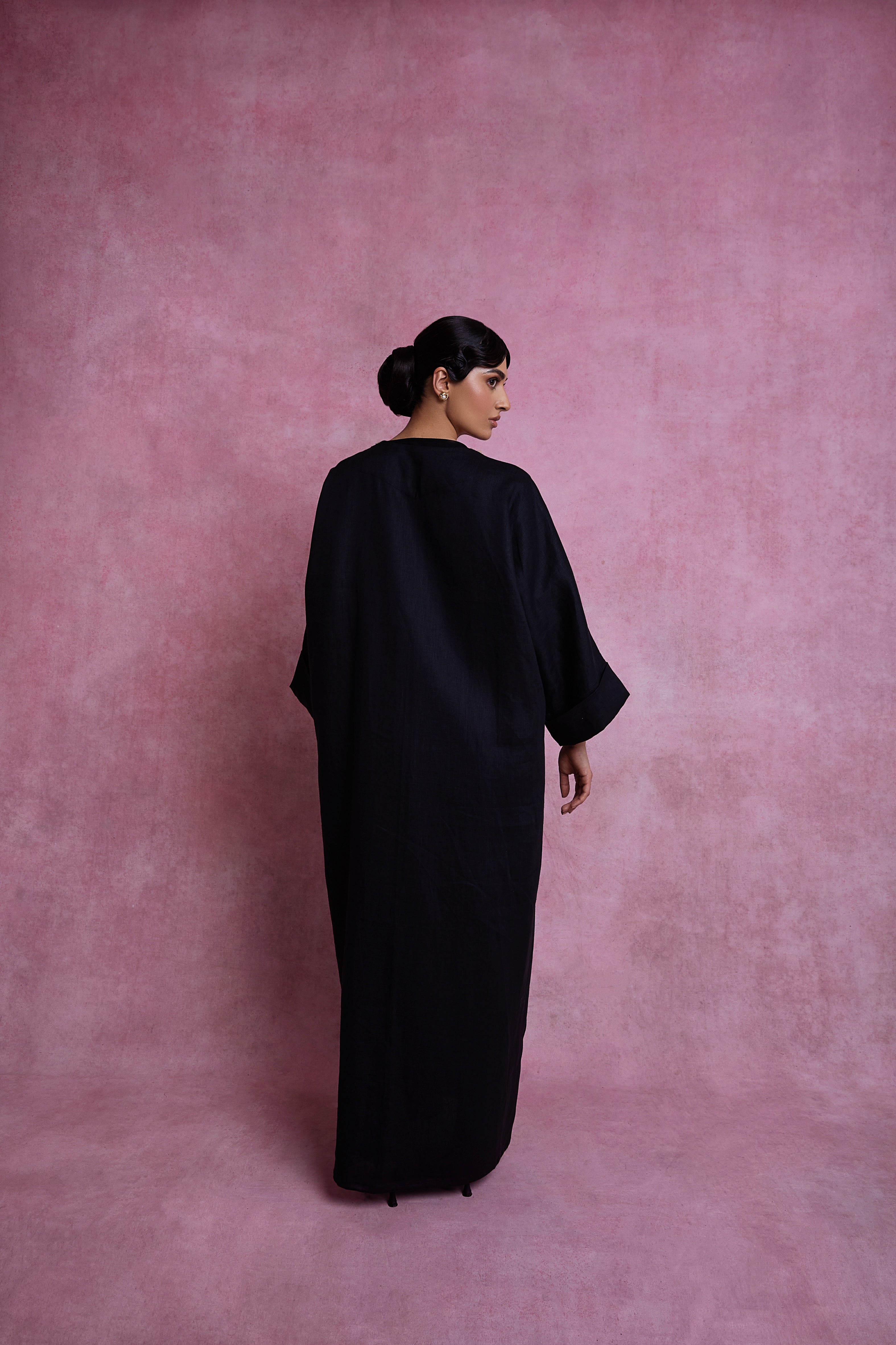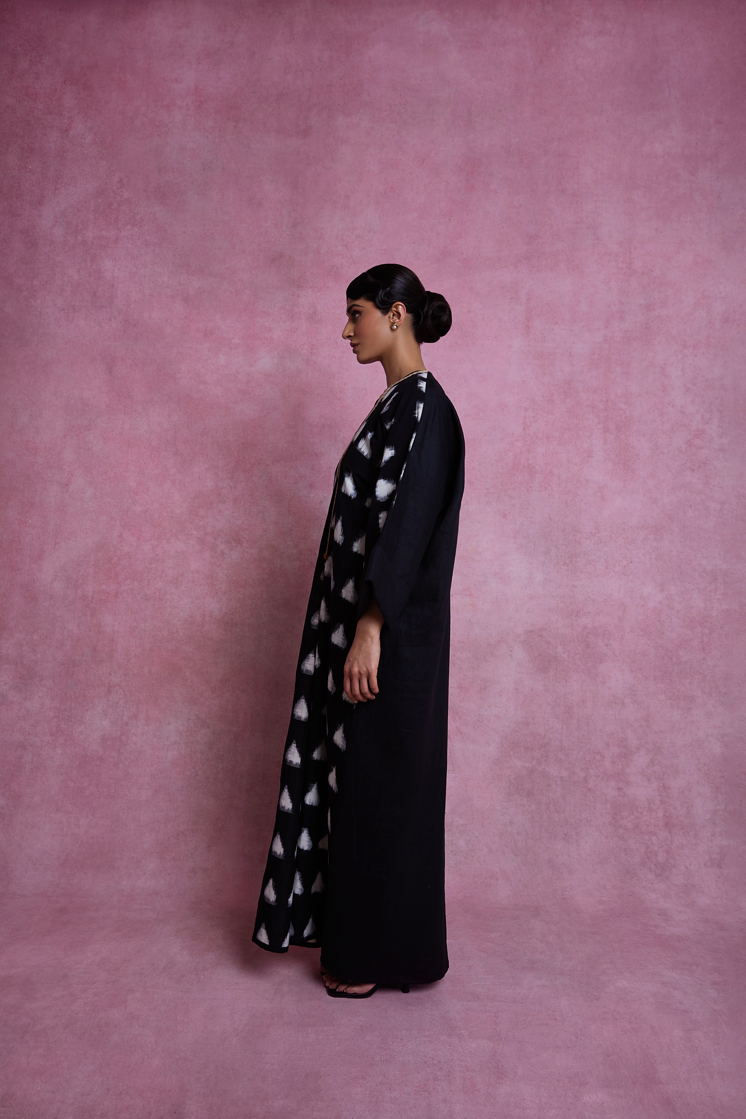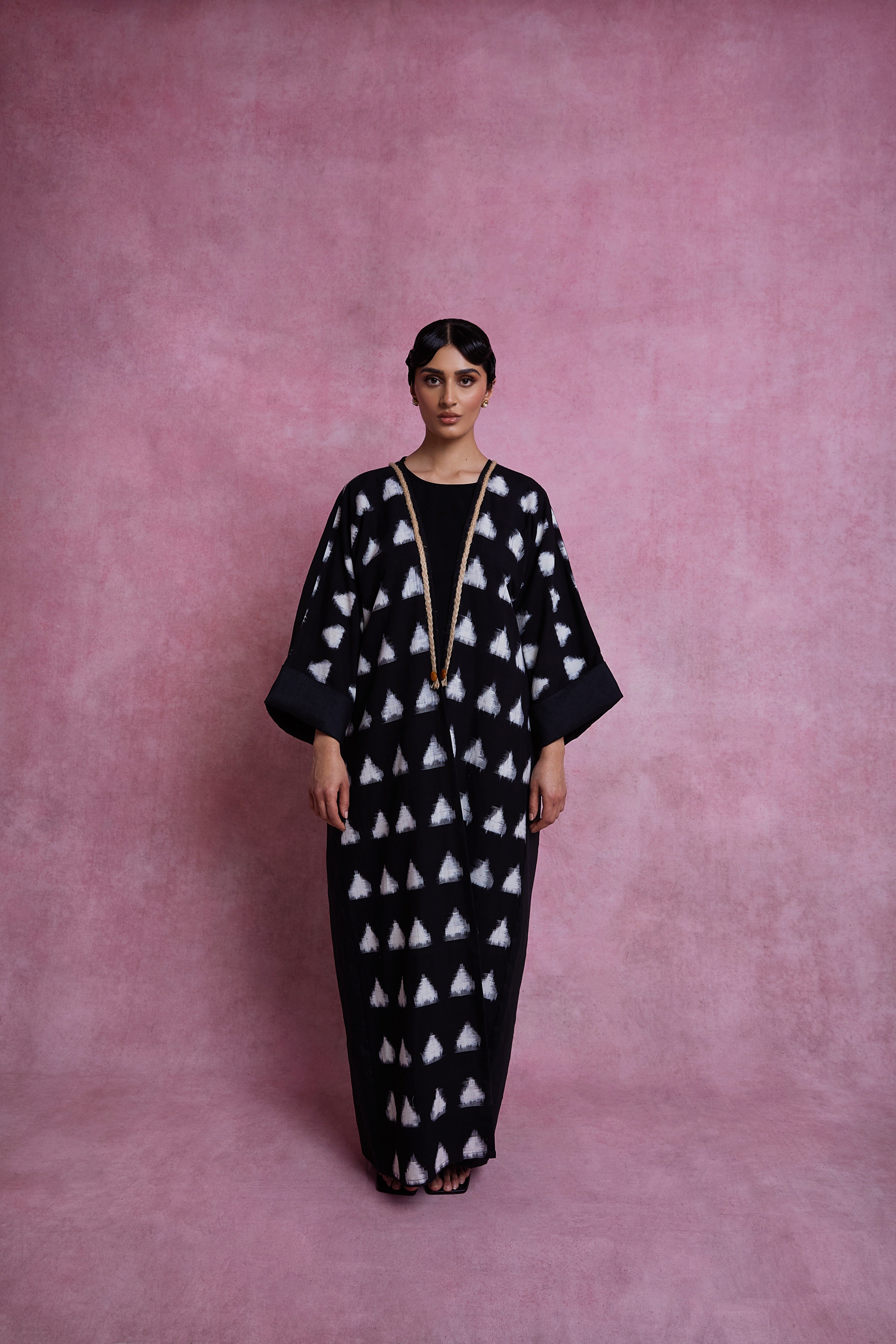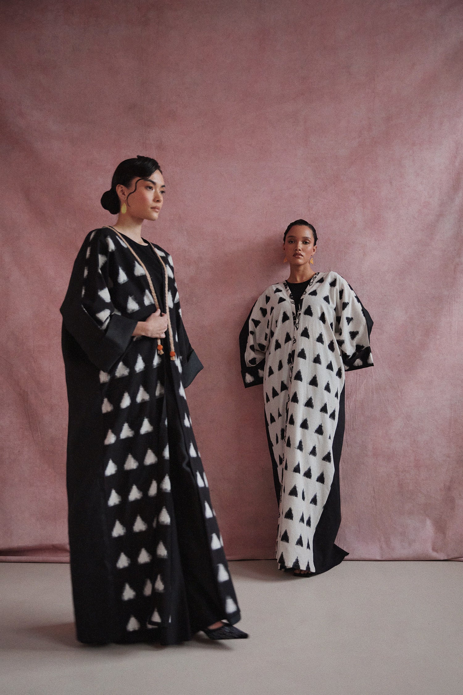 This soft and lightweight IKAT abaya is paired with Italian linen and finshed with a jute trim on the opening and vintage buttons.