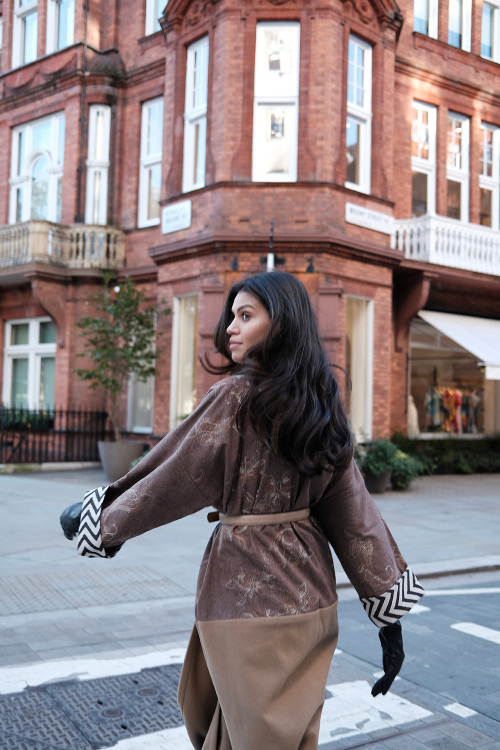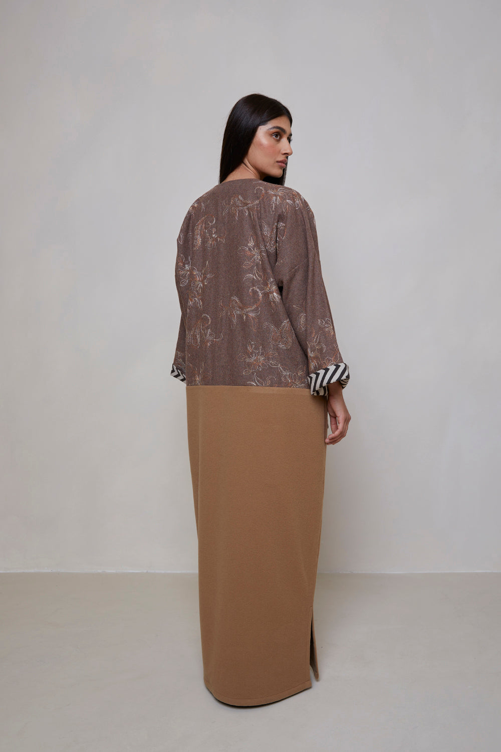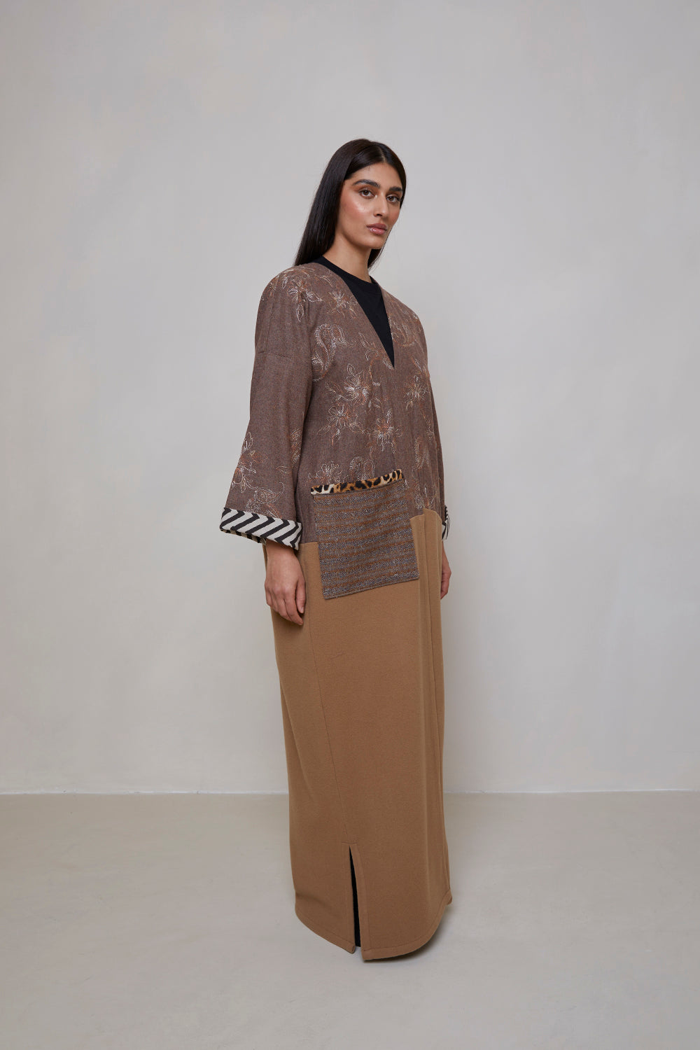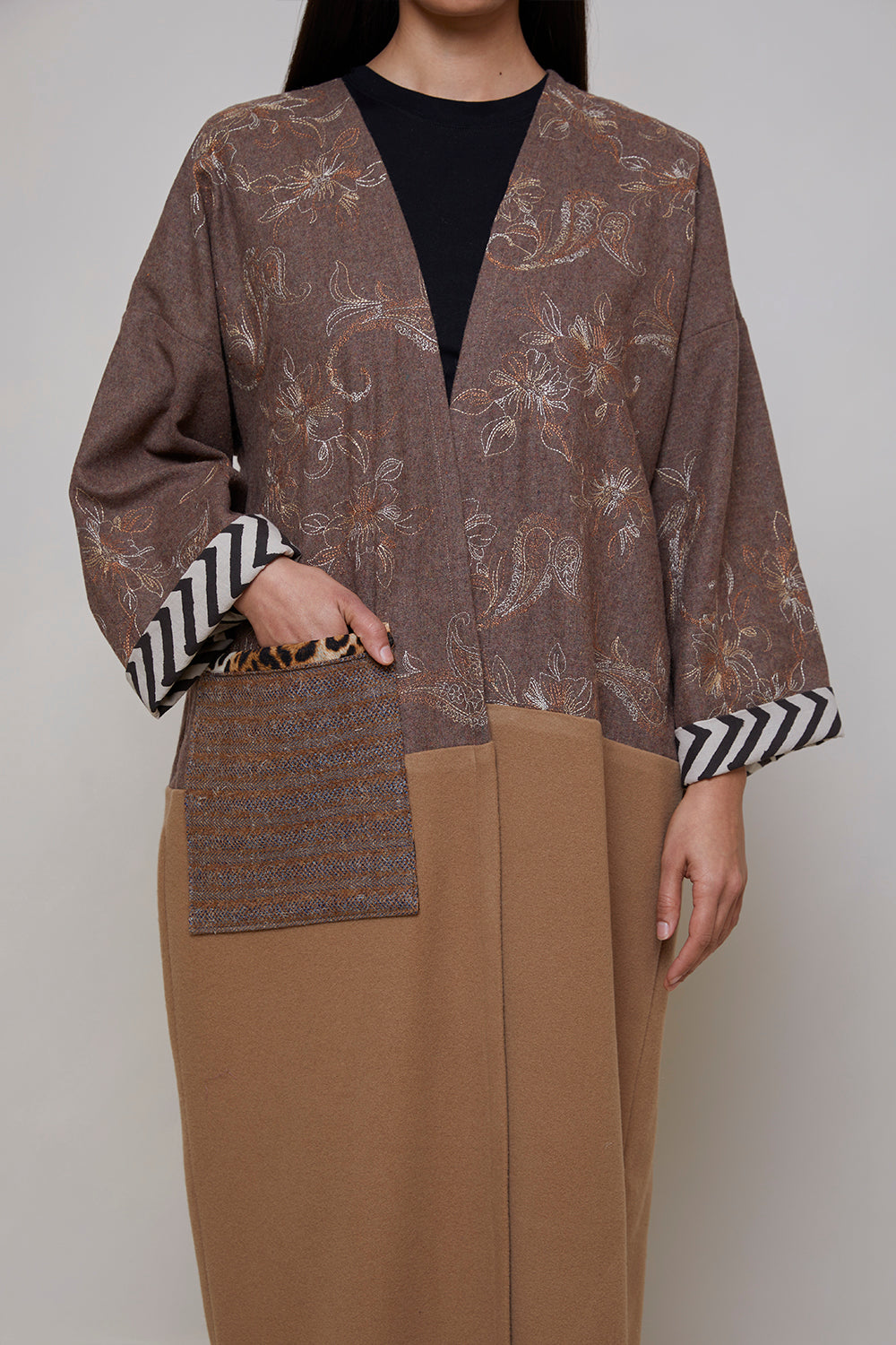 Half embroidered wool and half soft brushed wool abaya withBritish home-grown wool pocket.  Finished with Indian block printed cotton cuff facings.