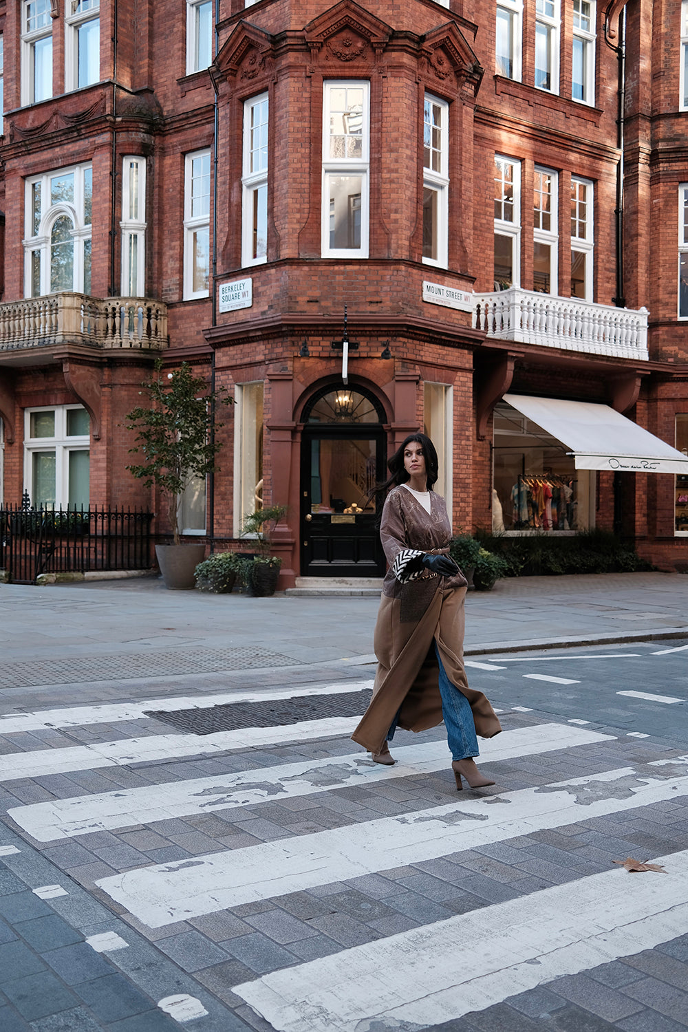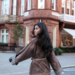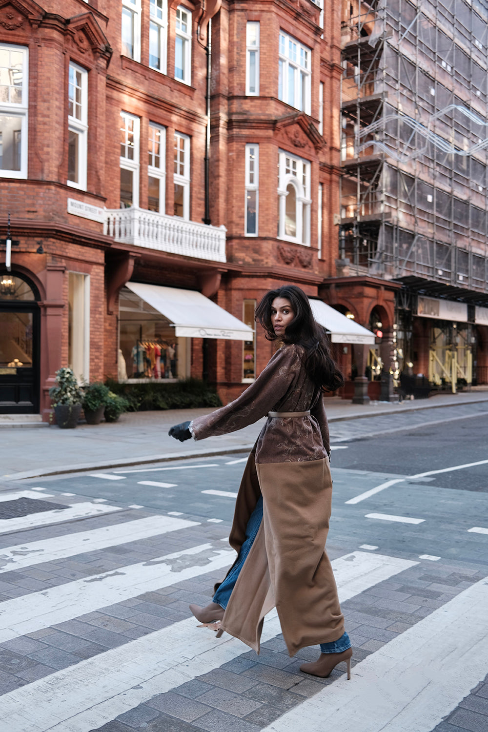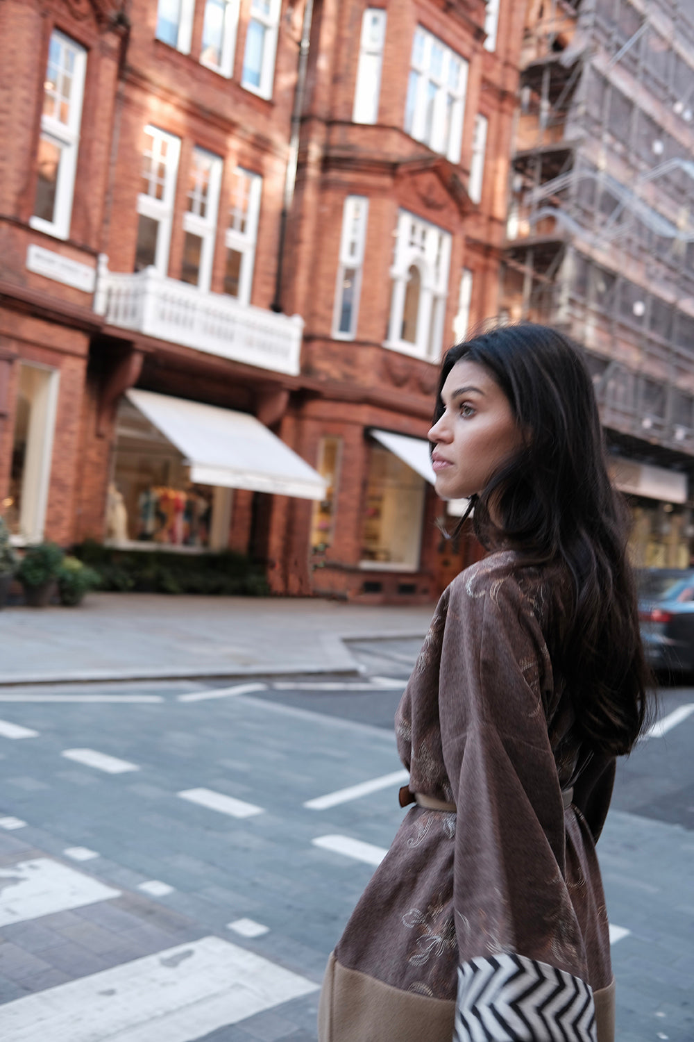 Half embroidered wool and half soft brushed wool abaya withBritish home-grown wool pocket.  Finished with Indian block printed cotton cuff facings.