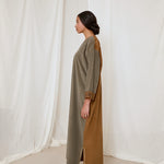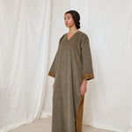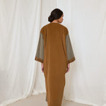 Cotton corduroy kaftan dress, finished with vintage pashmina cuff details, and metal vintage trim at the hem.