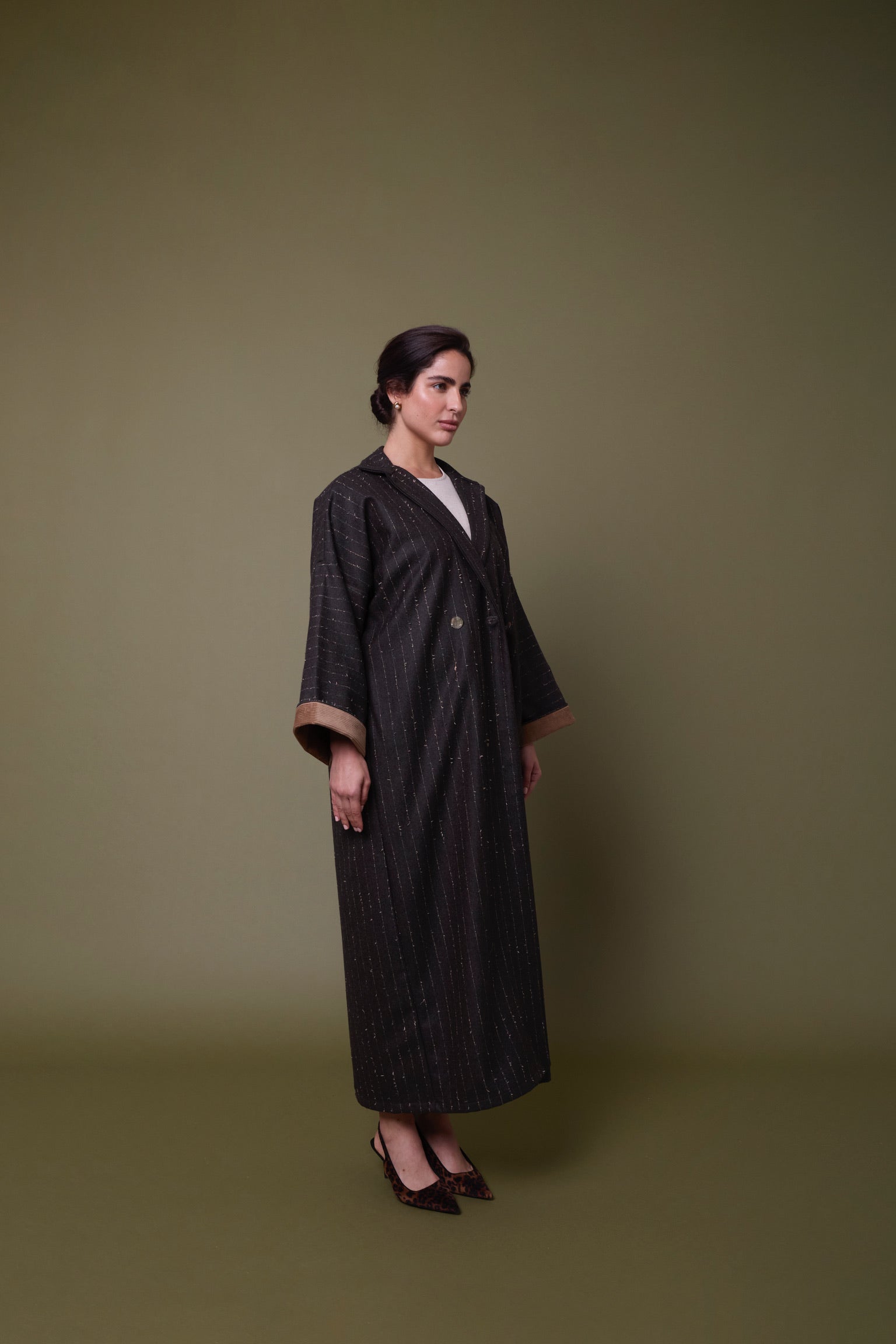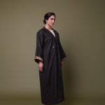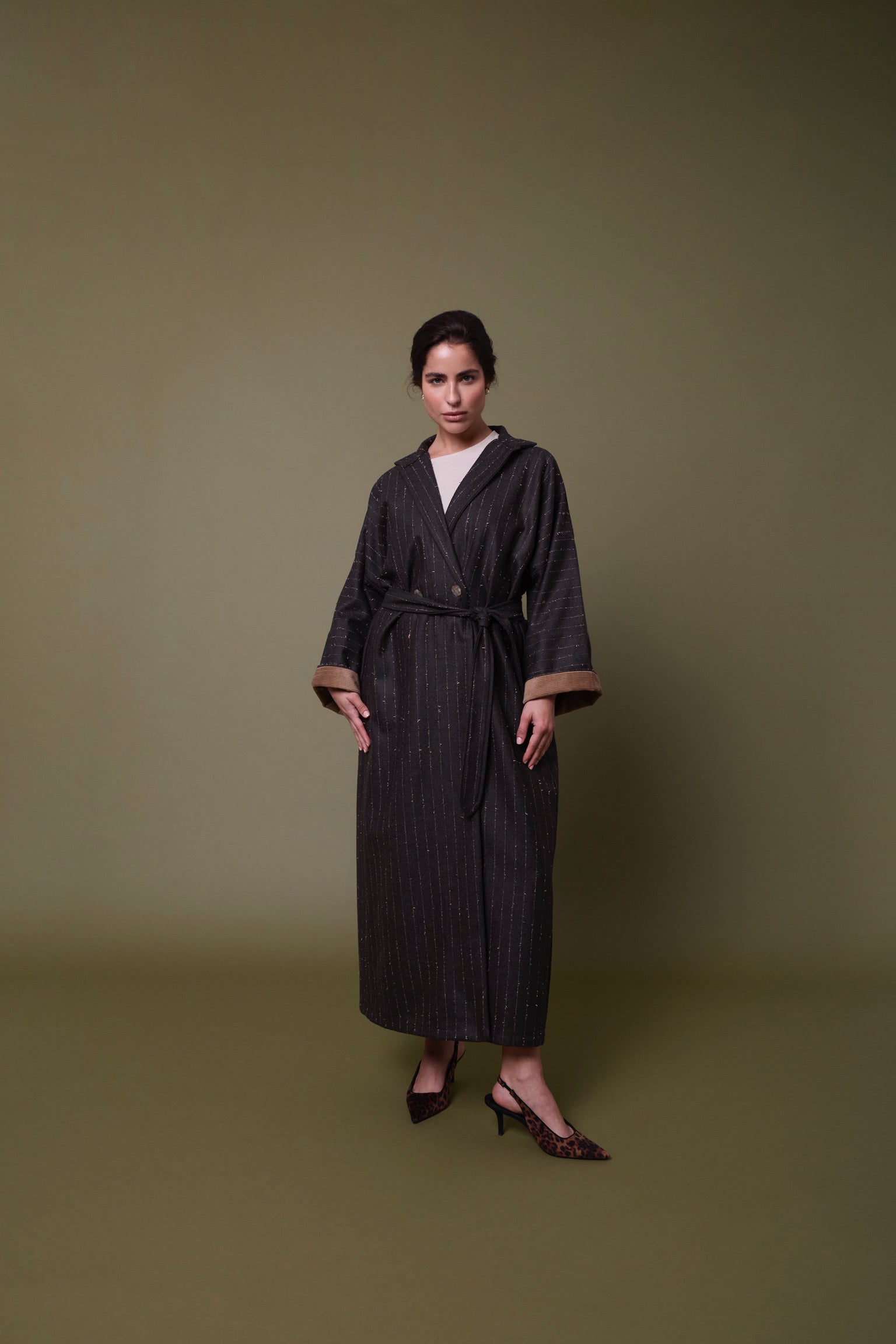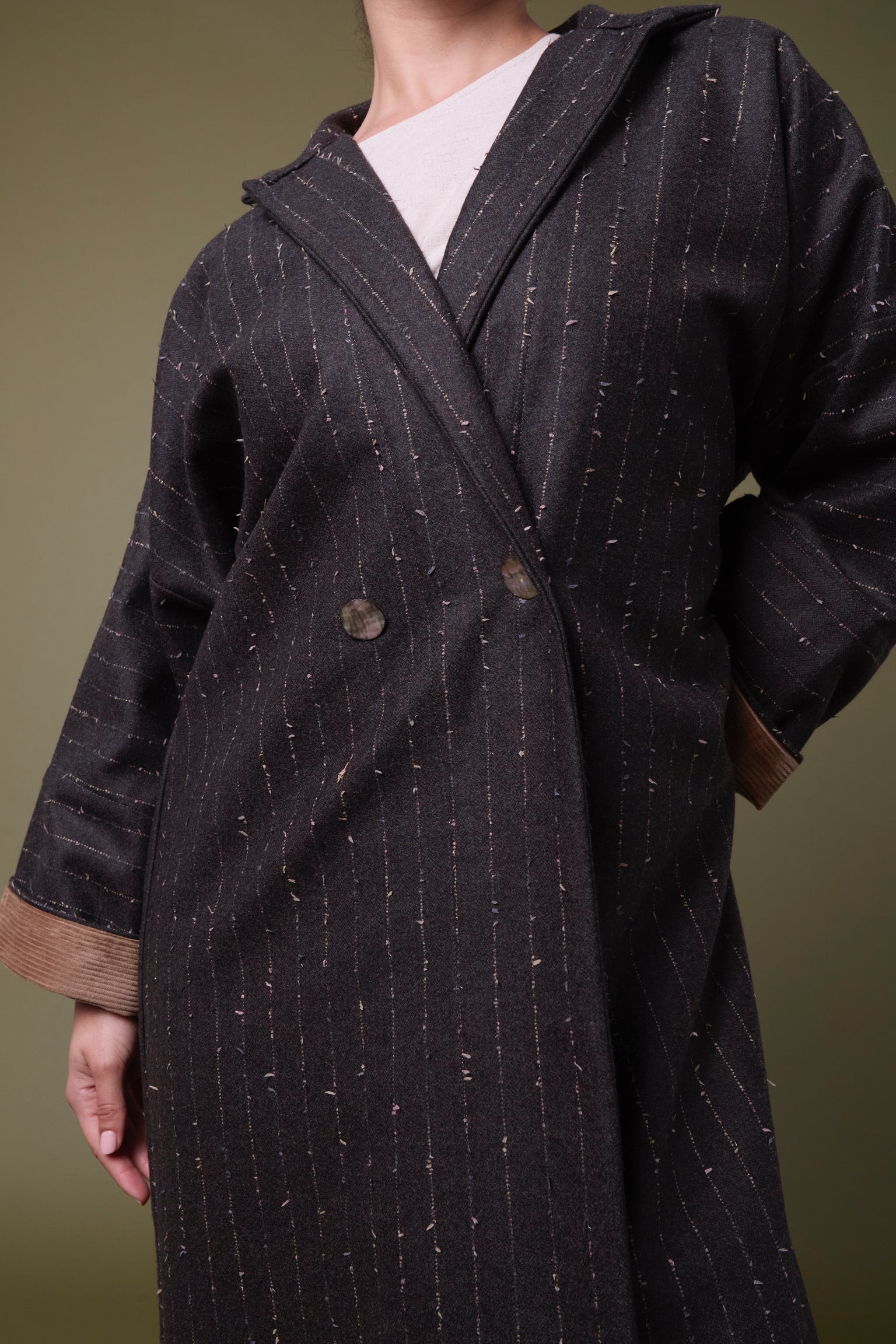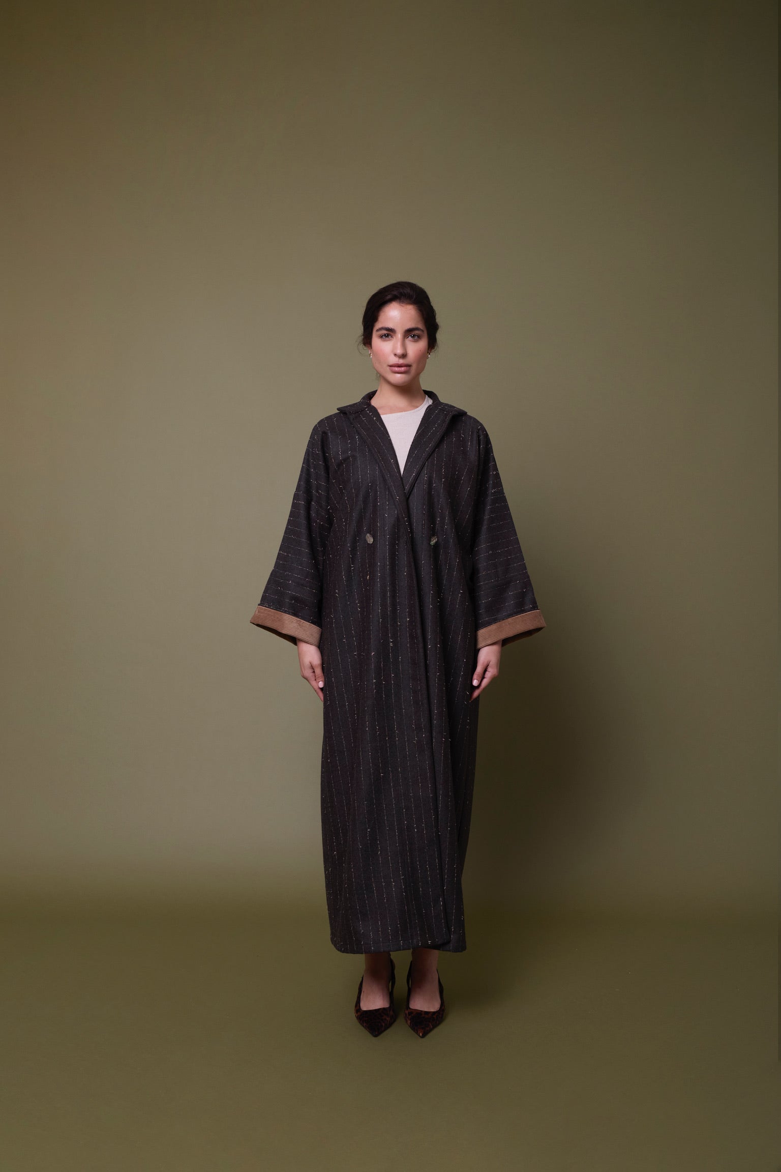 Double breasted coat abaya, handcrafted in a textured stripe wool. Finished with cotton corduroy cuffs and vintage oyster shell buttons, fastened with handmade buttonholes. This coat abaya comes with a belt.