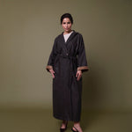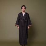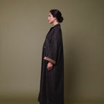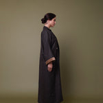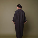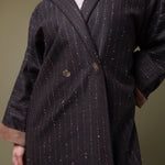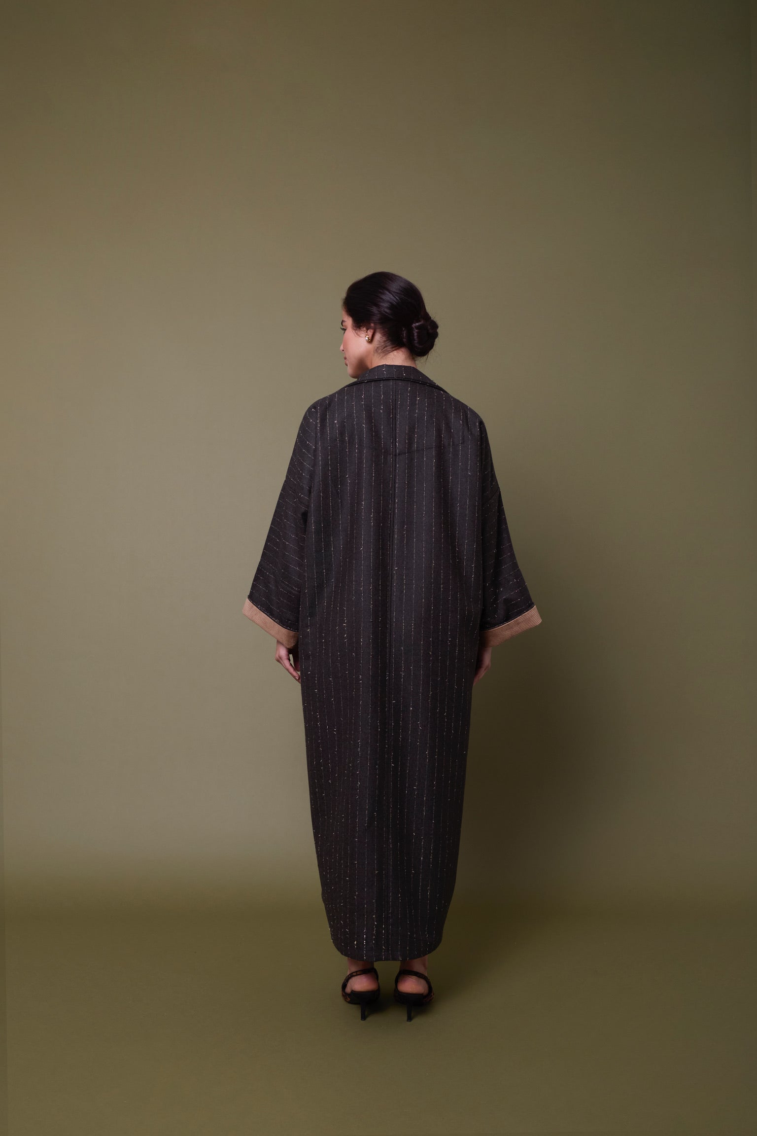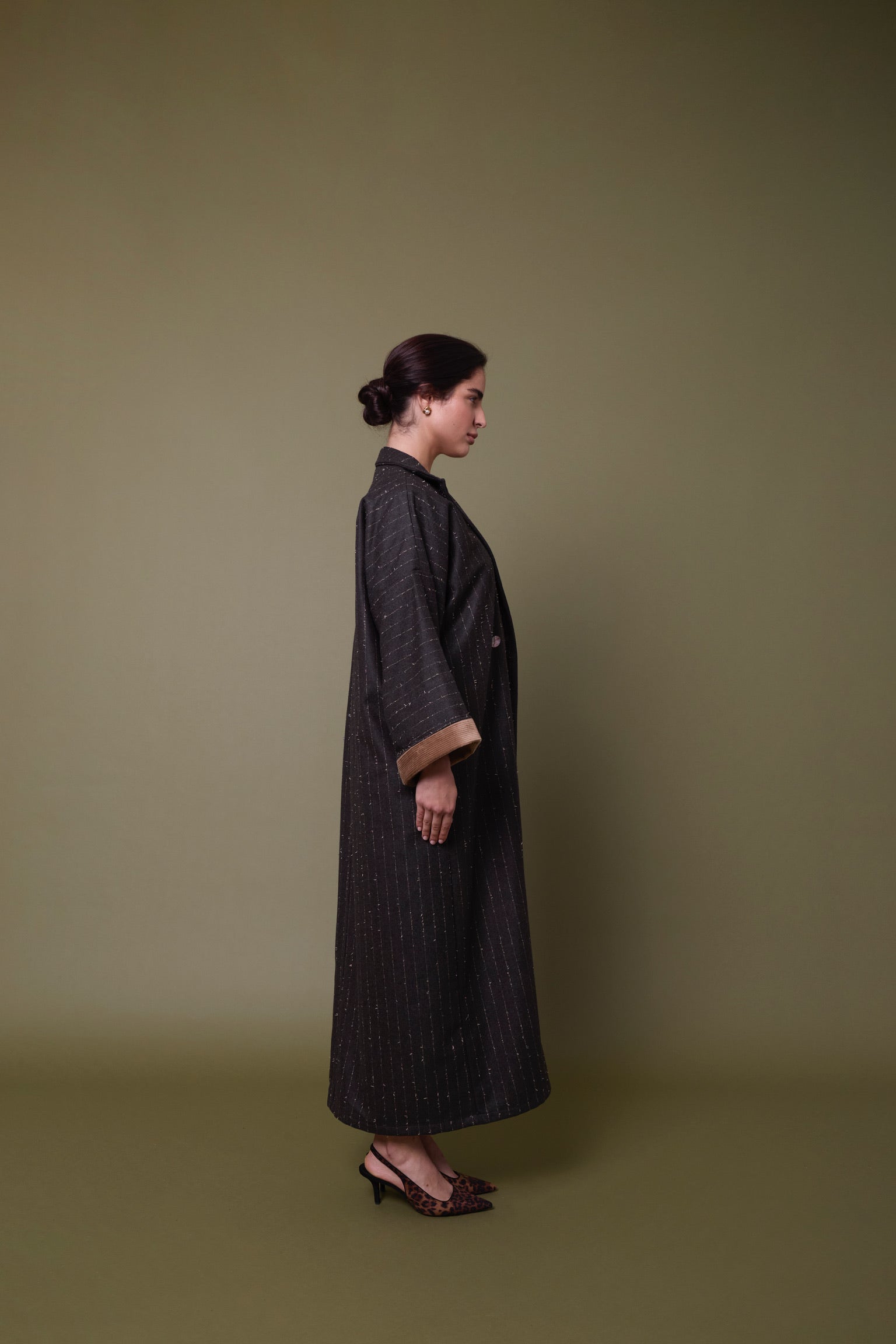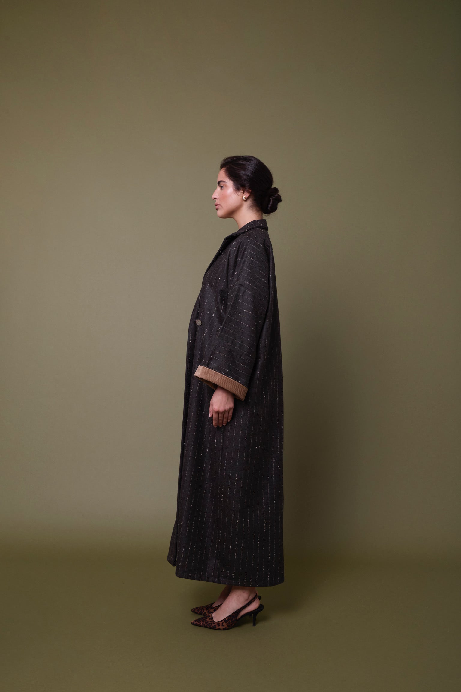 Double breasted coat abaya, handcrafted in a textured stripe wool. Finished with cotton corduroy cuffs and vintage oyster shell buttons, fastened with handmade buttonholes. This coat abaya comes with a belt.
