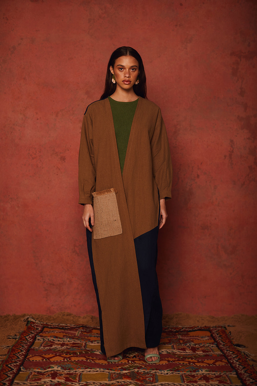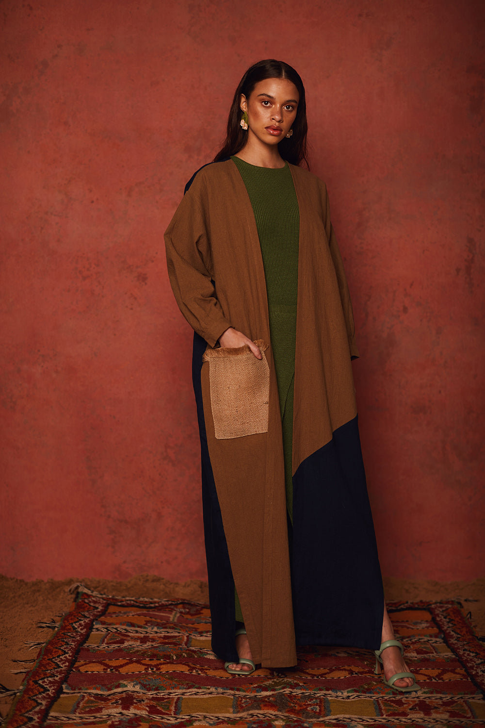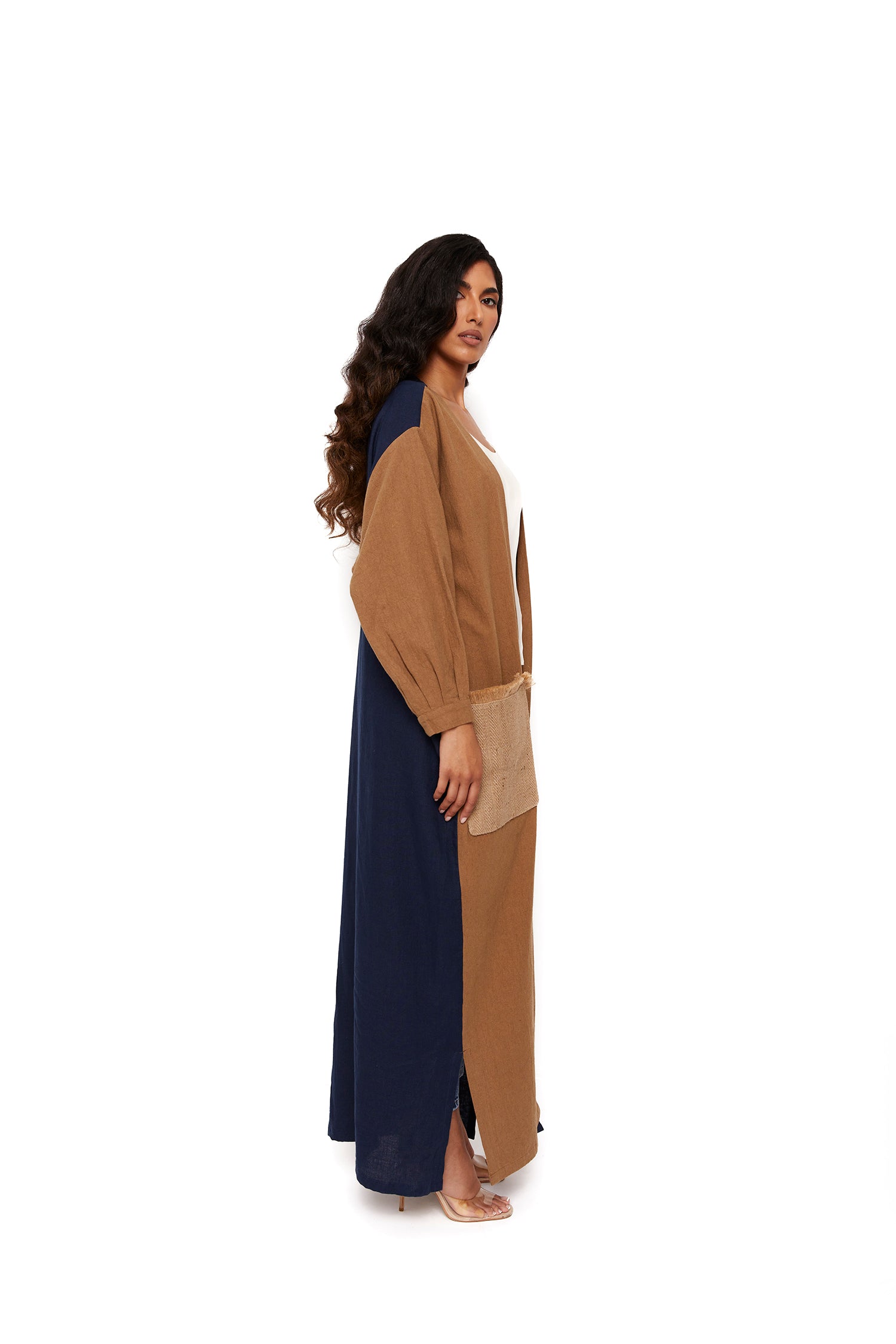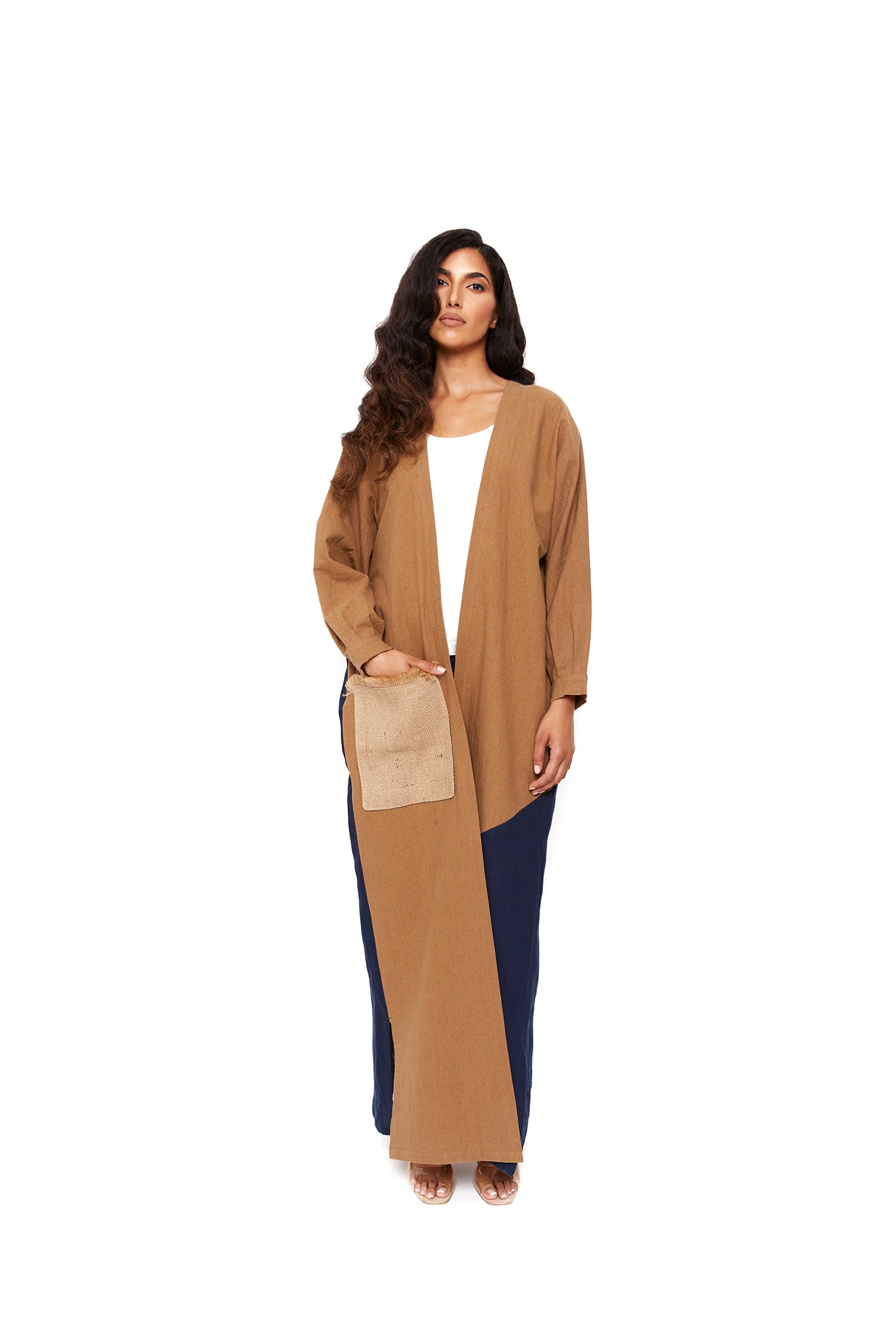 Playing with lines! This Japanese linen and cotton mix abaya has a washed finish with a brilliant crumpled texture and slightly faded colours. A soft canvas like fabric perfect to finish that casual chic look. Detailed with a hessian pocket