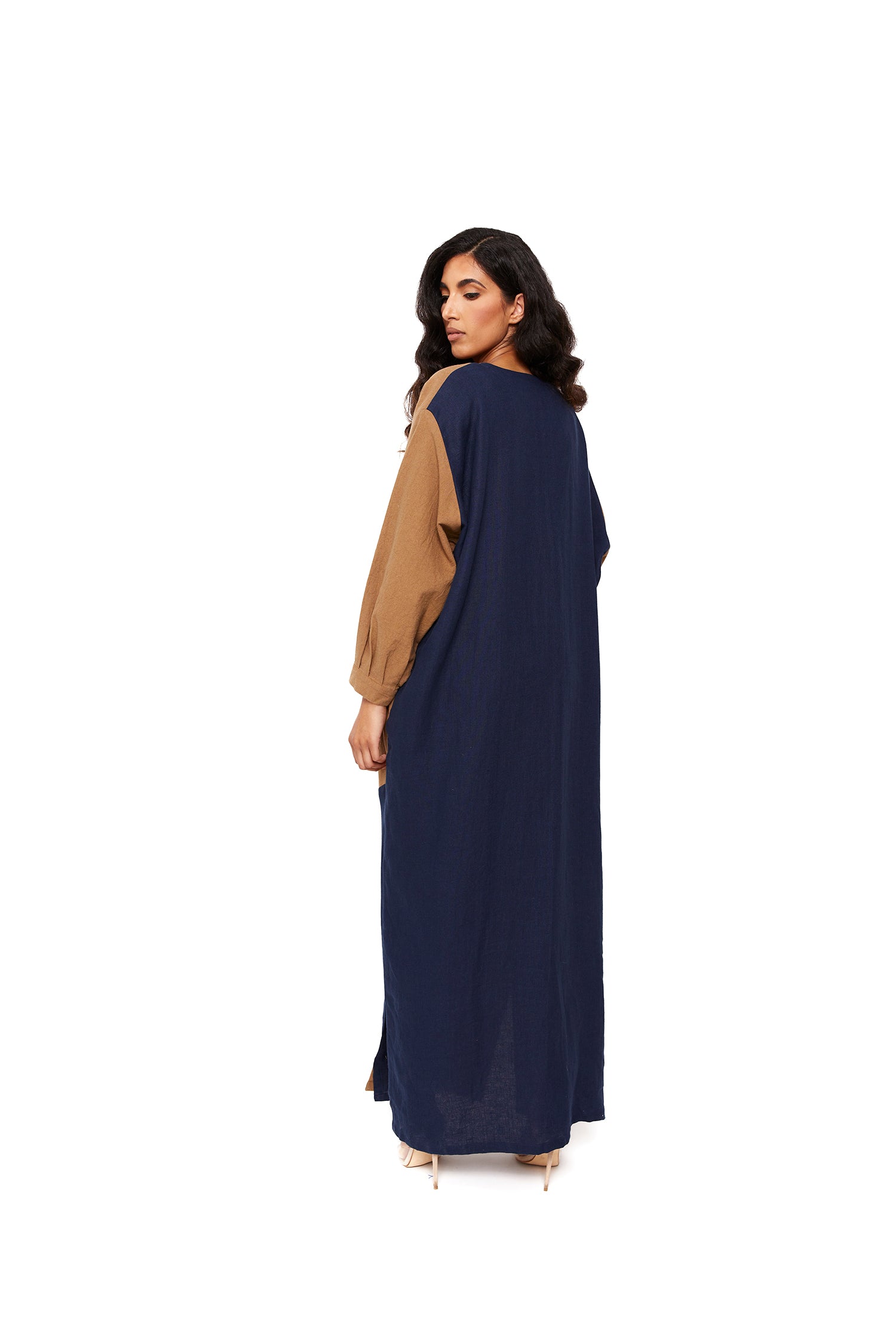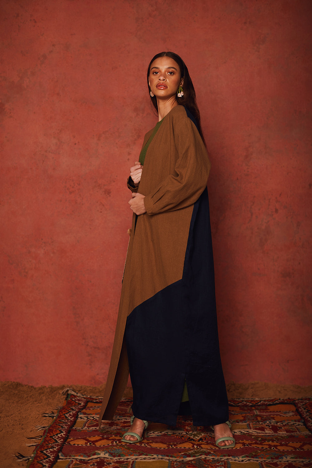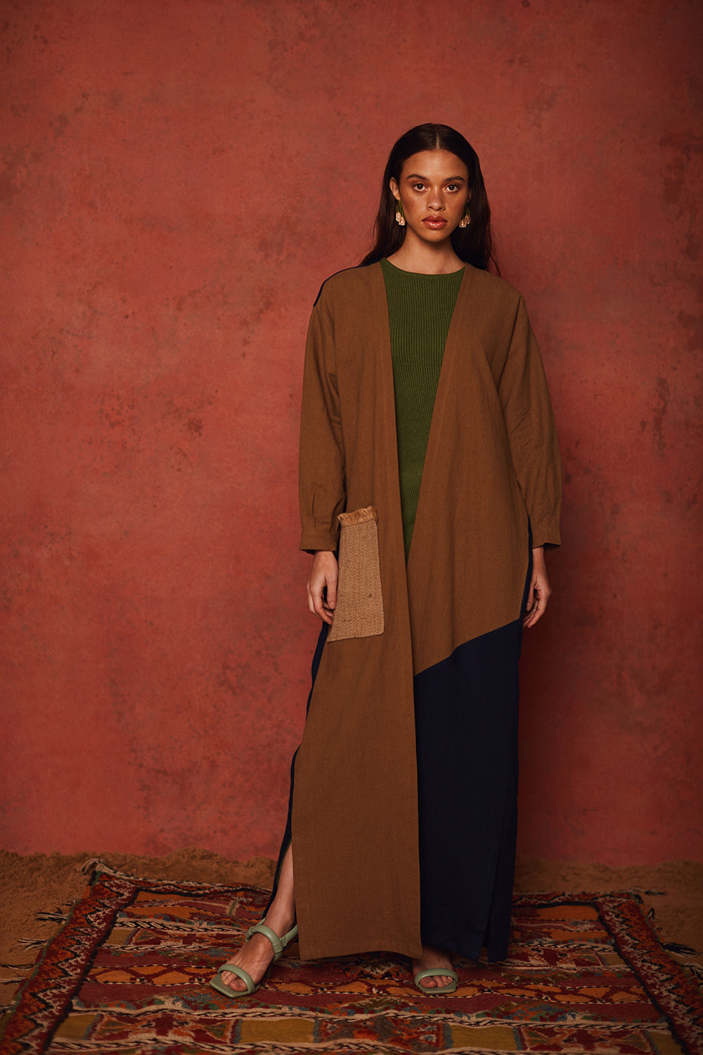 Playing with lines! This Japanese linen and cotton mix abaya has a washed finish with a brilliant crumpled texture and slightly faded colours. A soft canvas like fabric perfect to finish that casual chic look. Detailed with a hessian pocket
