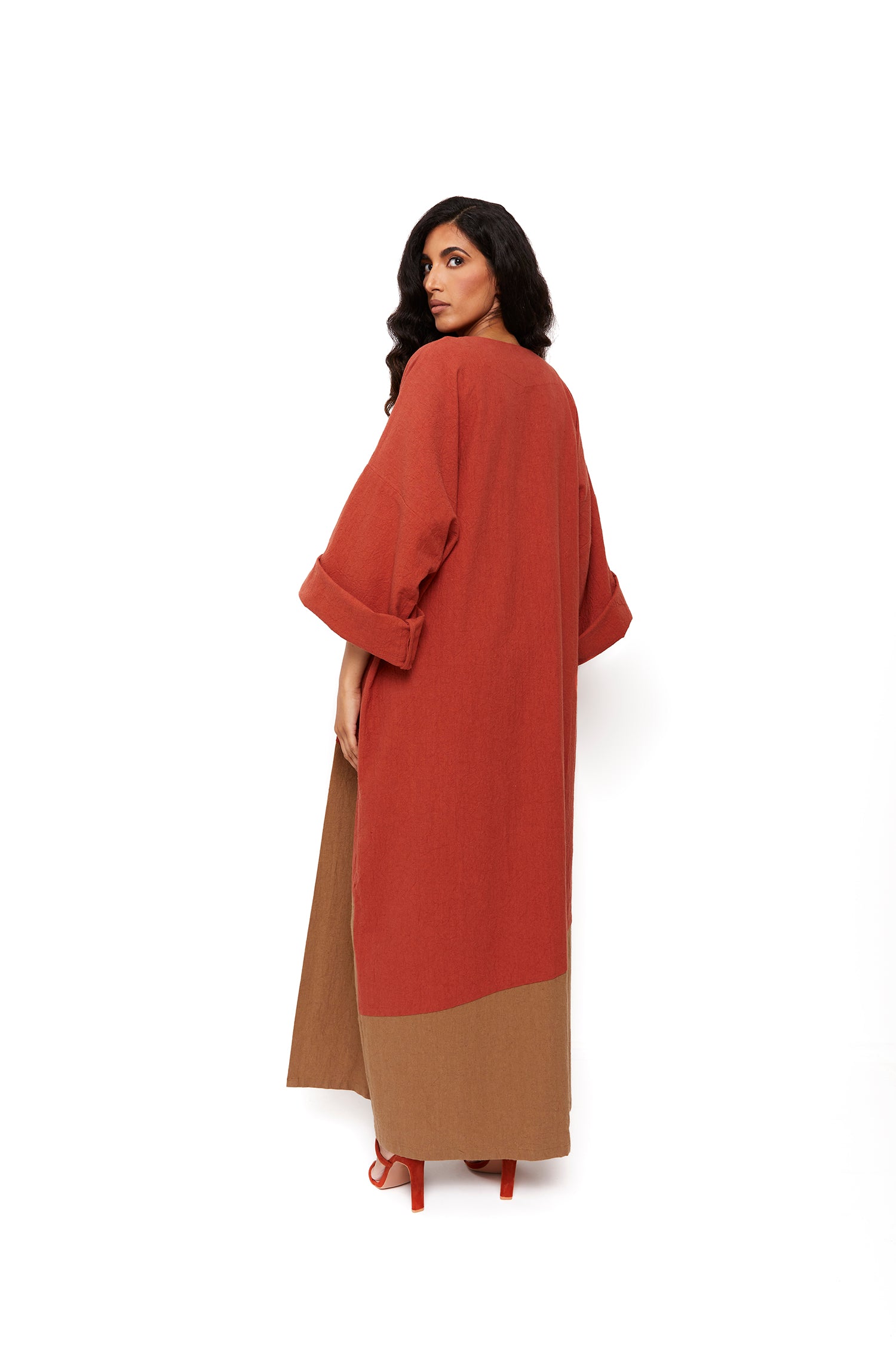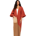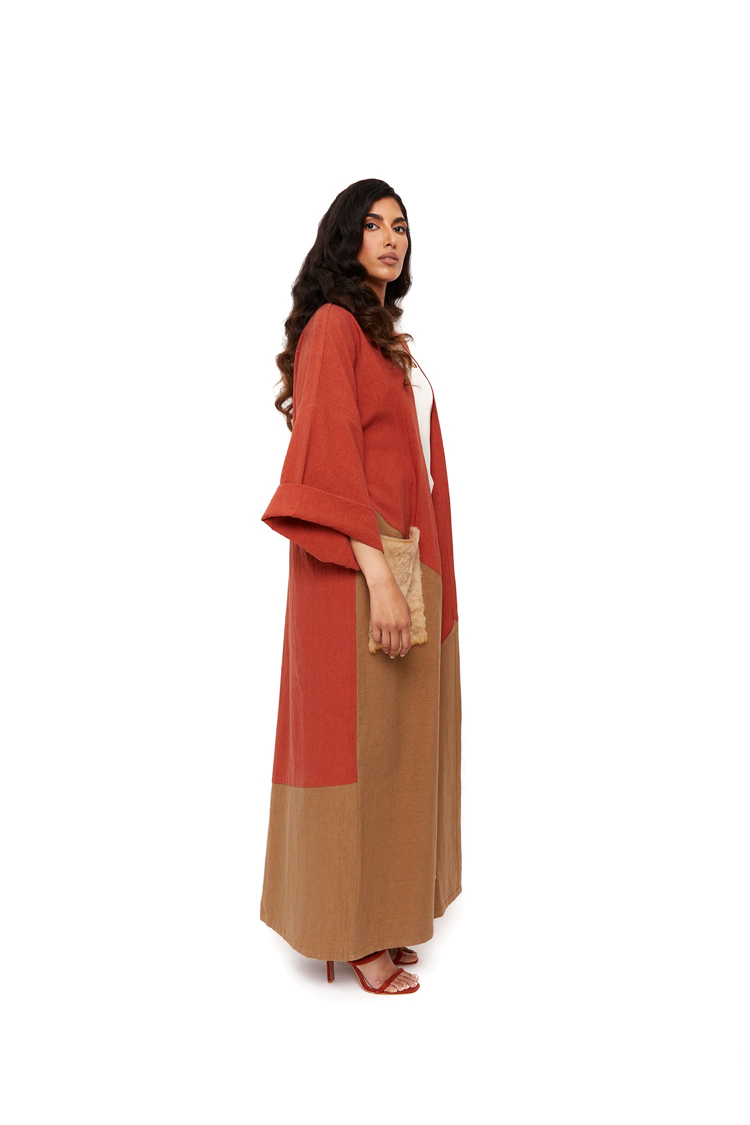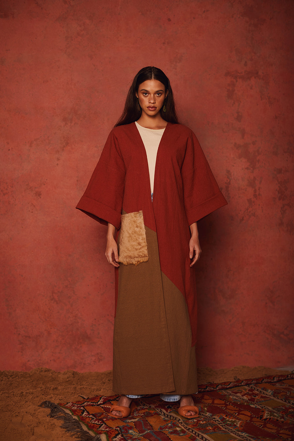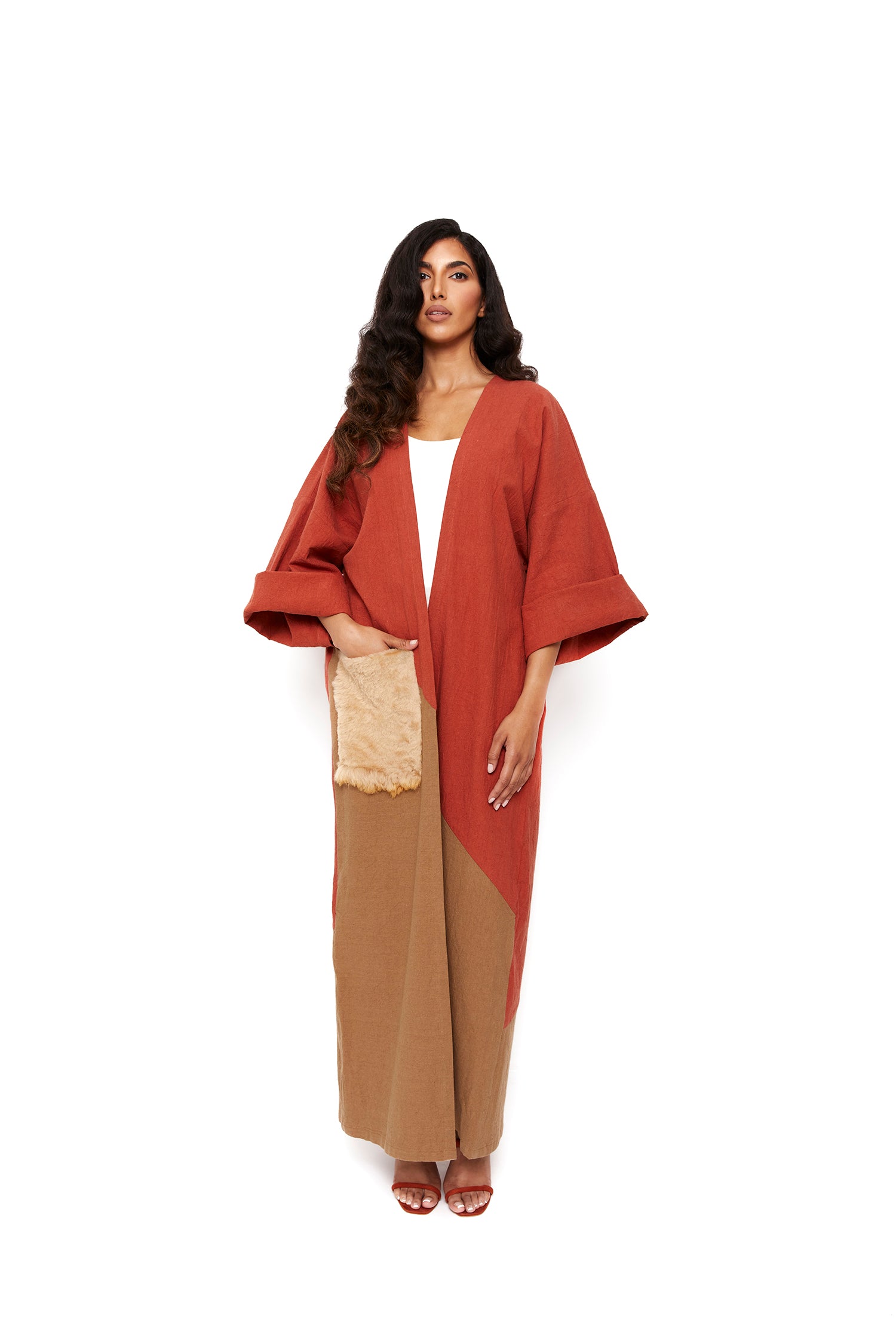 Playing with lines! This Japanese linen and cotton mix abaya has a washed finish with a brilliant crumpled texture and slightly faded colours. A soft canvas like fabric perfect to finish that casual chic look.  We love the goat skin pocket.
