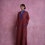 The fabric was sourced in England, and then we developed a kaftan in Marrakech with local Moroccan artisans and created matching trousers to pair with the kaftan.
