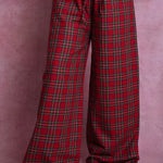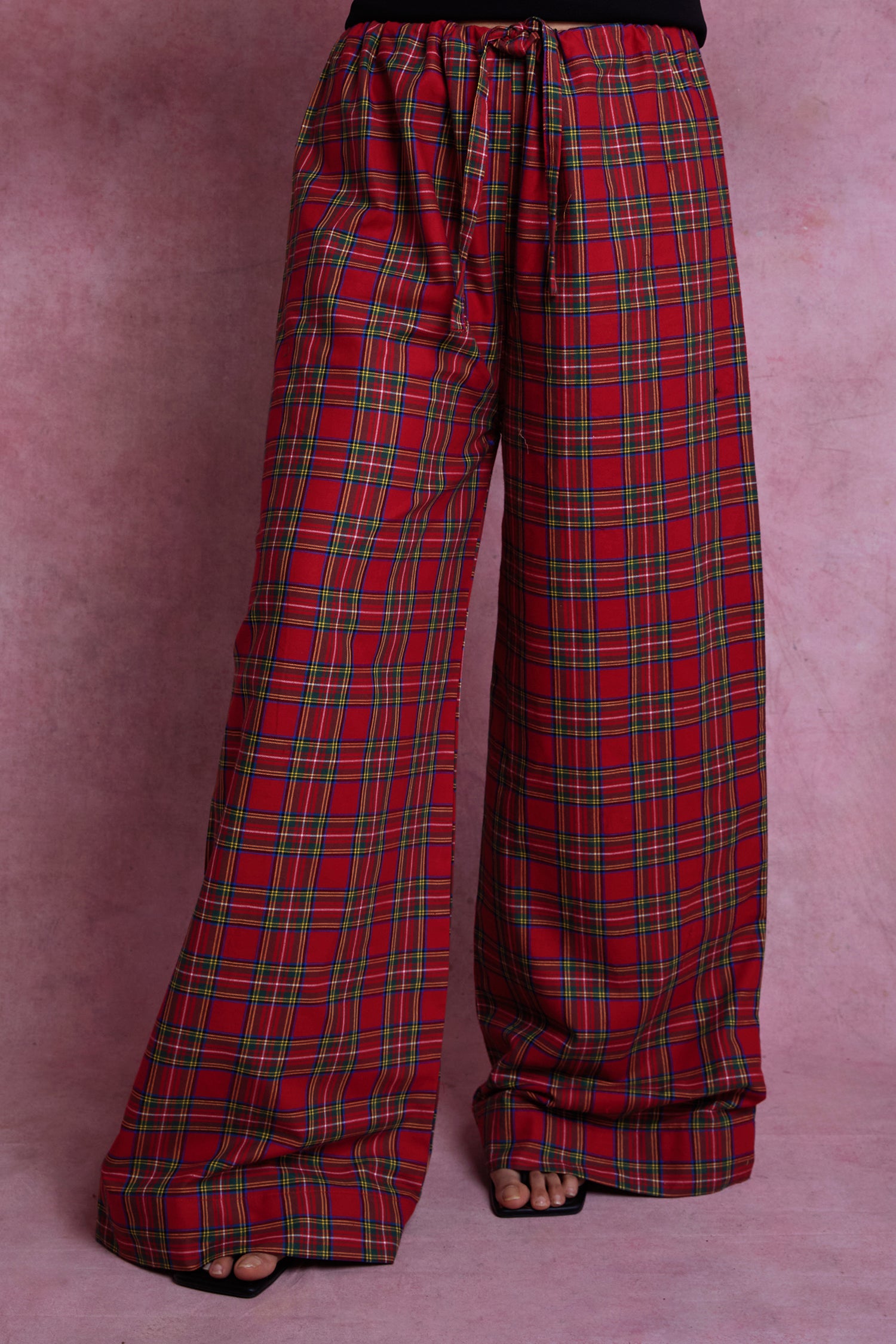 Highlands-inspired cotton tartan check high-waist palazzo, wide leg trousers, with draw string tie.