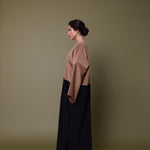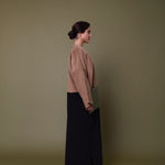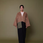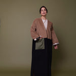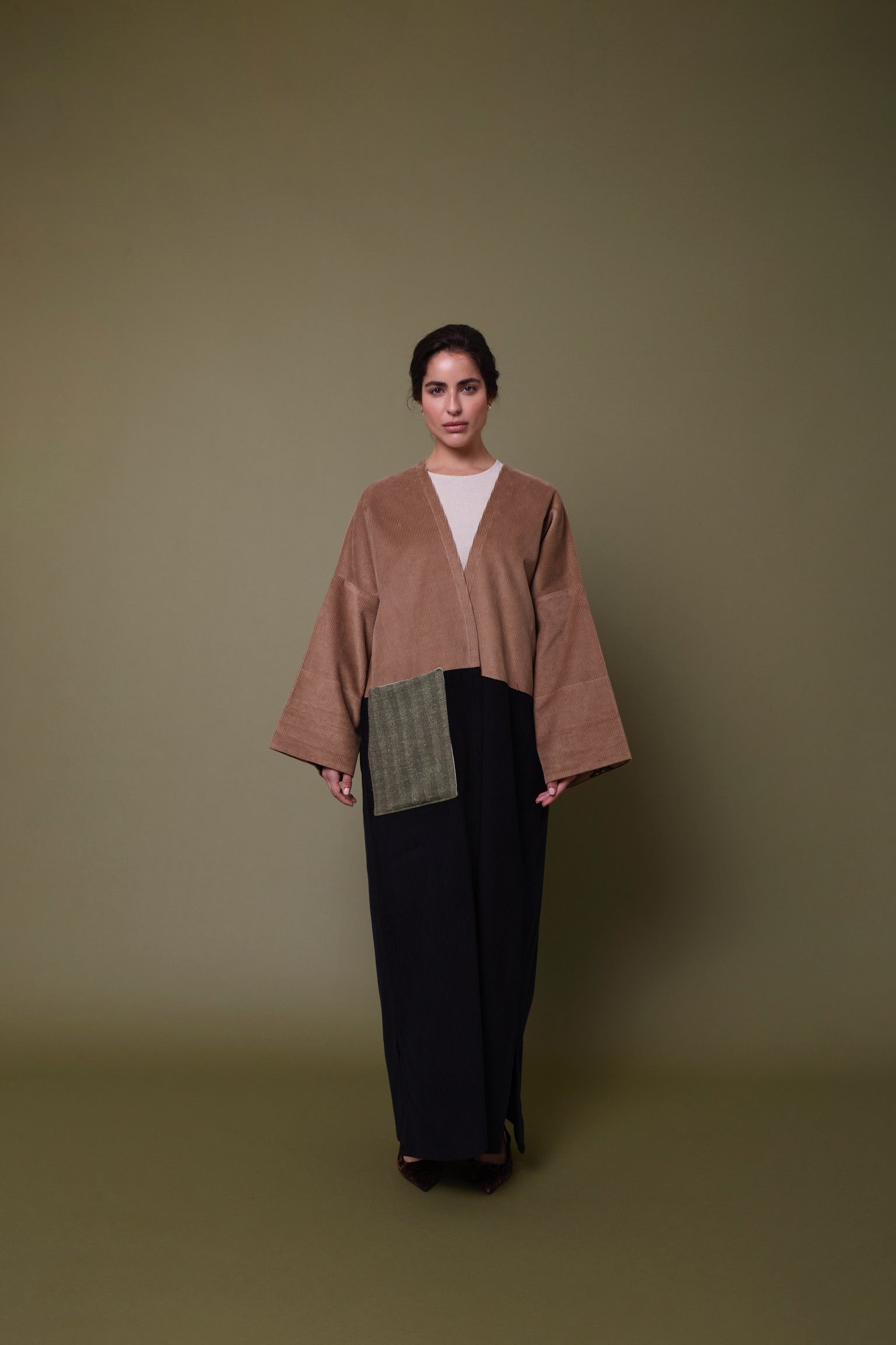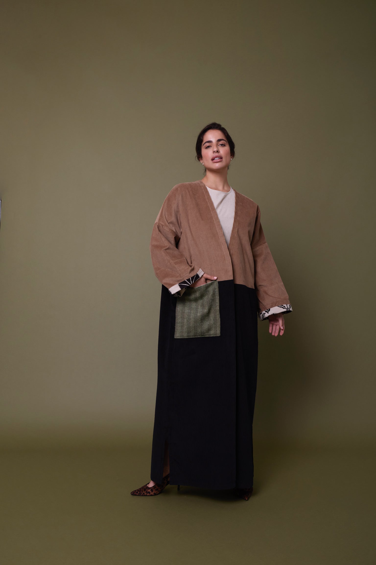 Cotton corduroy abaya with British home-grown wool pocket. Finished with Indian block printed cotton cuff hem facing.  Perfect for the winter!