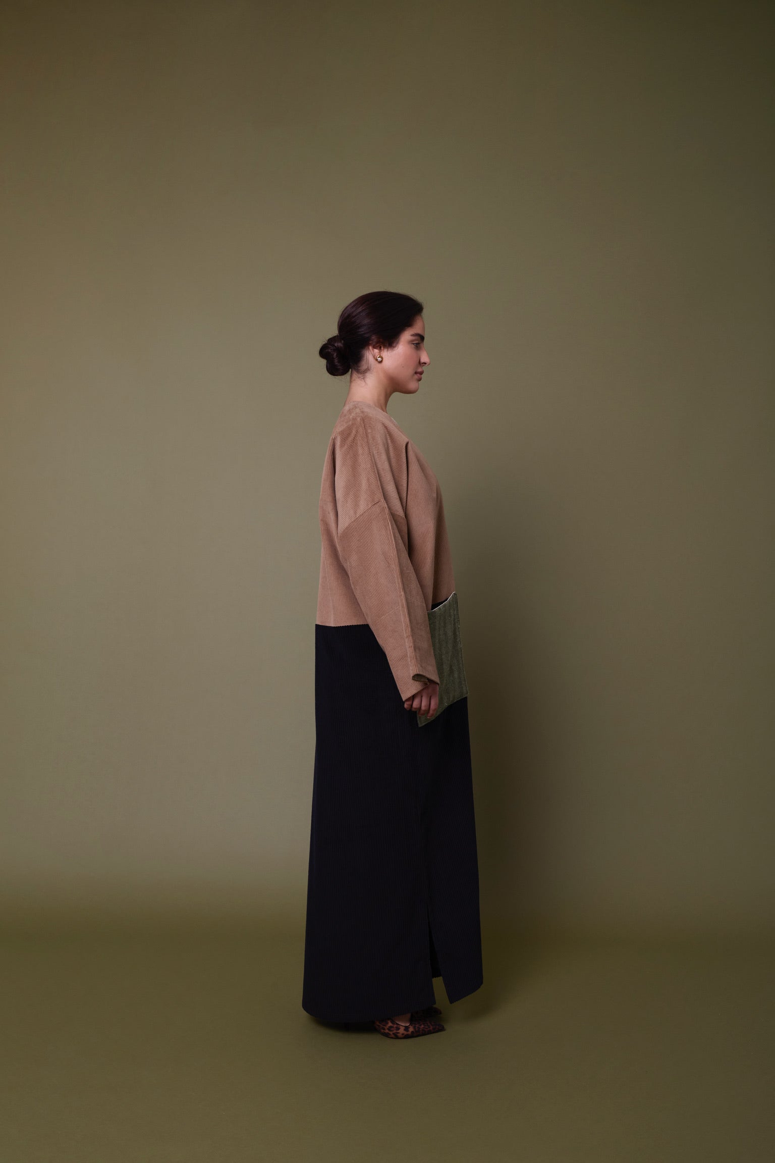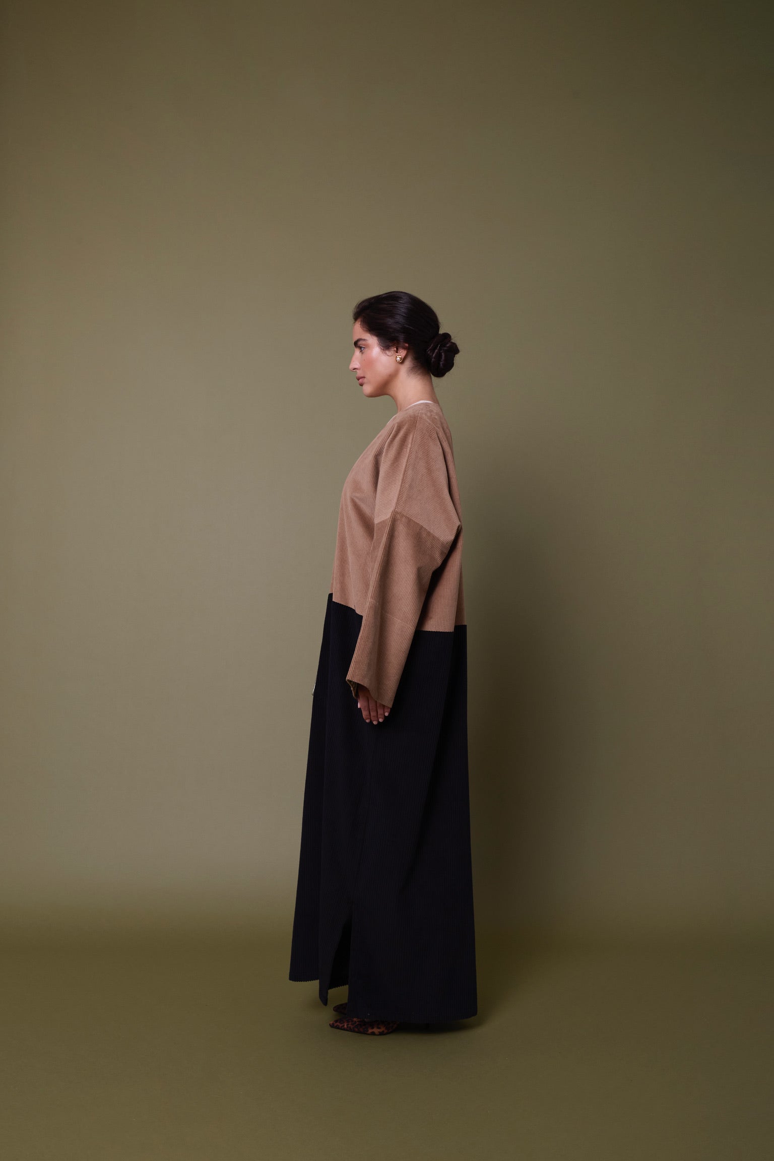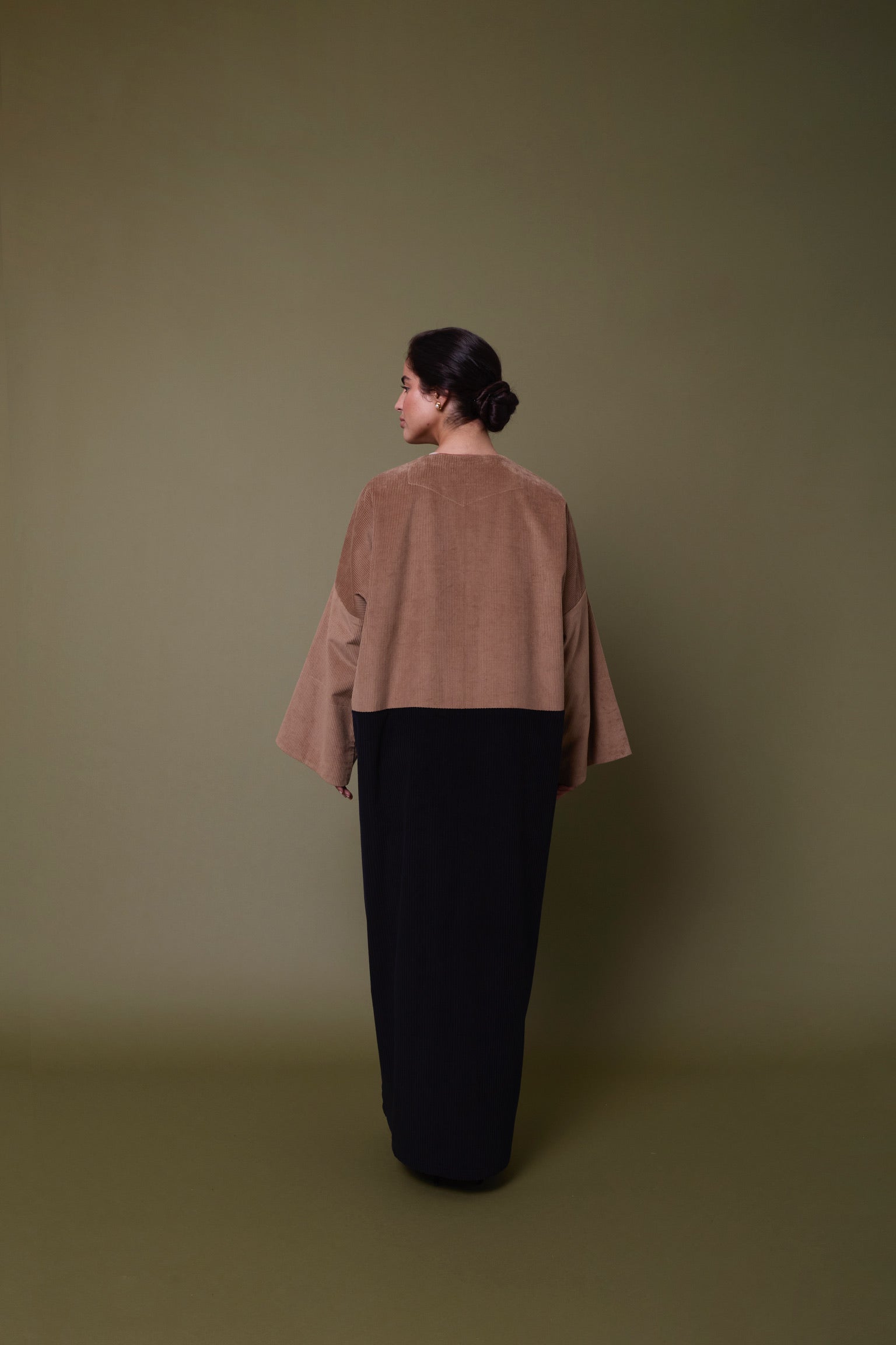 This abaya is a handcrafted piece using different scales of corduroy to showcase the dimensions of the craft behind each piece.  Available on Pre-order with a lead time of 2 weeks