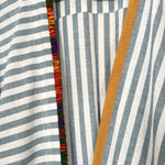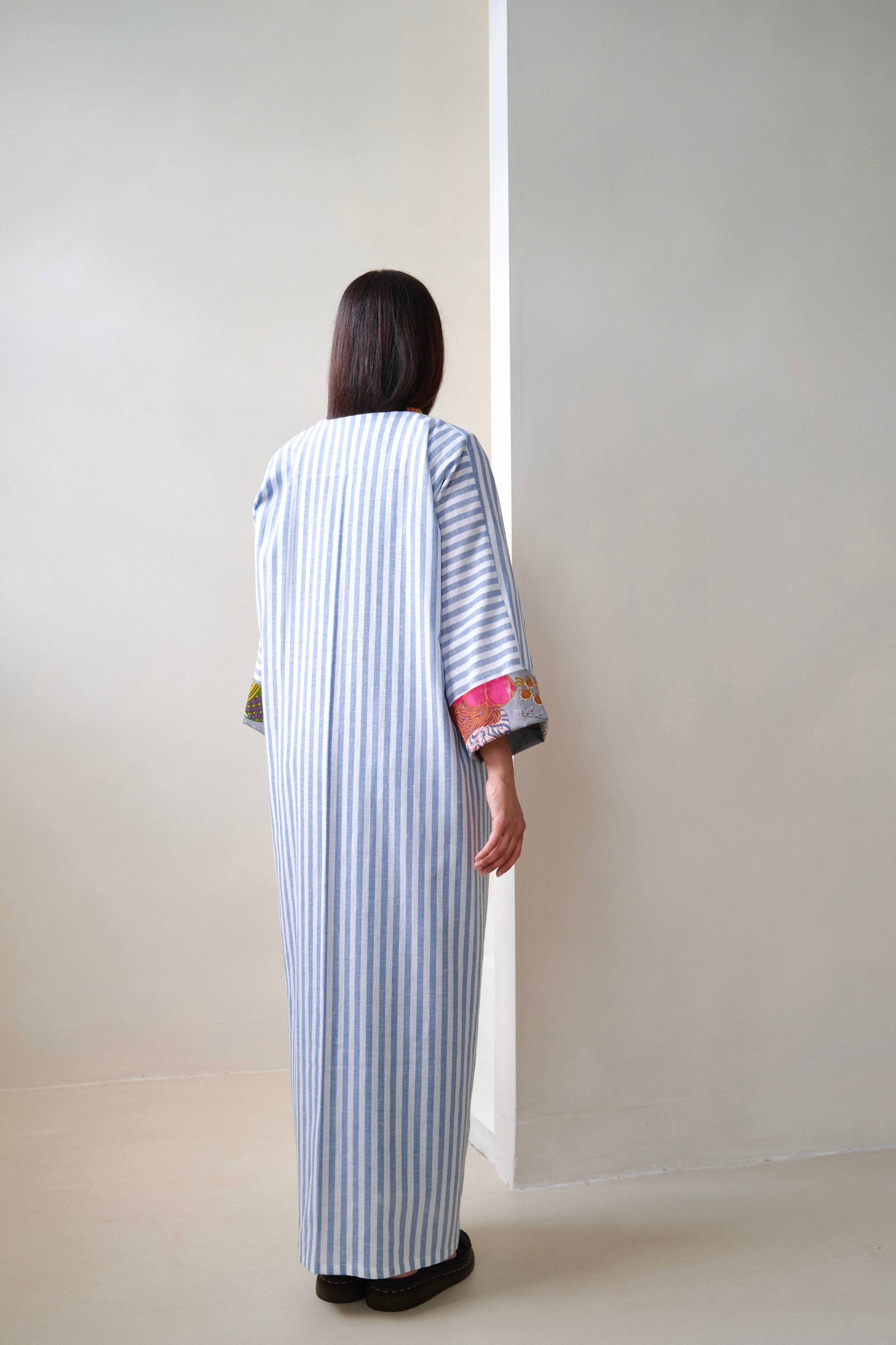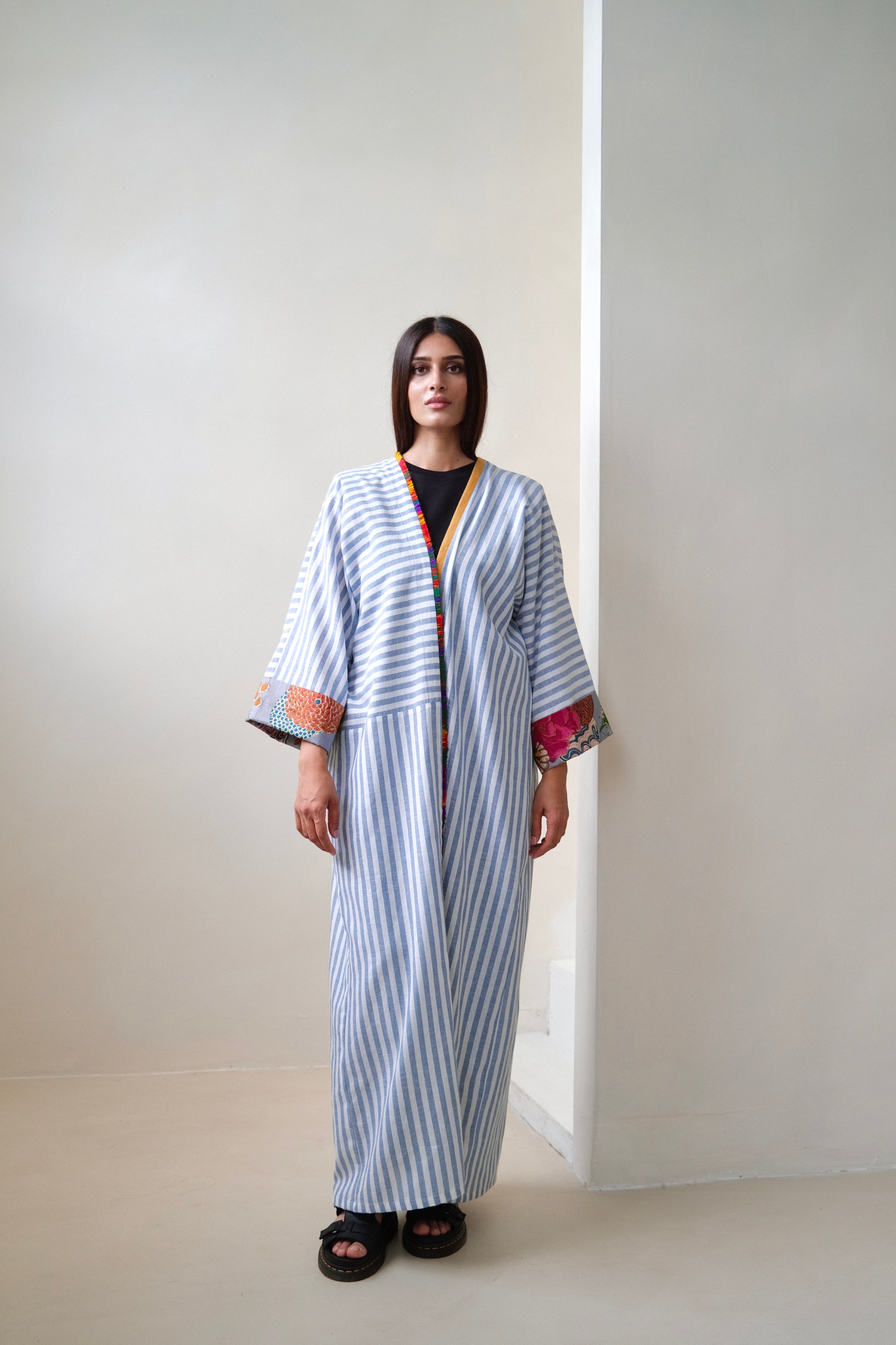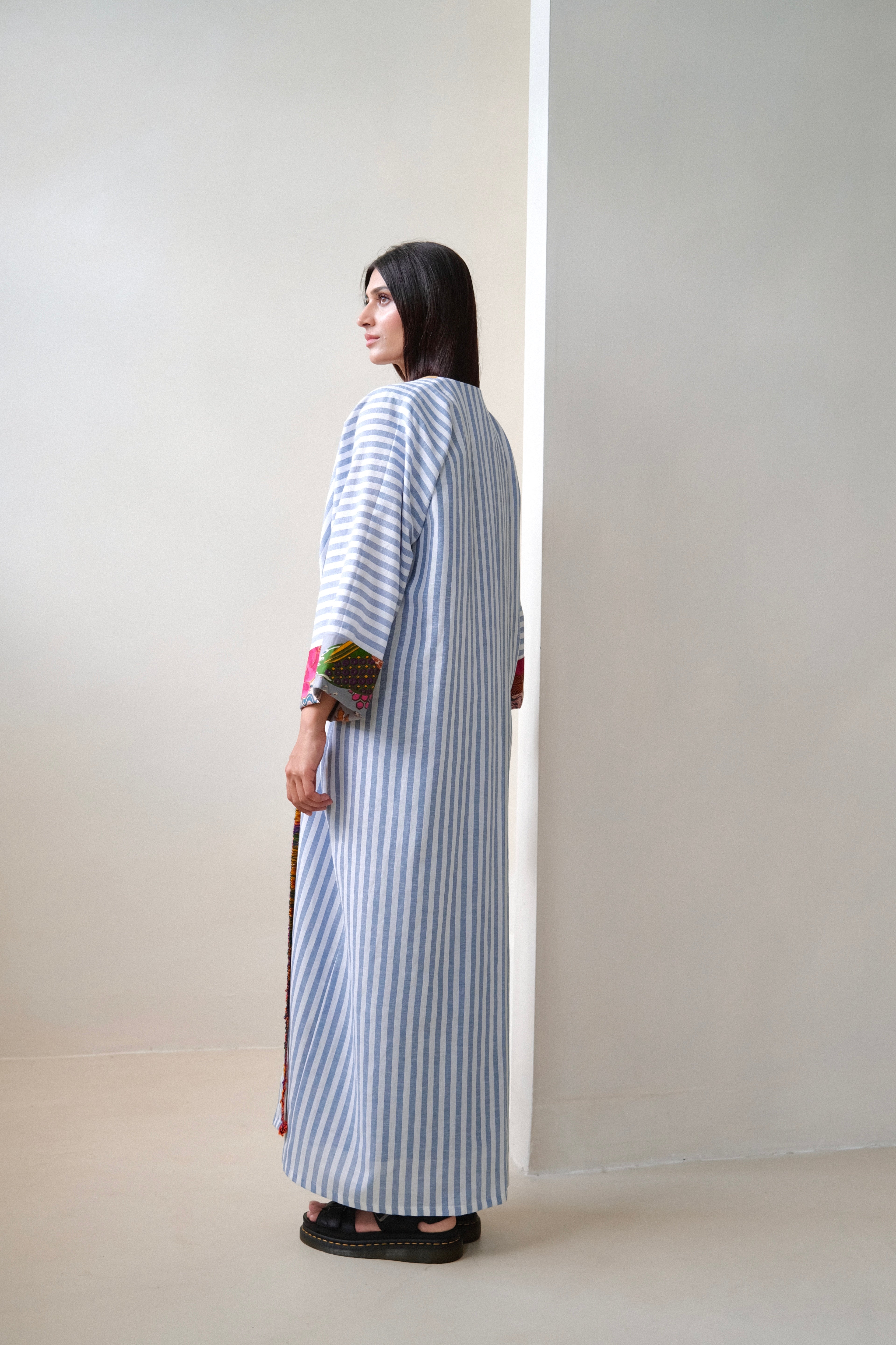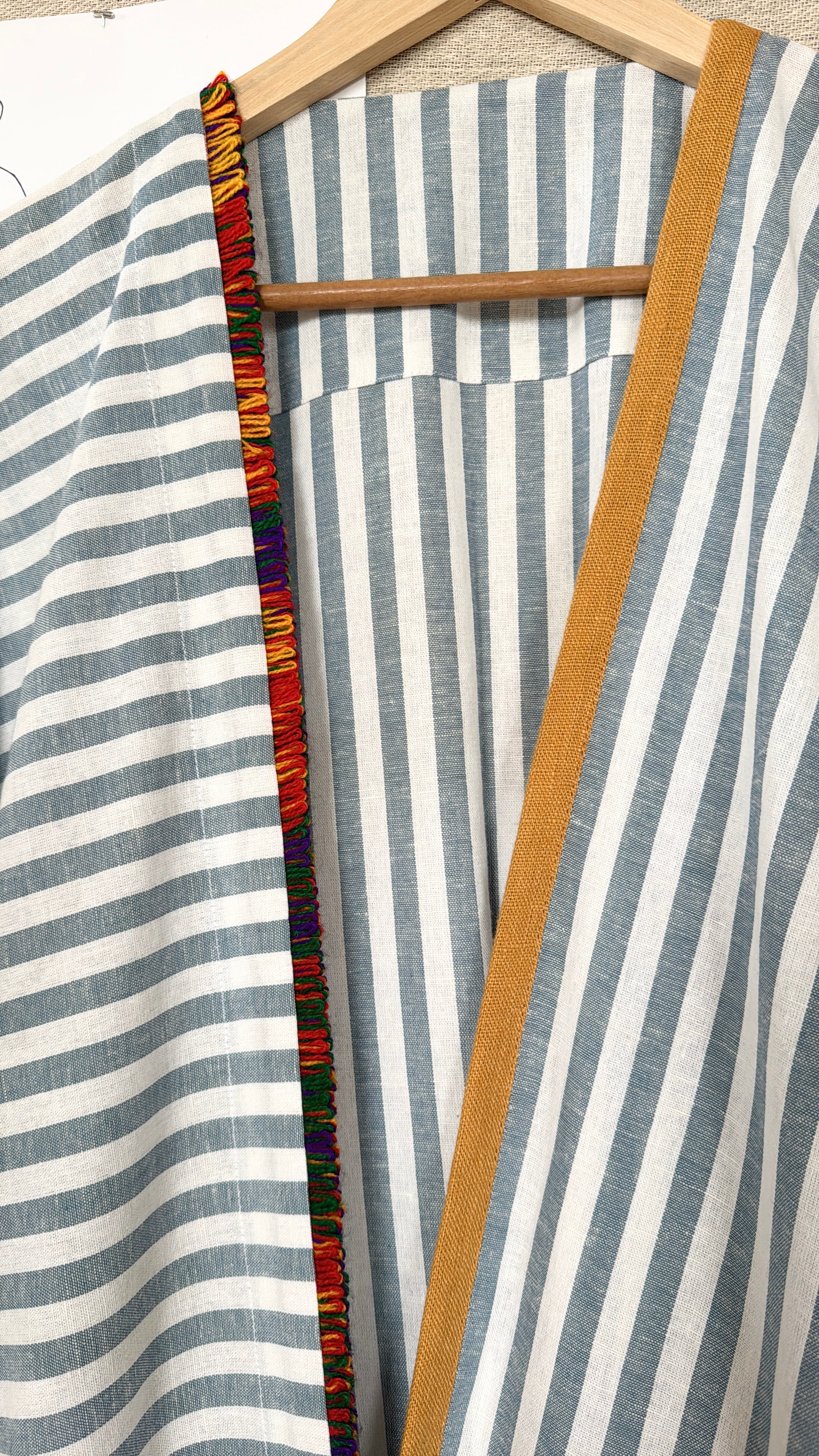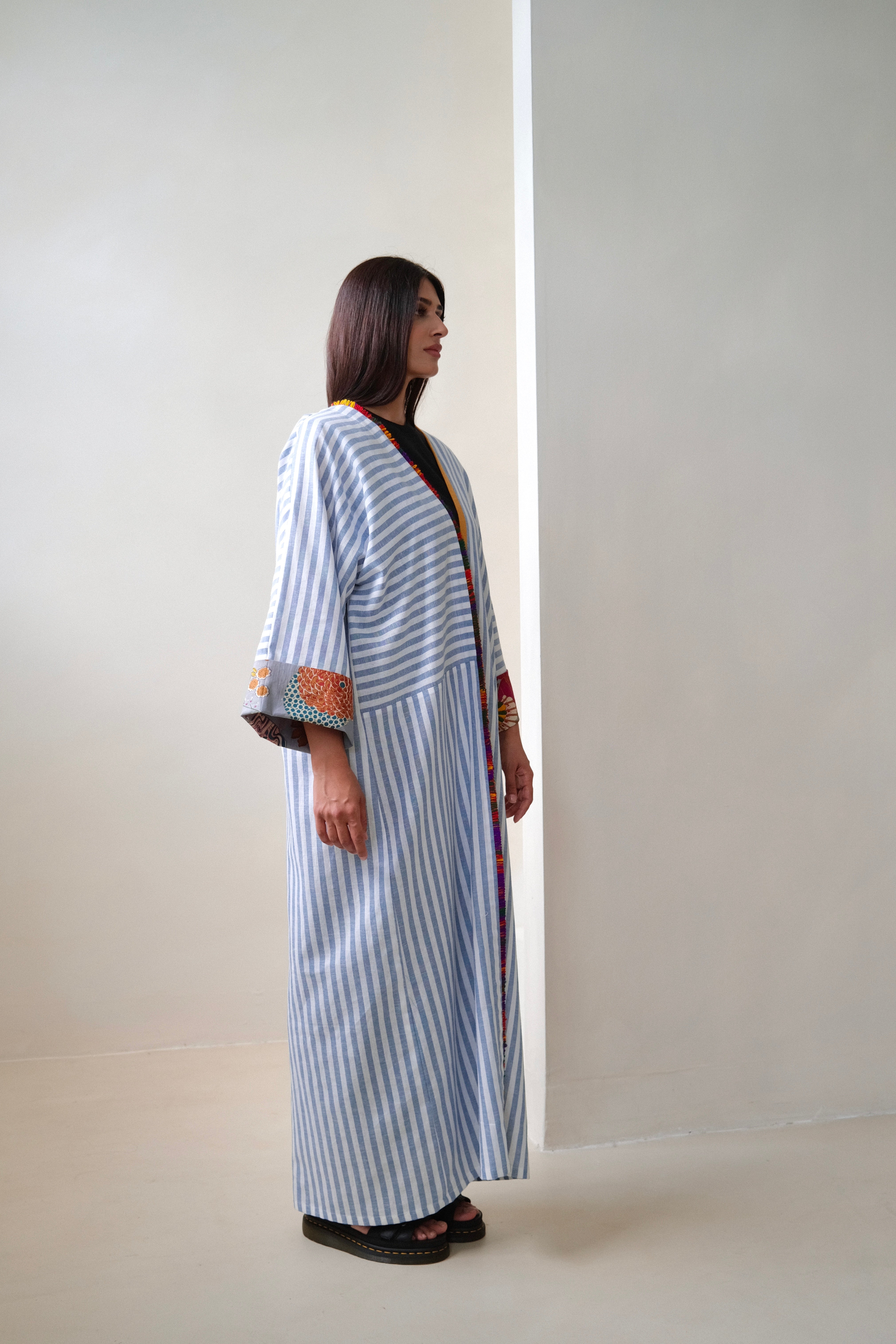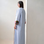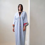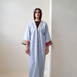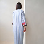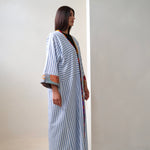 Blue and white striped robe abaya, finished with a a trim sourced in Morocco. The cotton and linen mix striped fabric was originally used in our resort collection, "Yugen".