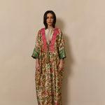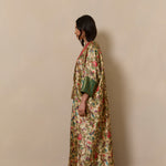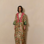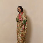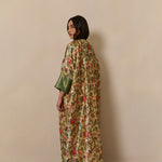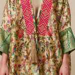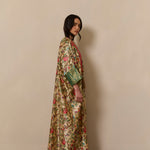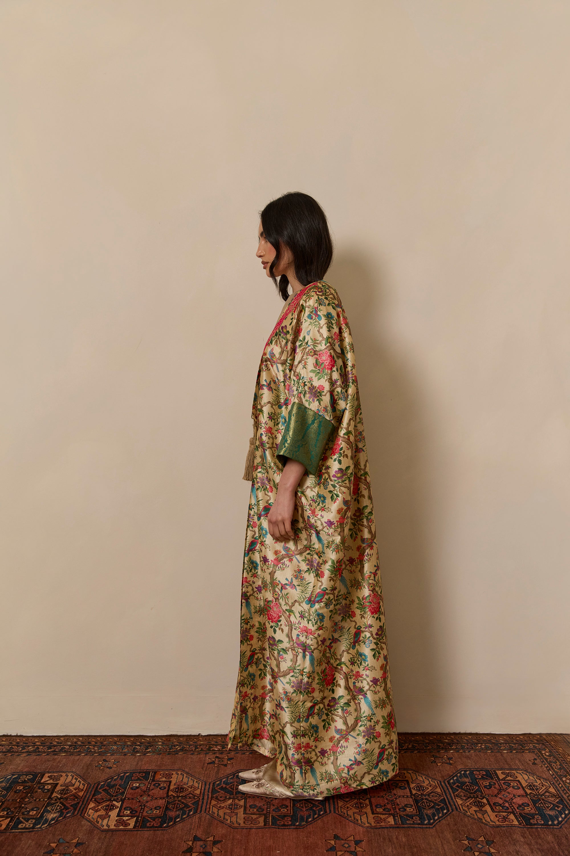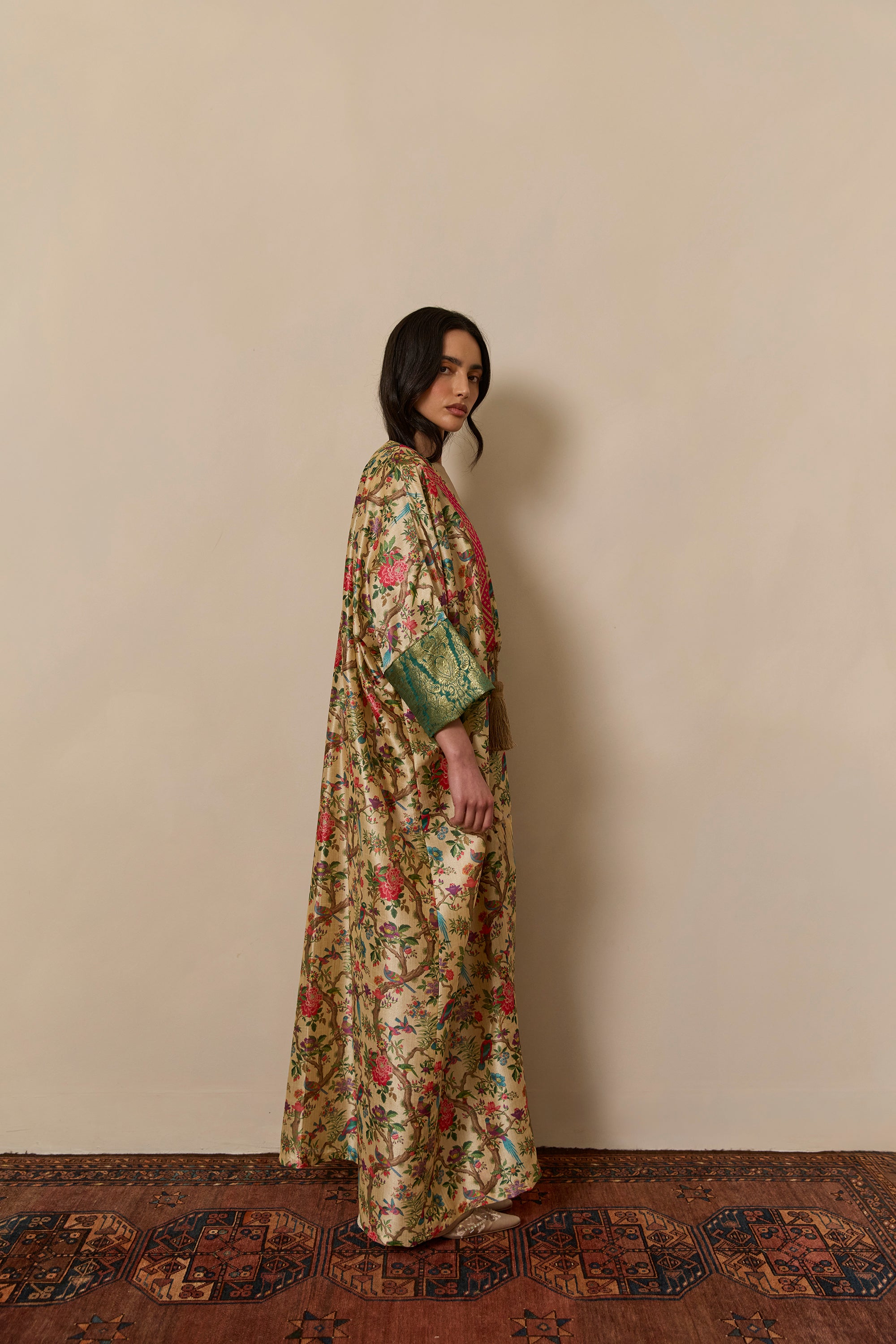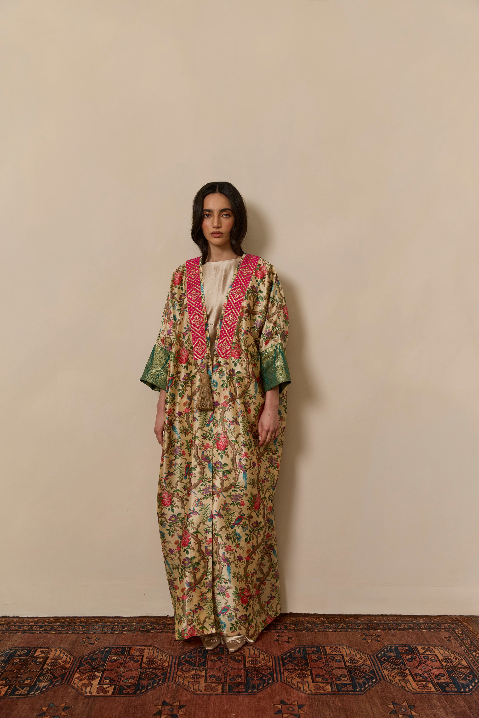 Bisht inspired abaya cloak handcrafted from bamboo silk in a beautiful bird garden print. Finished with jewel tone fuschia and gold trim from India.