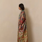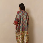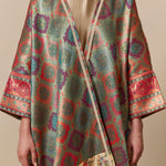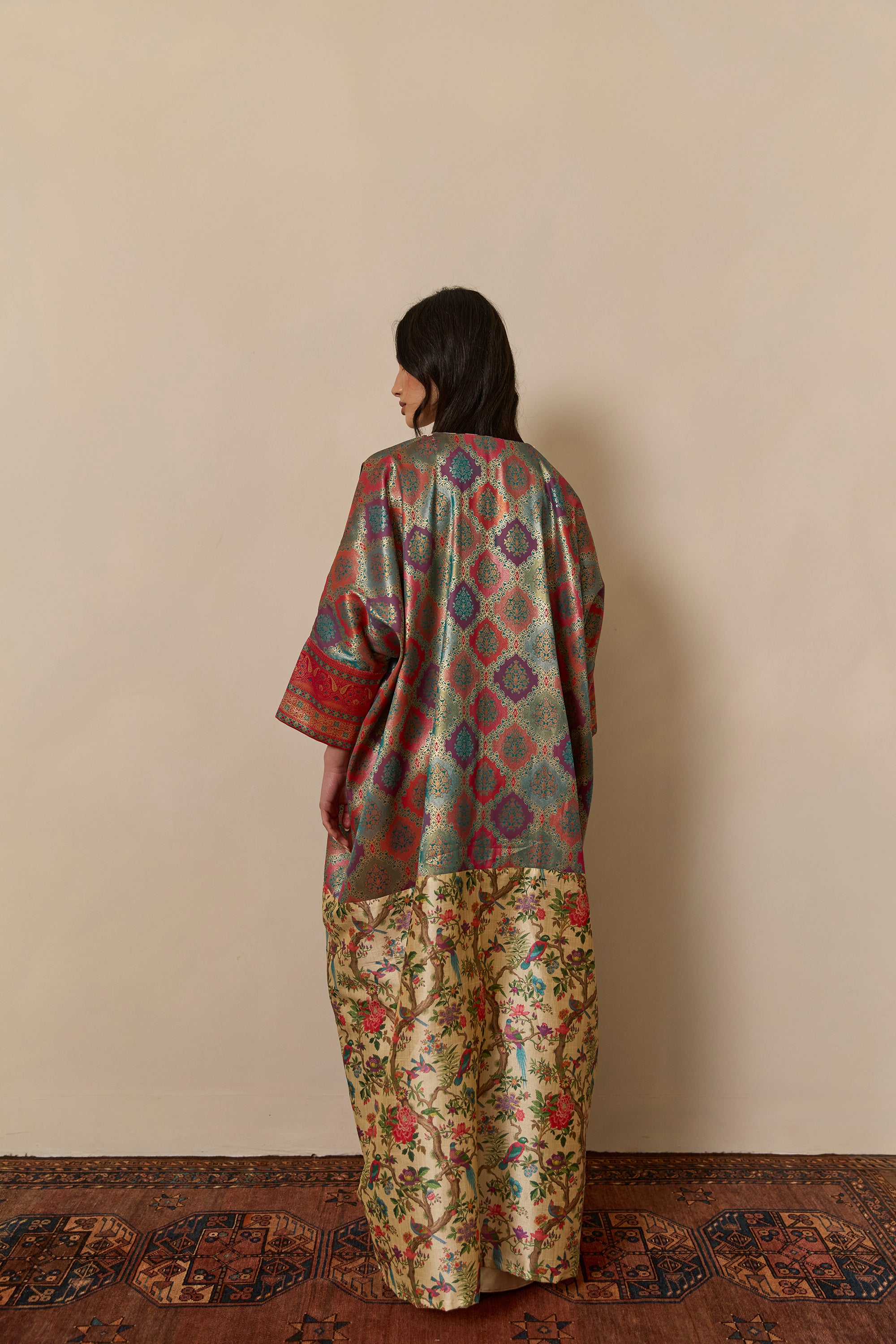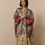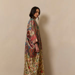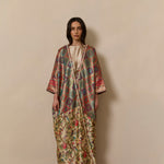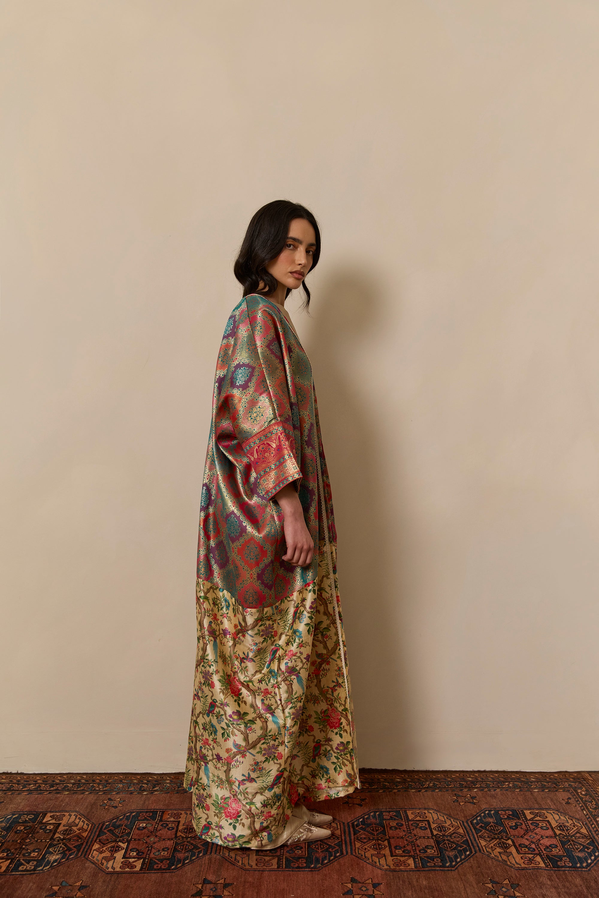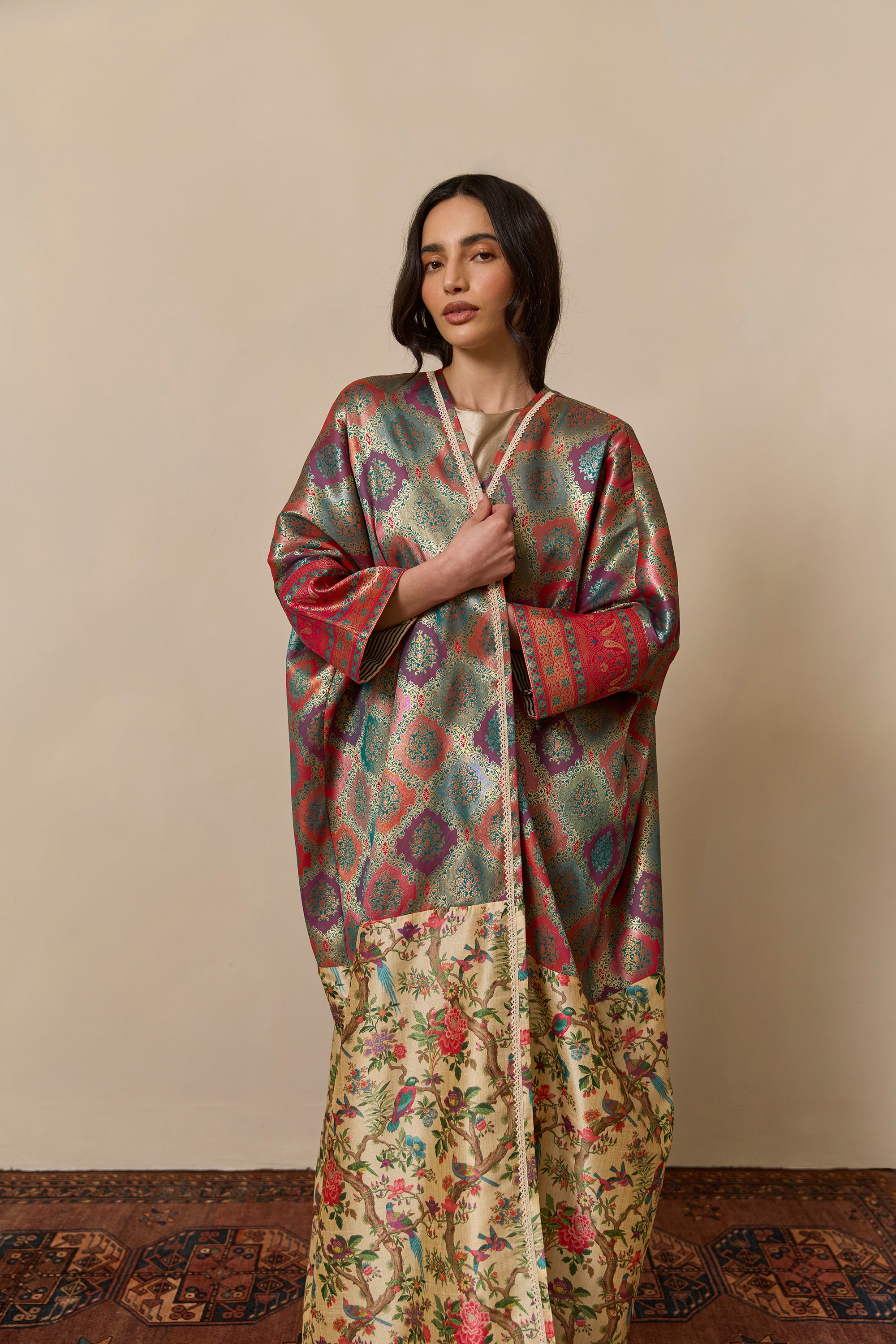 Bisht inspired abaya cloak, handcrafted from a jewel-like silk brocade, paired with bamboo silk in a beautiful bird garden print. Finished with a vintage style cotton crotchet trim.