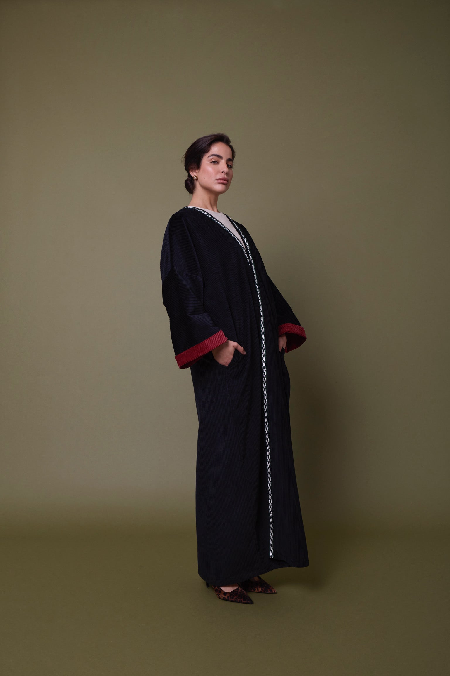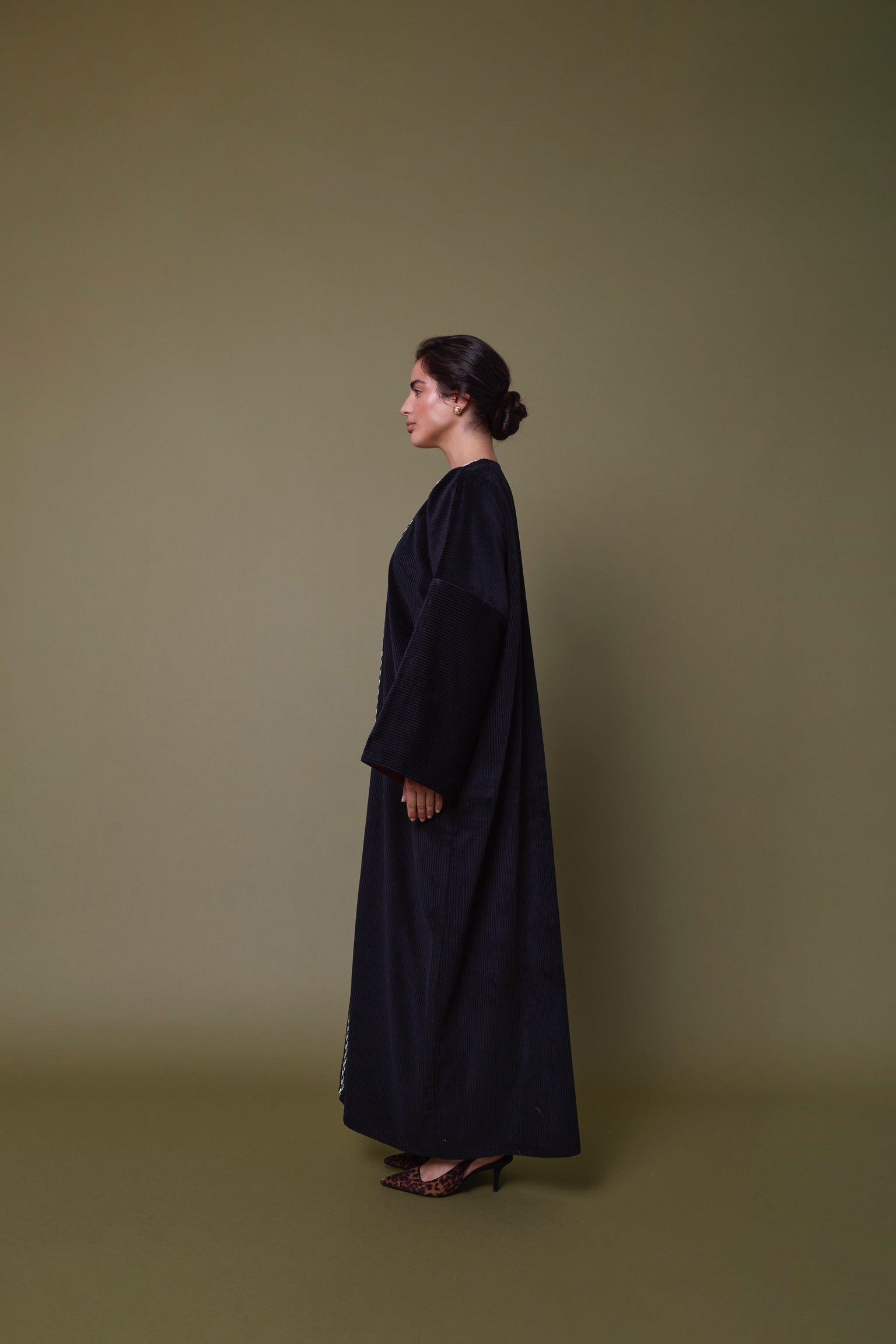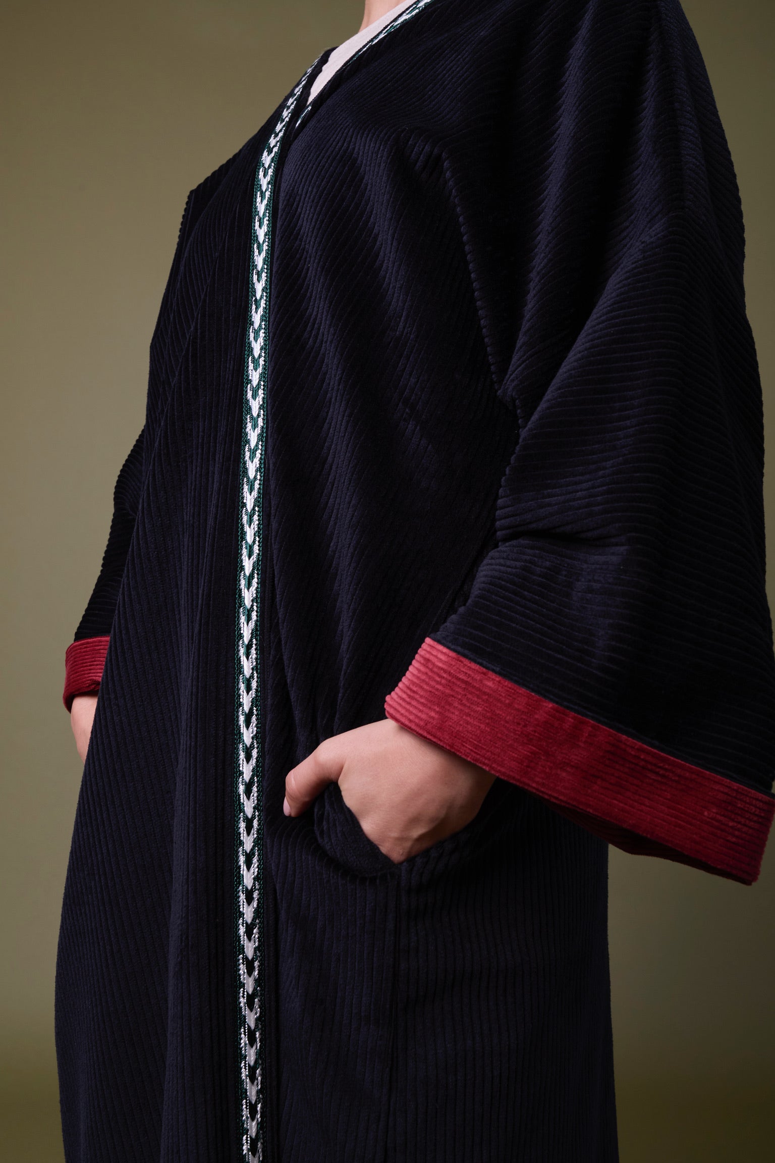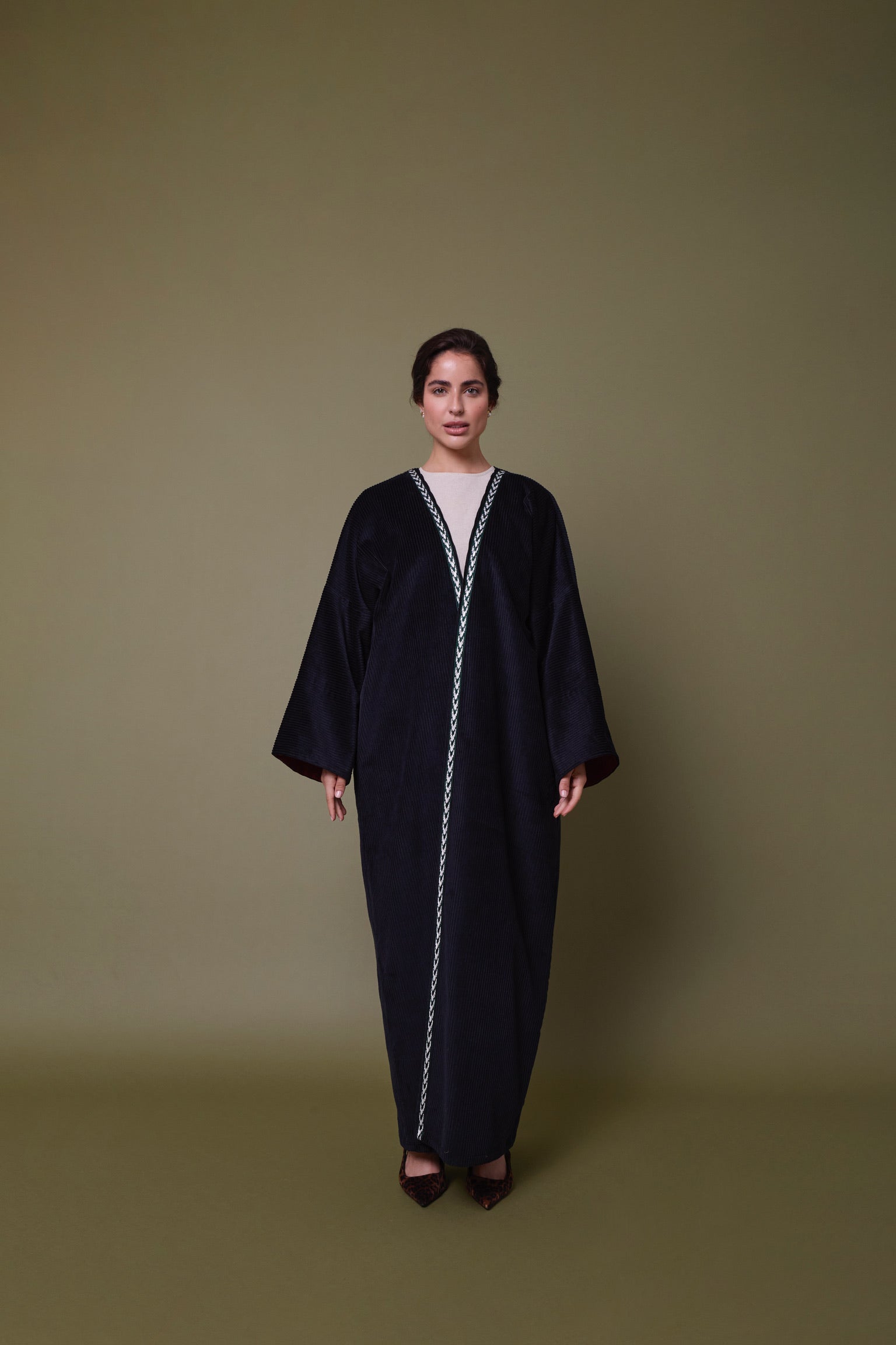 Cotton corduroy abaya, finished with a traditional Moroccan sfifa trim, sourced in Marrakech. This handcrafted abaya comes with internal pockets.