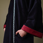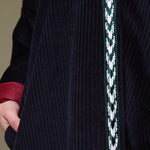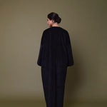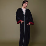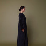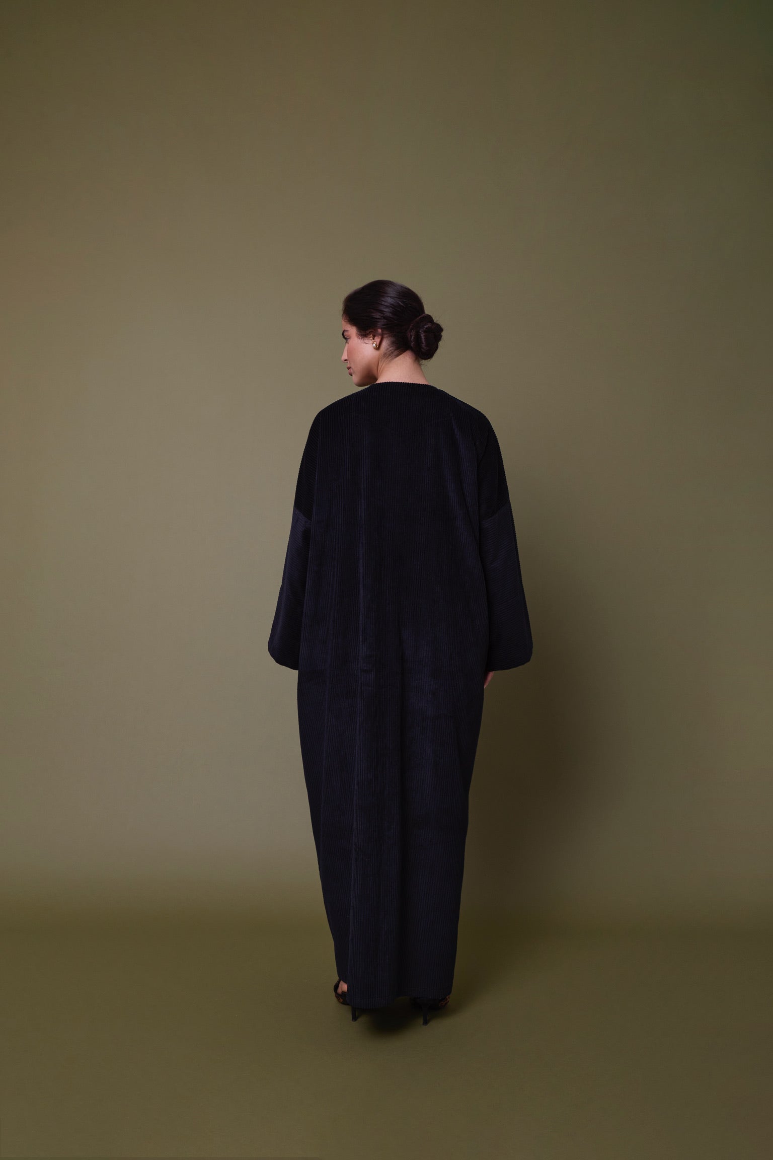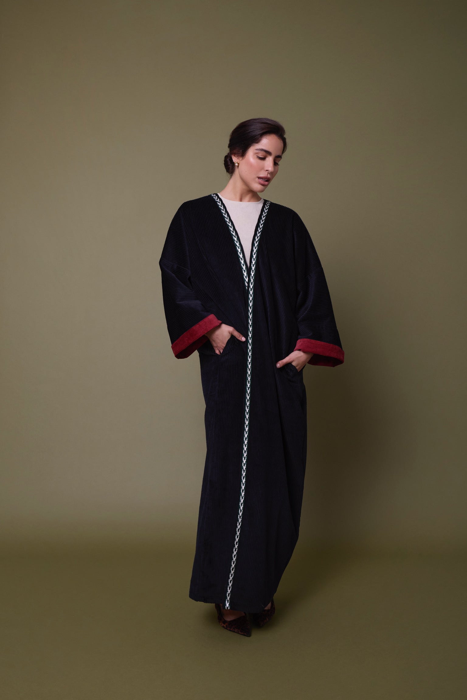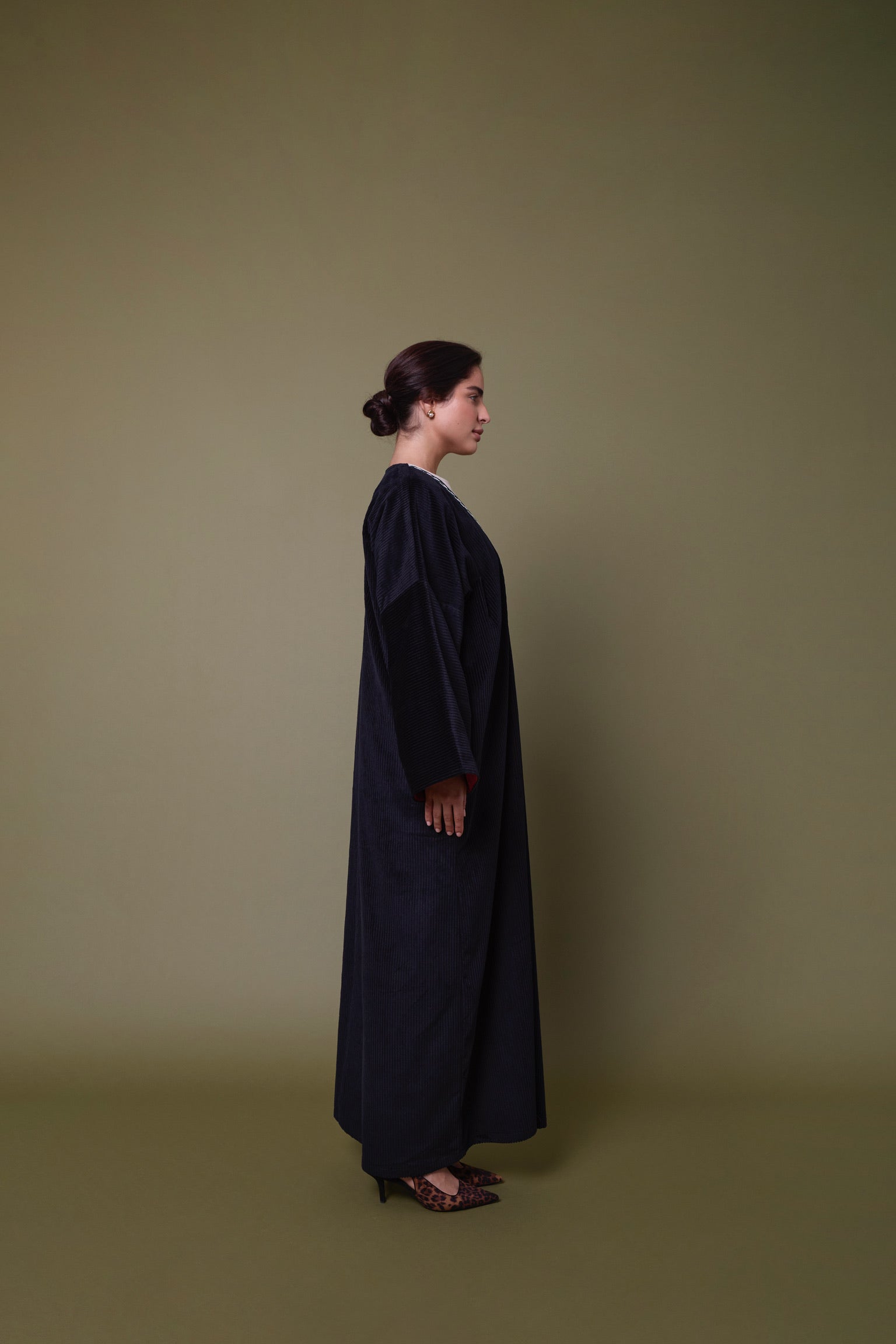 Cotton corduroy abaya, finished with a traditional Moroccan sfifa trim, sourced in Marrakech. This handcrafted abaya comes with internal pockets.