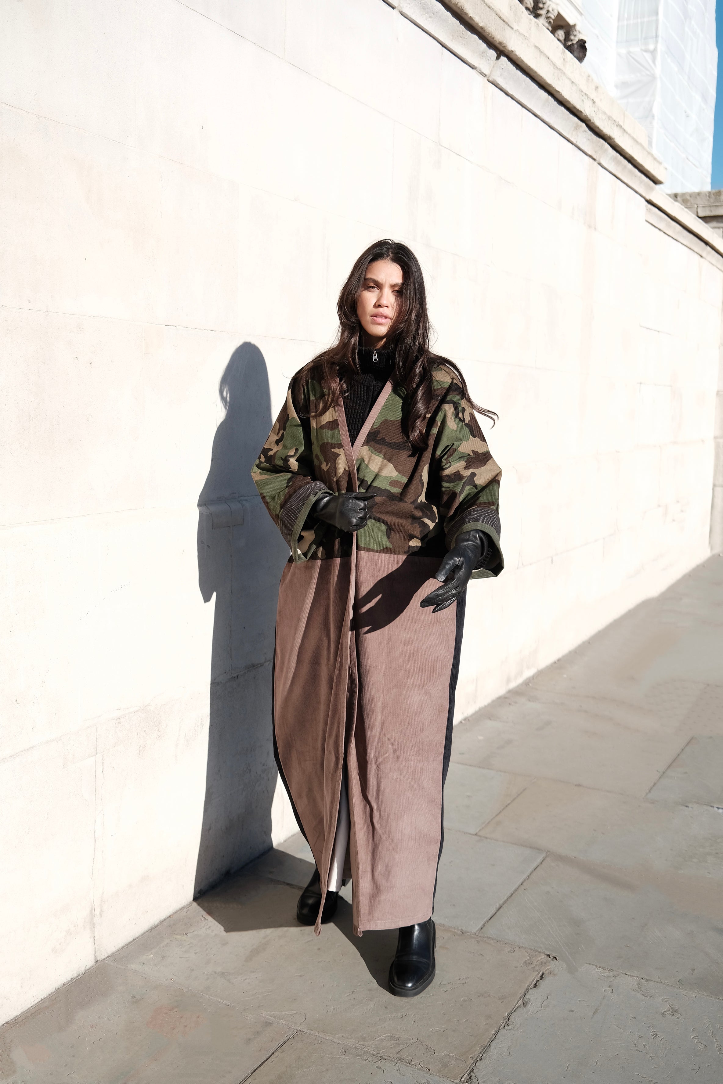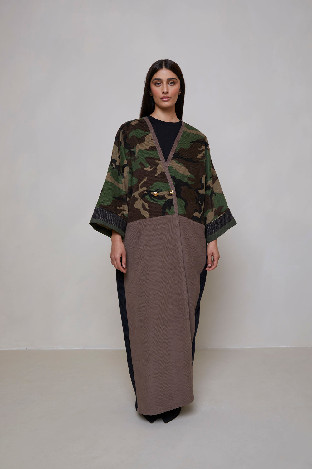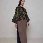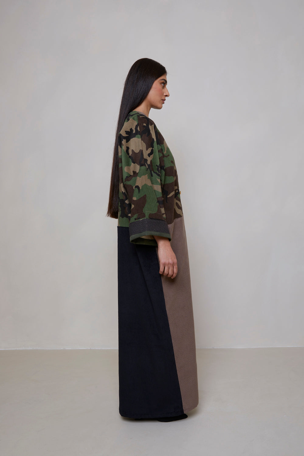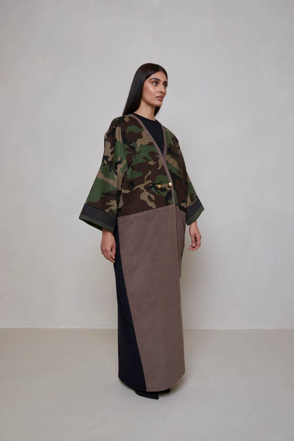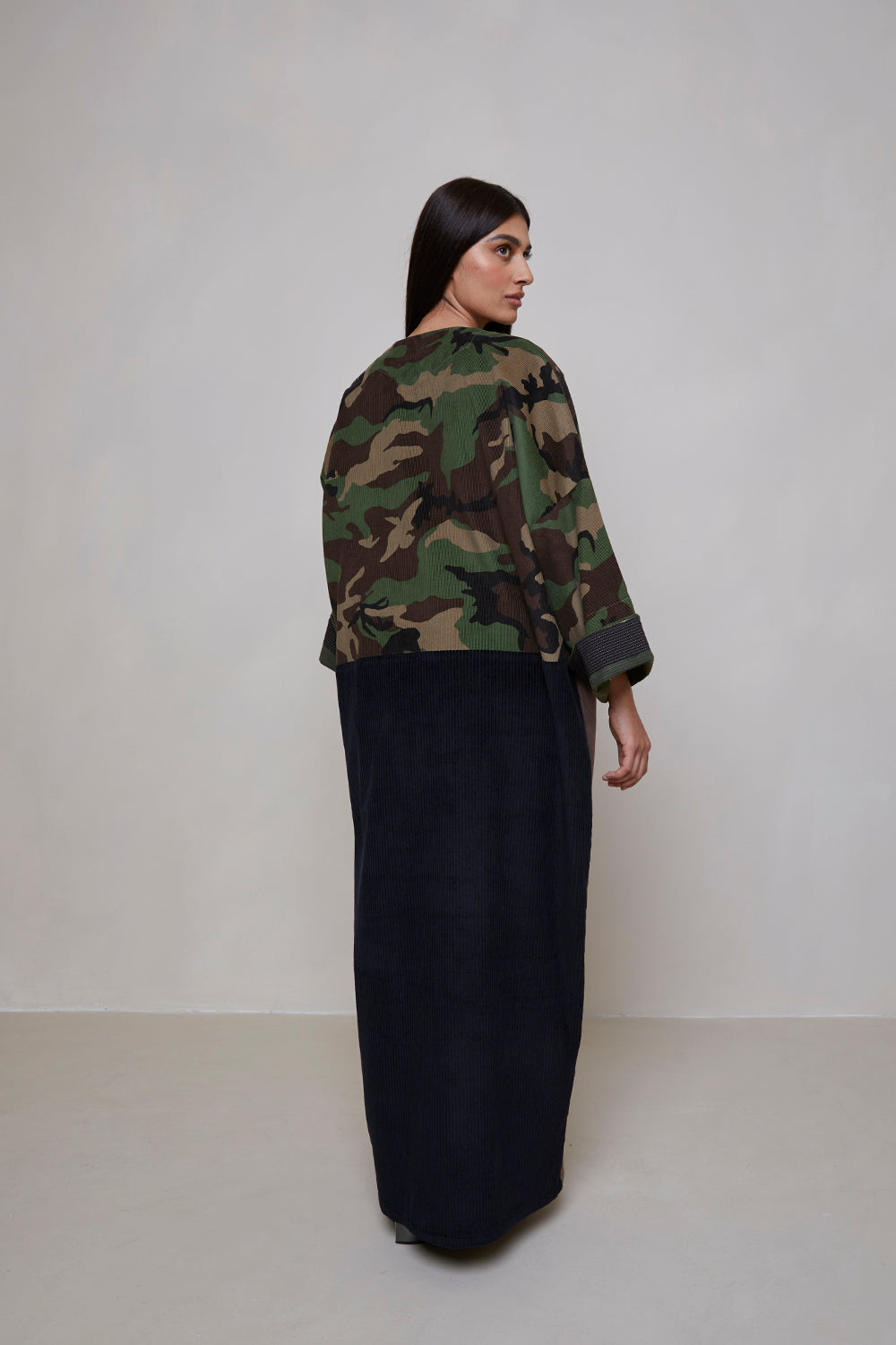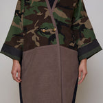 Camouflage print European corduroy abaya with double-breast opening. Finished with vintage buttons and Indian block printed cotton cuff facing.