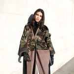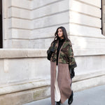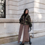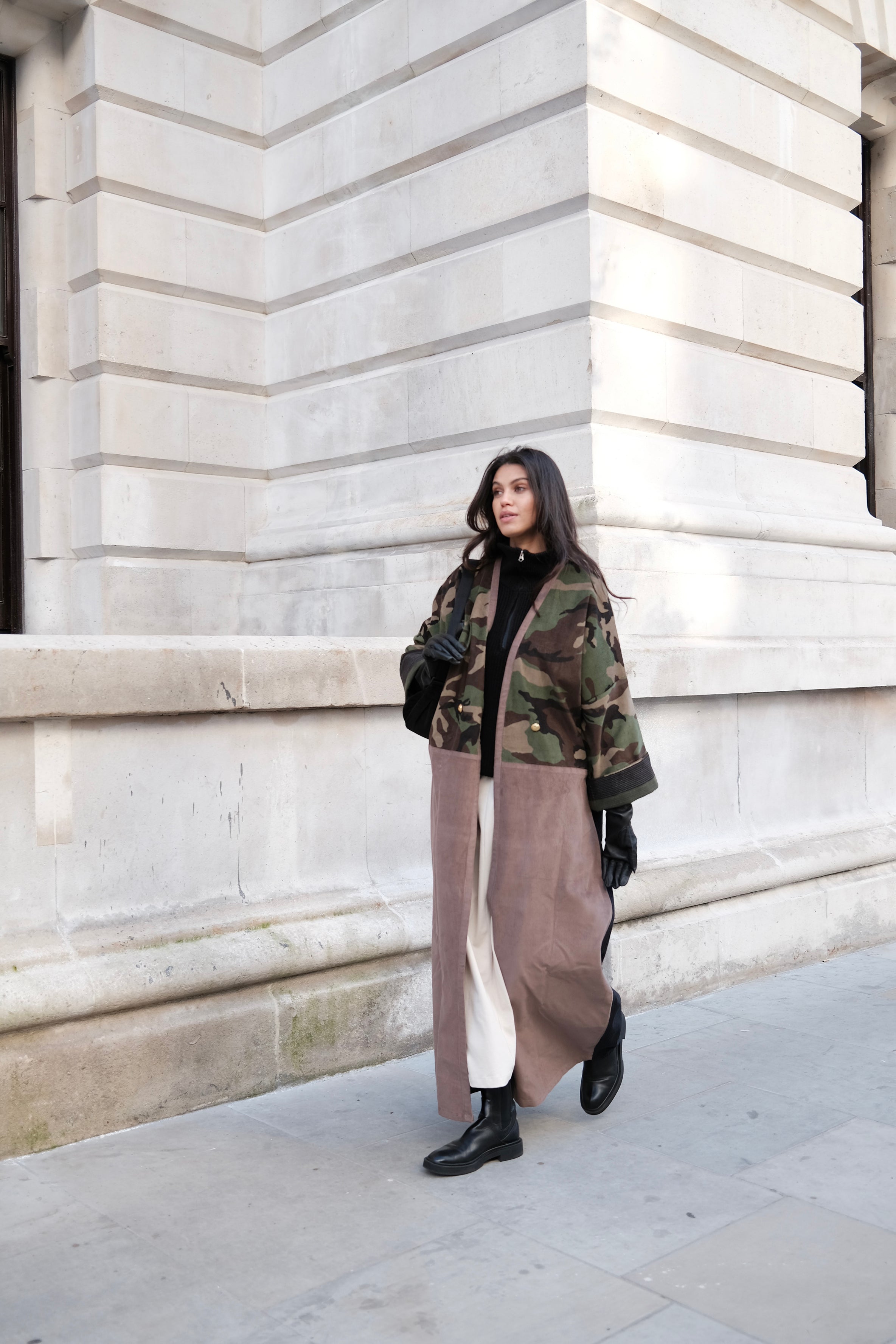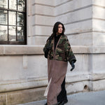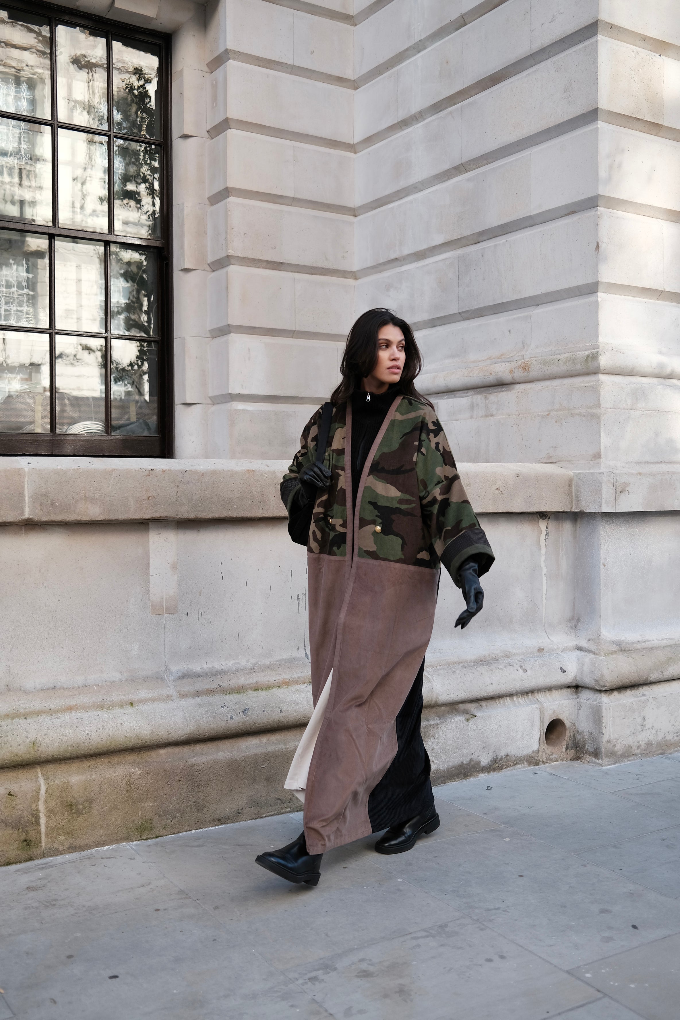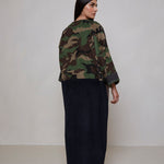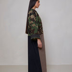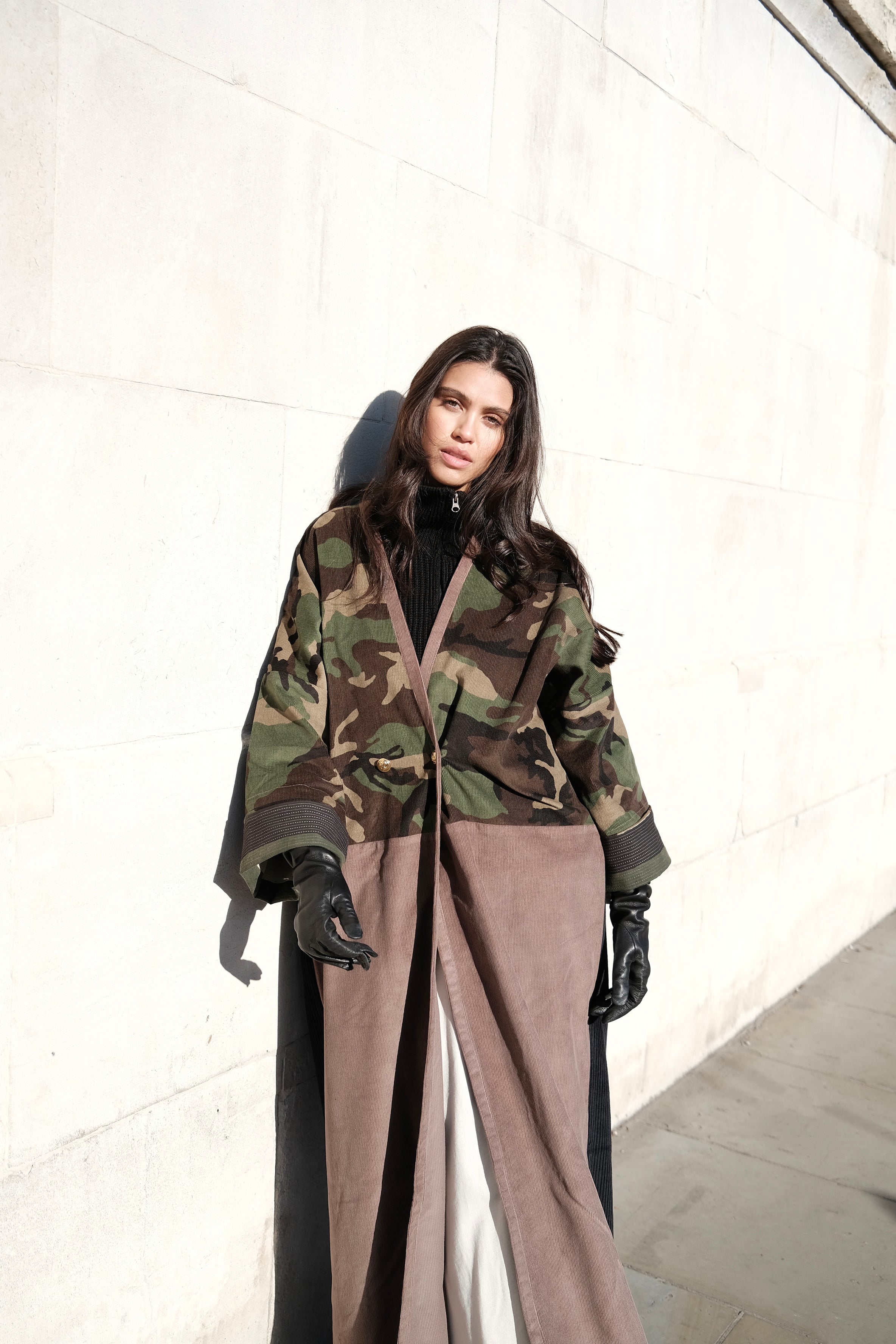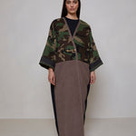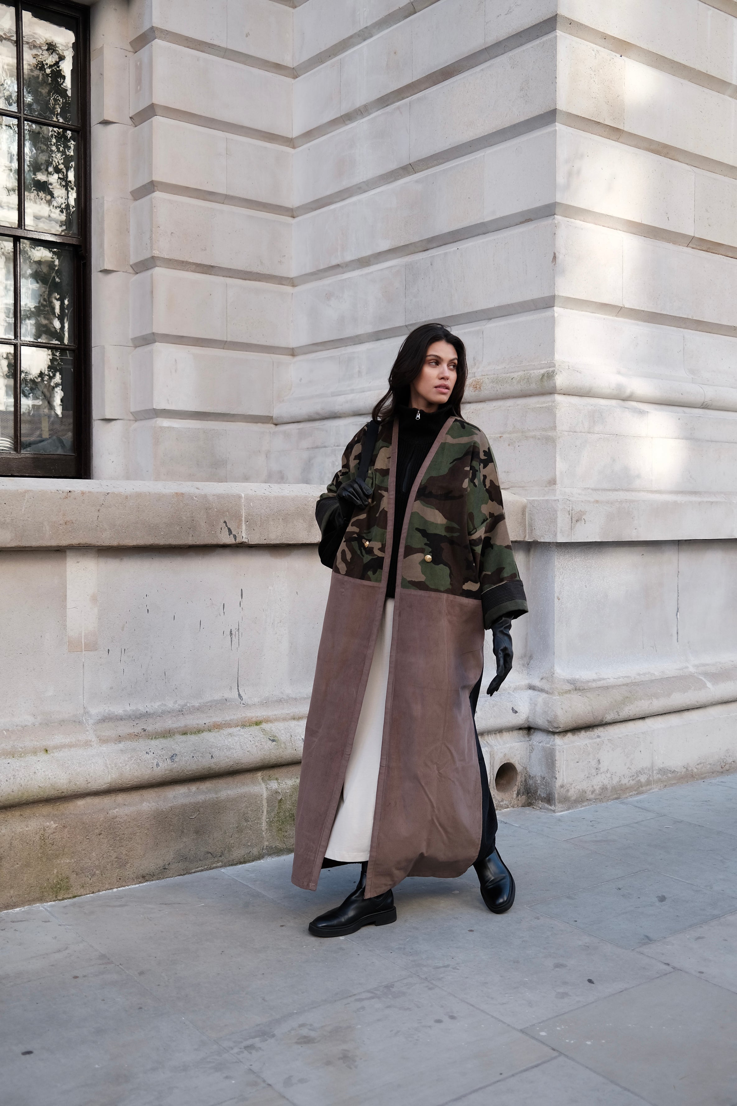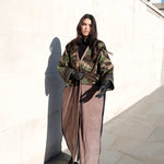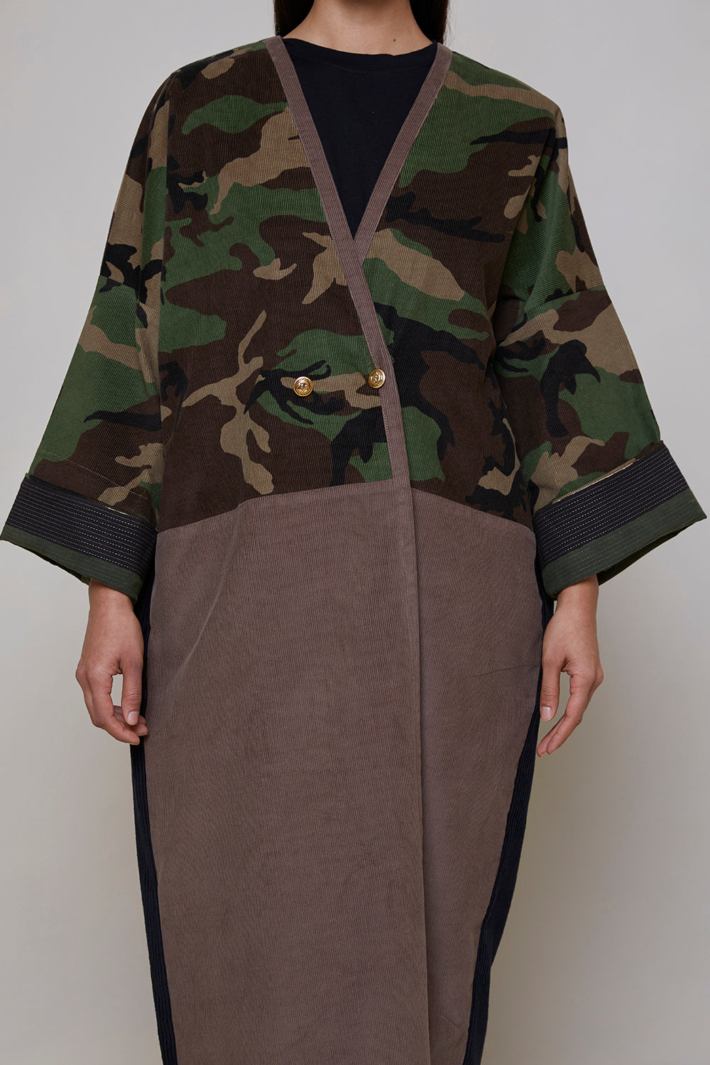 Camouflage print European corduroy abaya with double-breast opening. Finished with vintage buttons and Indian block printed cotton cuff facing.