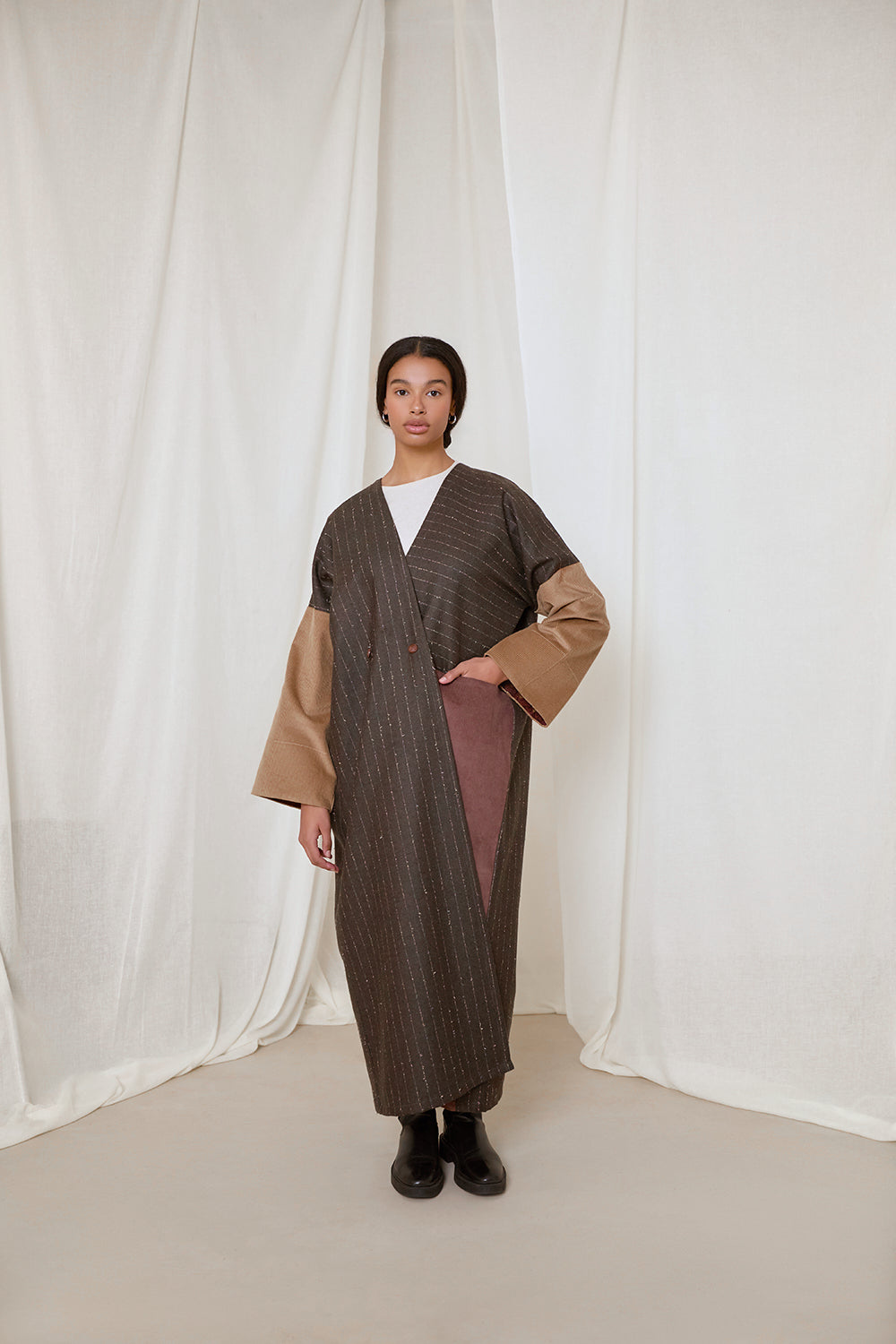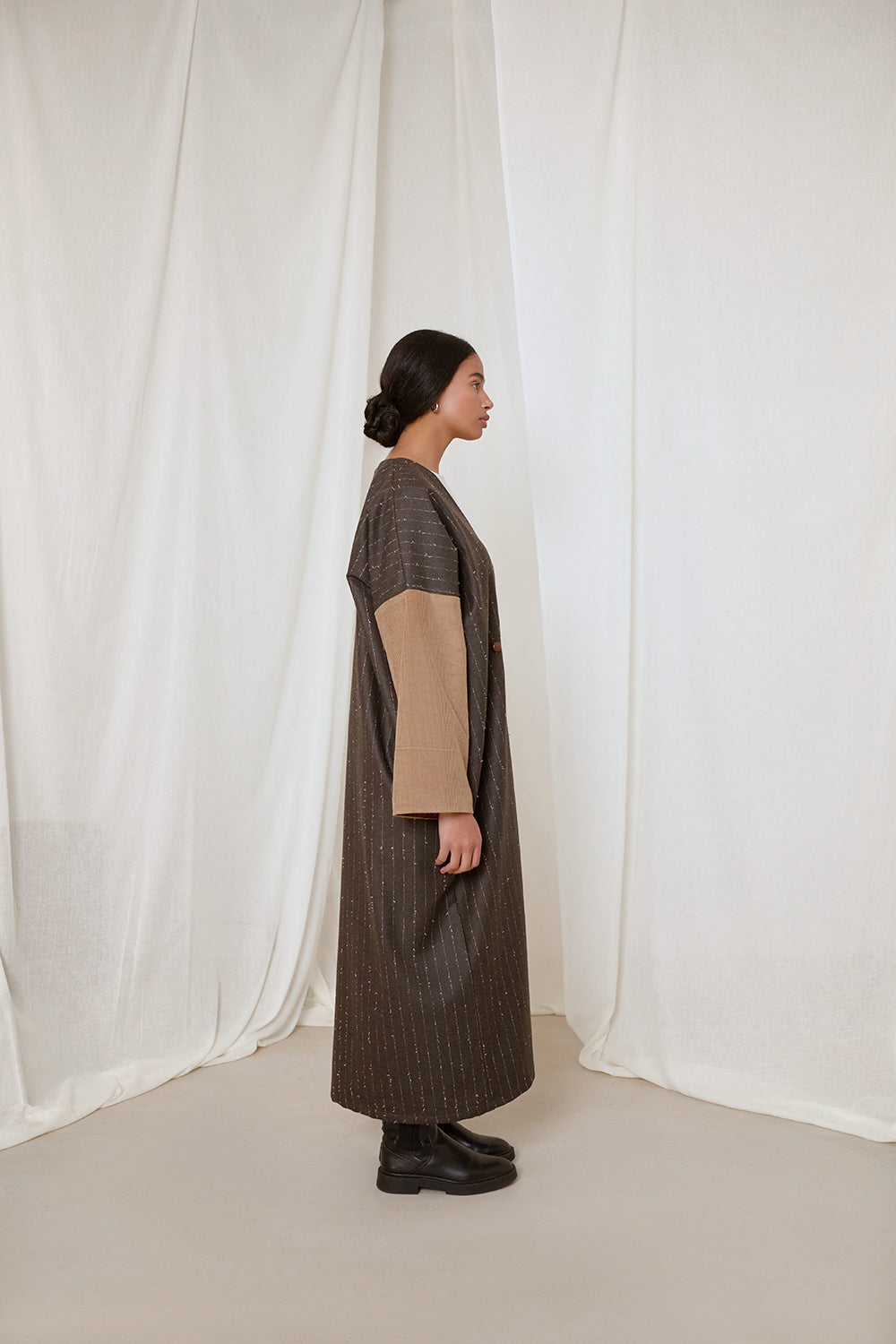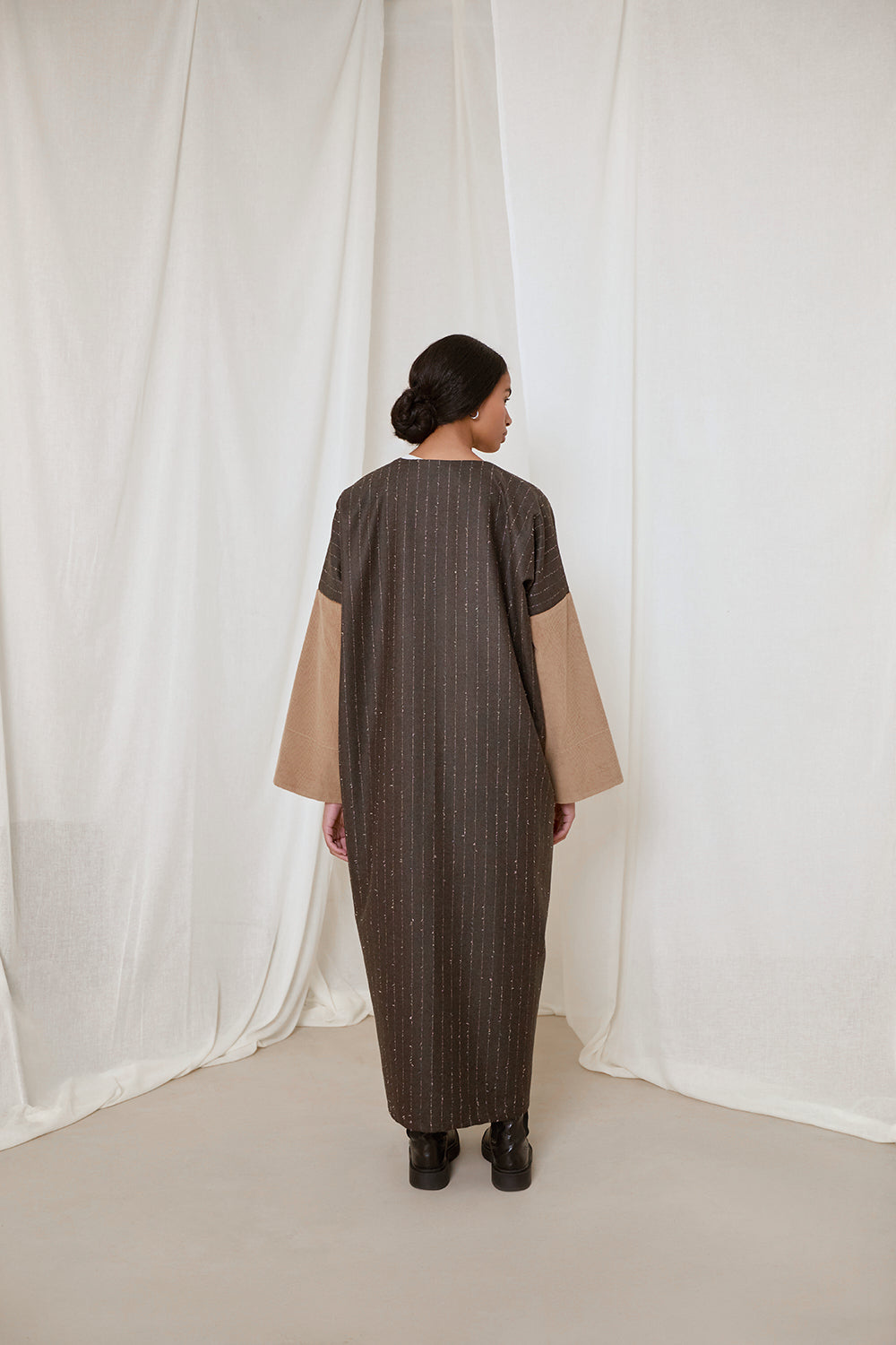 Textured stripe wool  and cotton corduroy abaya. Finished with an insert pocket.