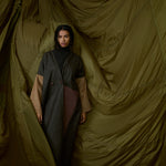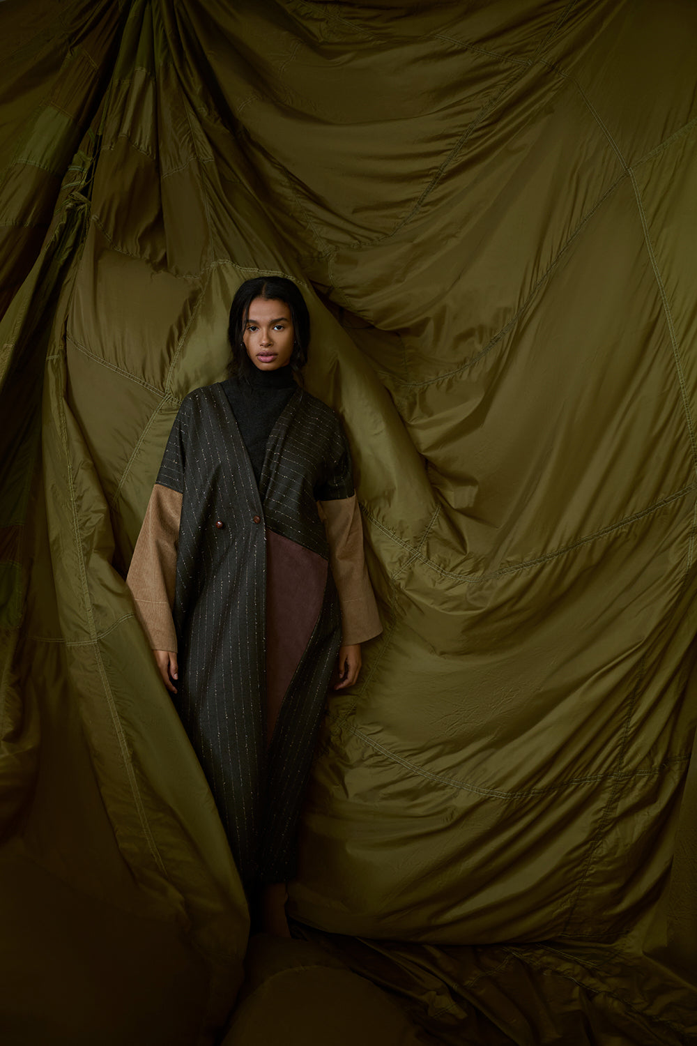 What we did: We have have specially hand selected all the components for this abaya and absolutely love the charcoal pinstripe wool that has raised yarns to create texture.
