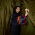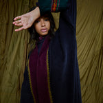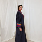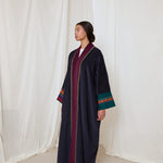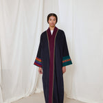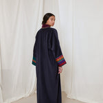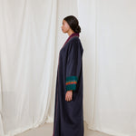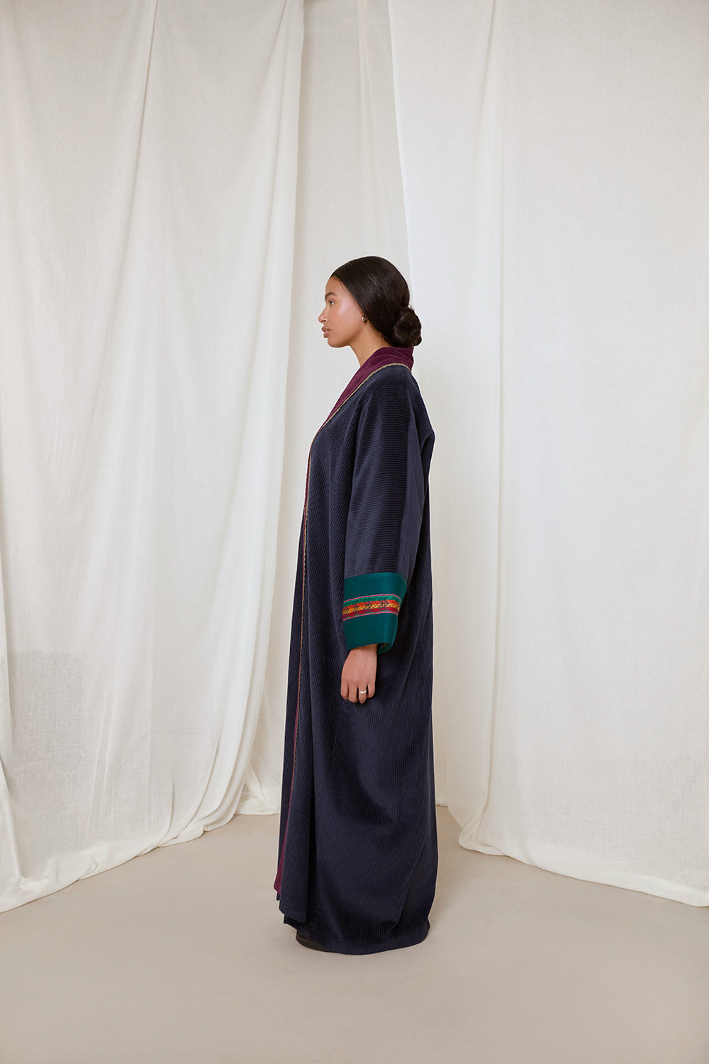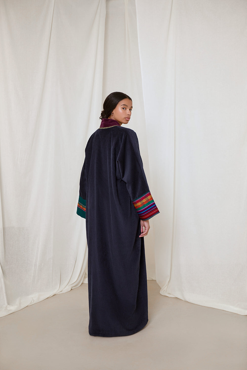 Cotton corduroy abaya in a kimono inspire silhouette, finished with beautiful cuffs, made using material sourced from South America, and embroidered trim detail from Pakistan.