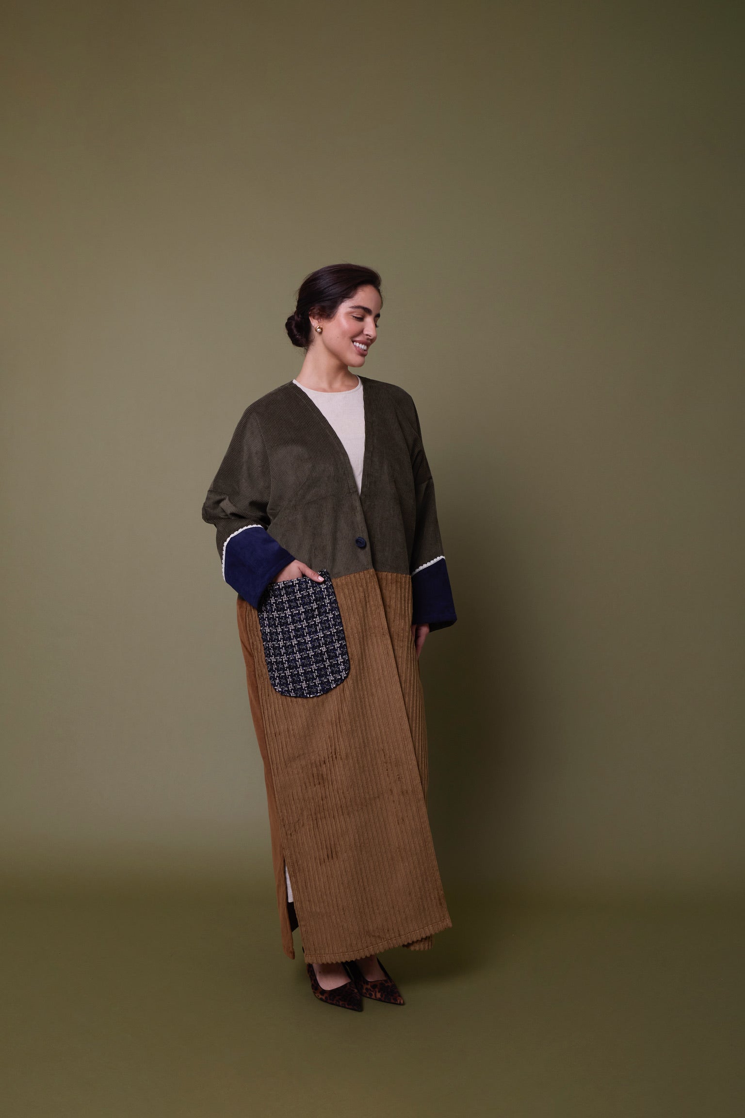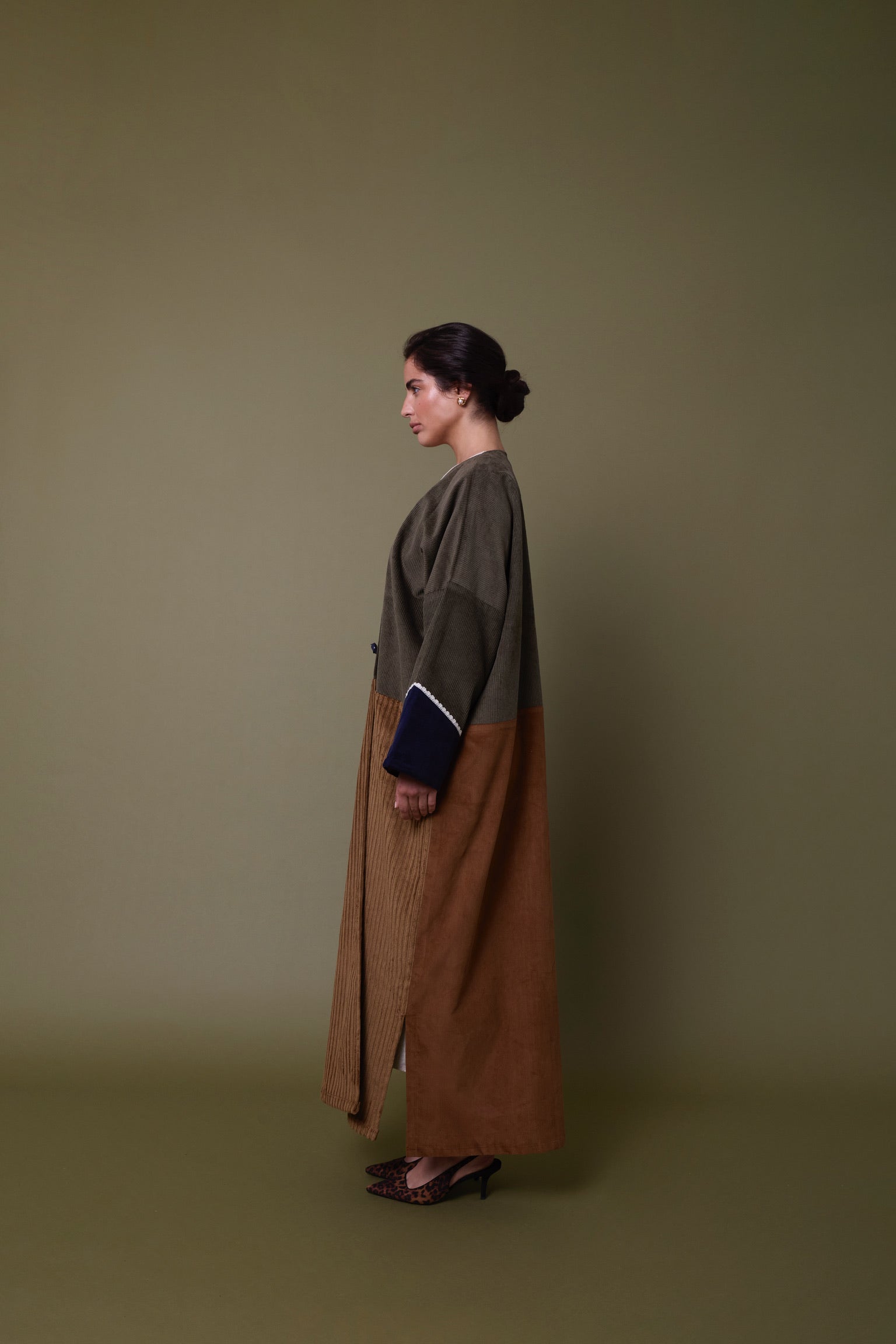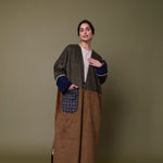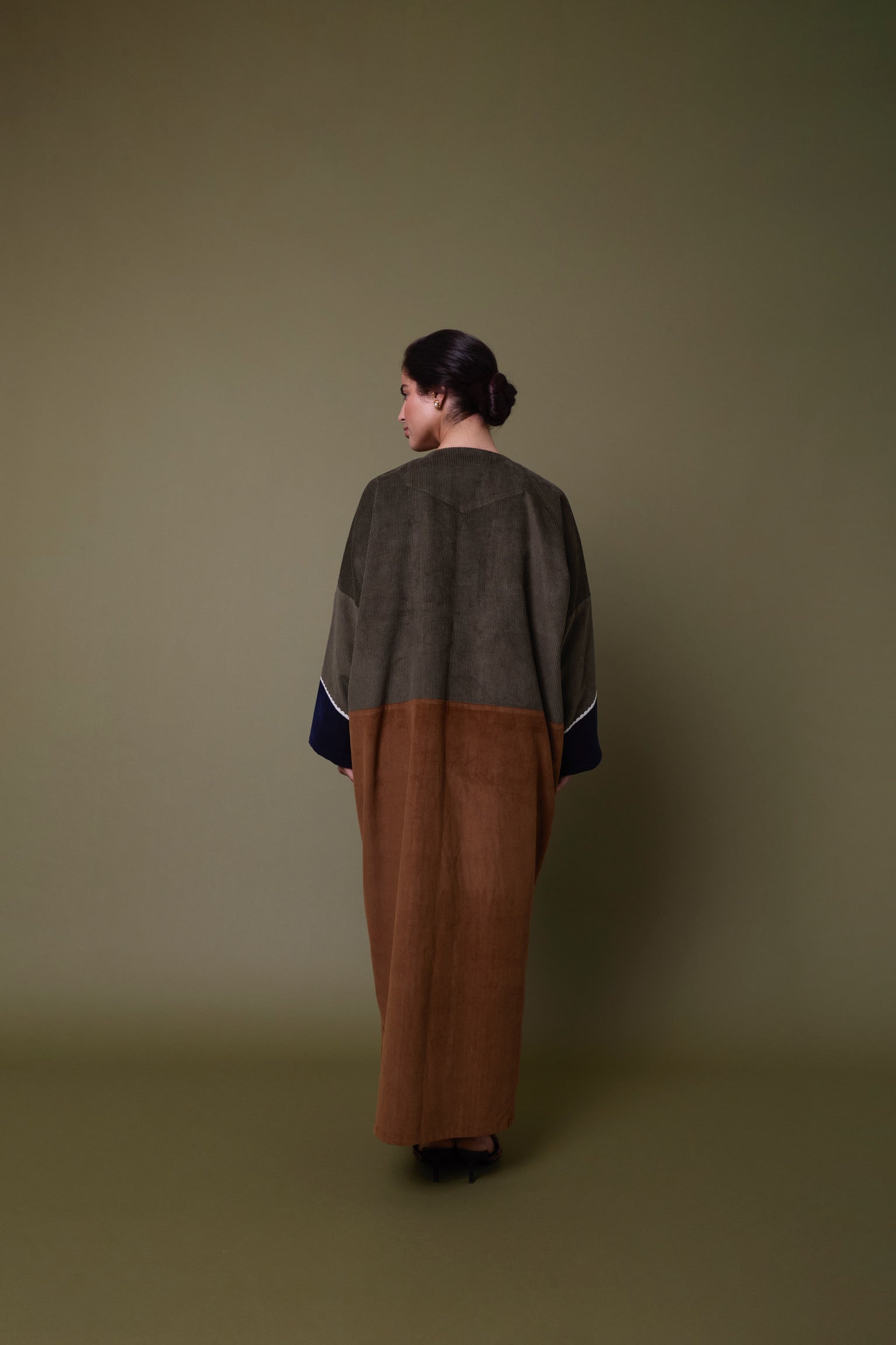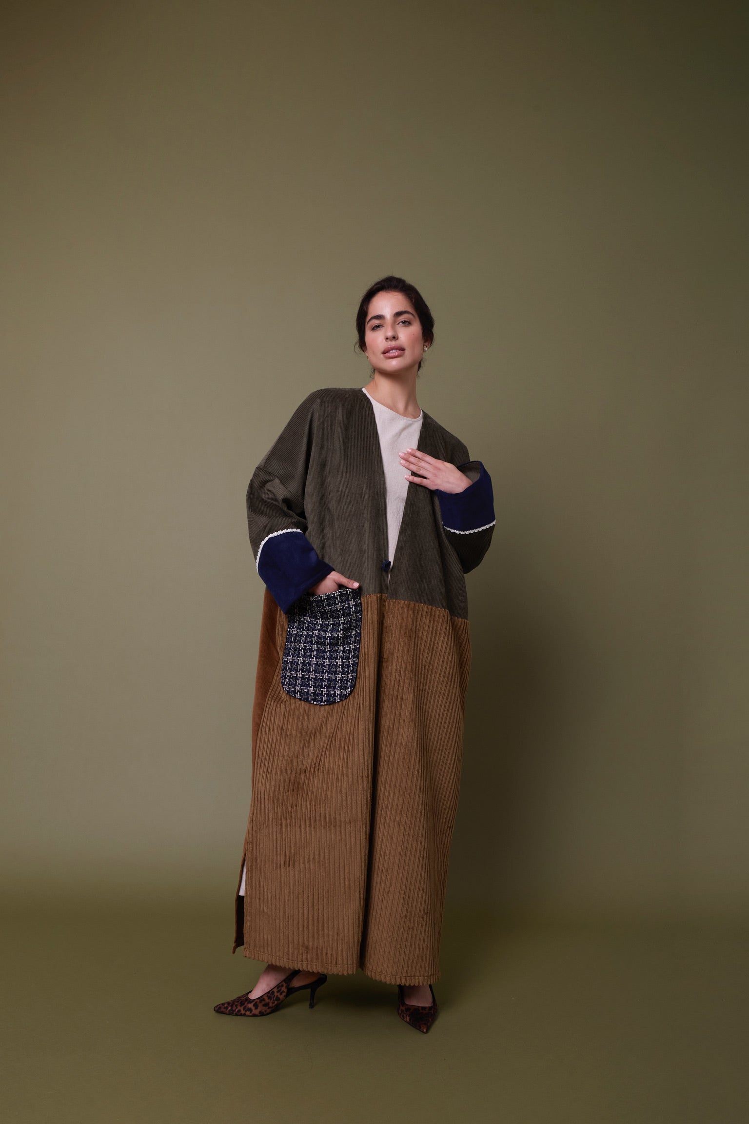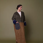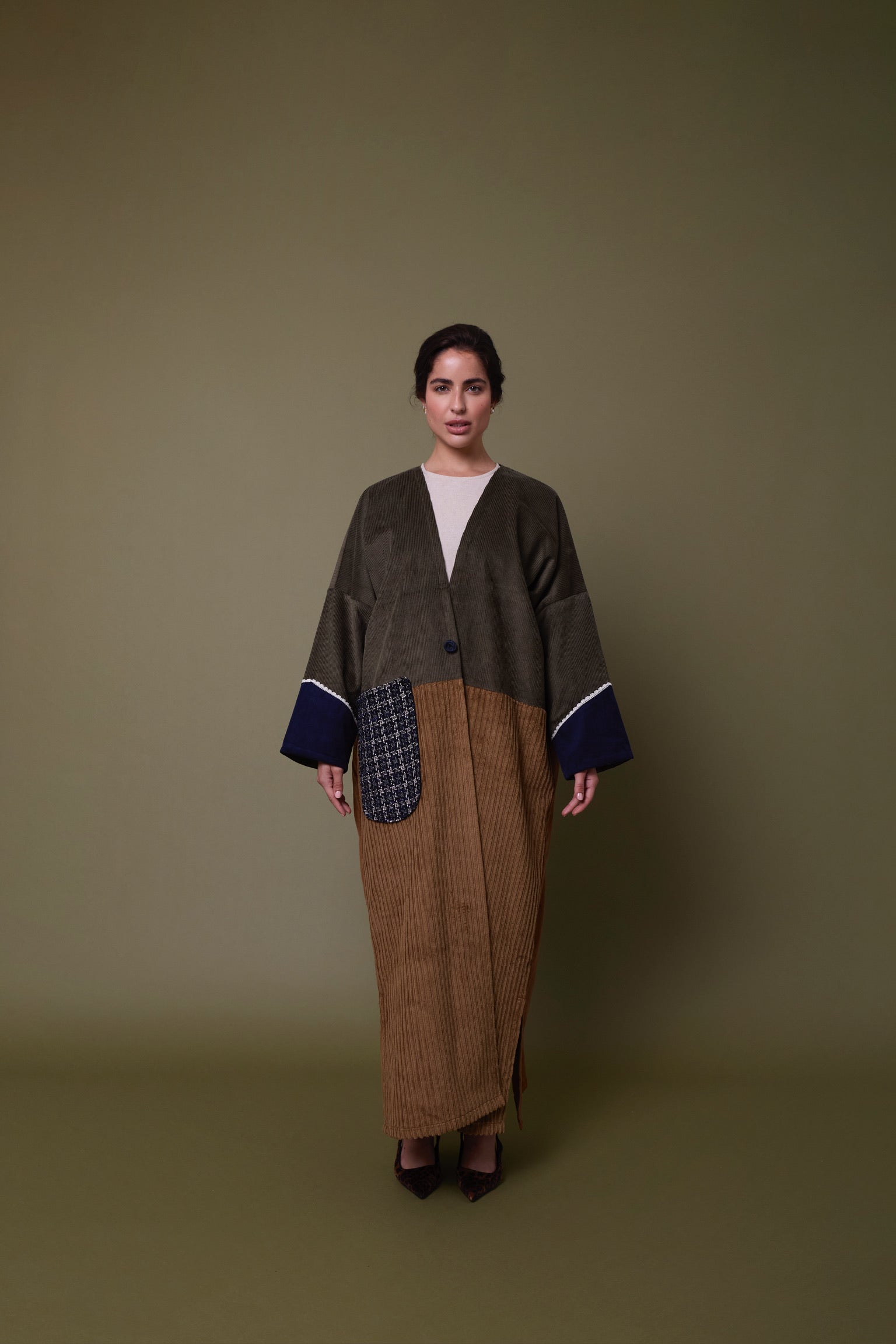 Cotton corduroy abaya handcrafted in fine, medium and jumbo corduroy depths. Finished with lace trim details and a wool mix, textured pocket.  This abaya features a vintage button with a handmade buttonhole.