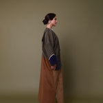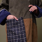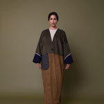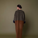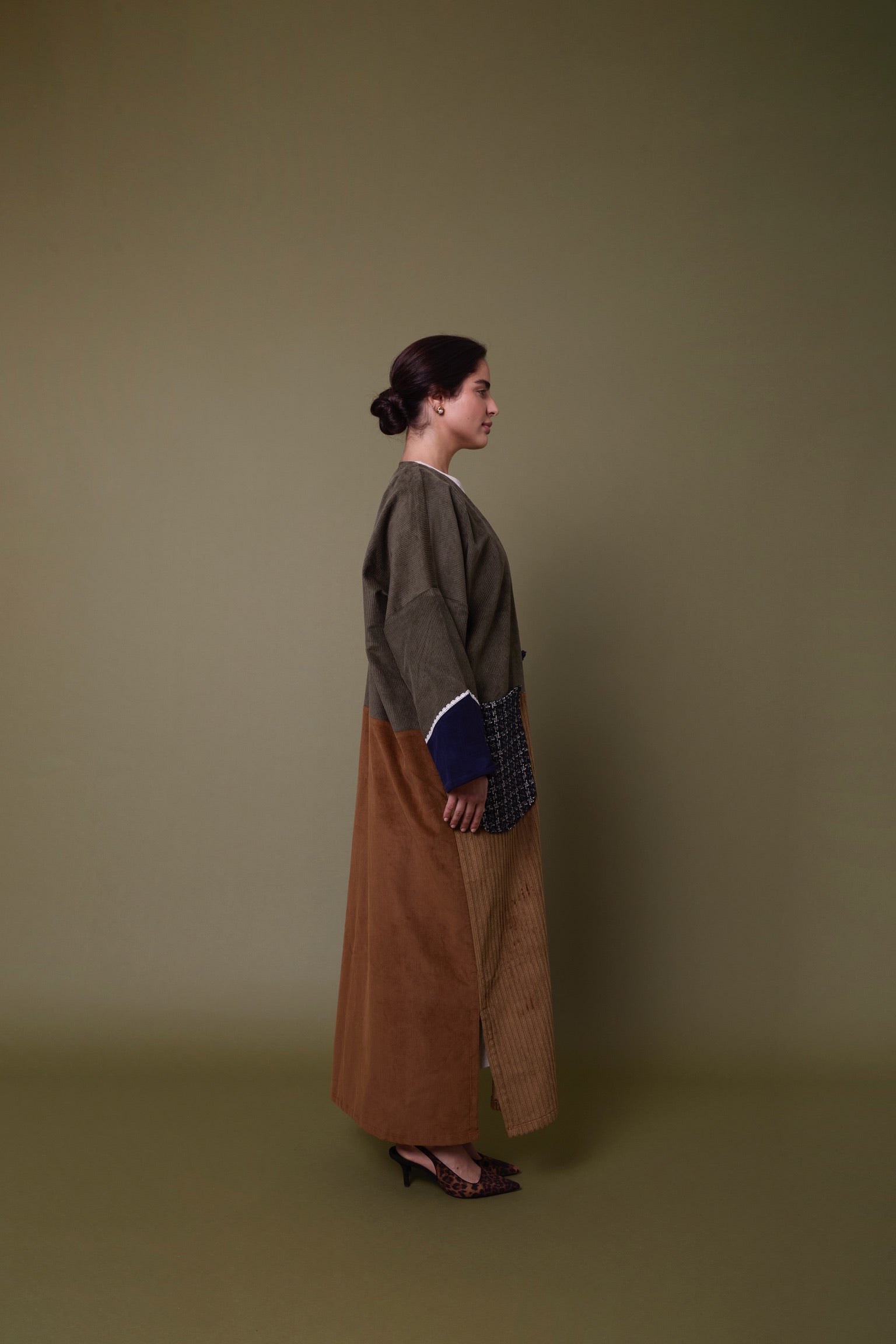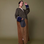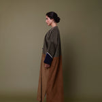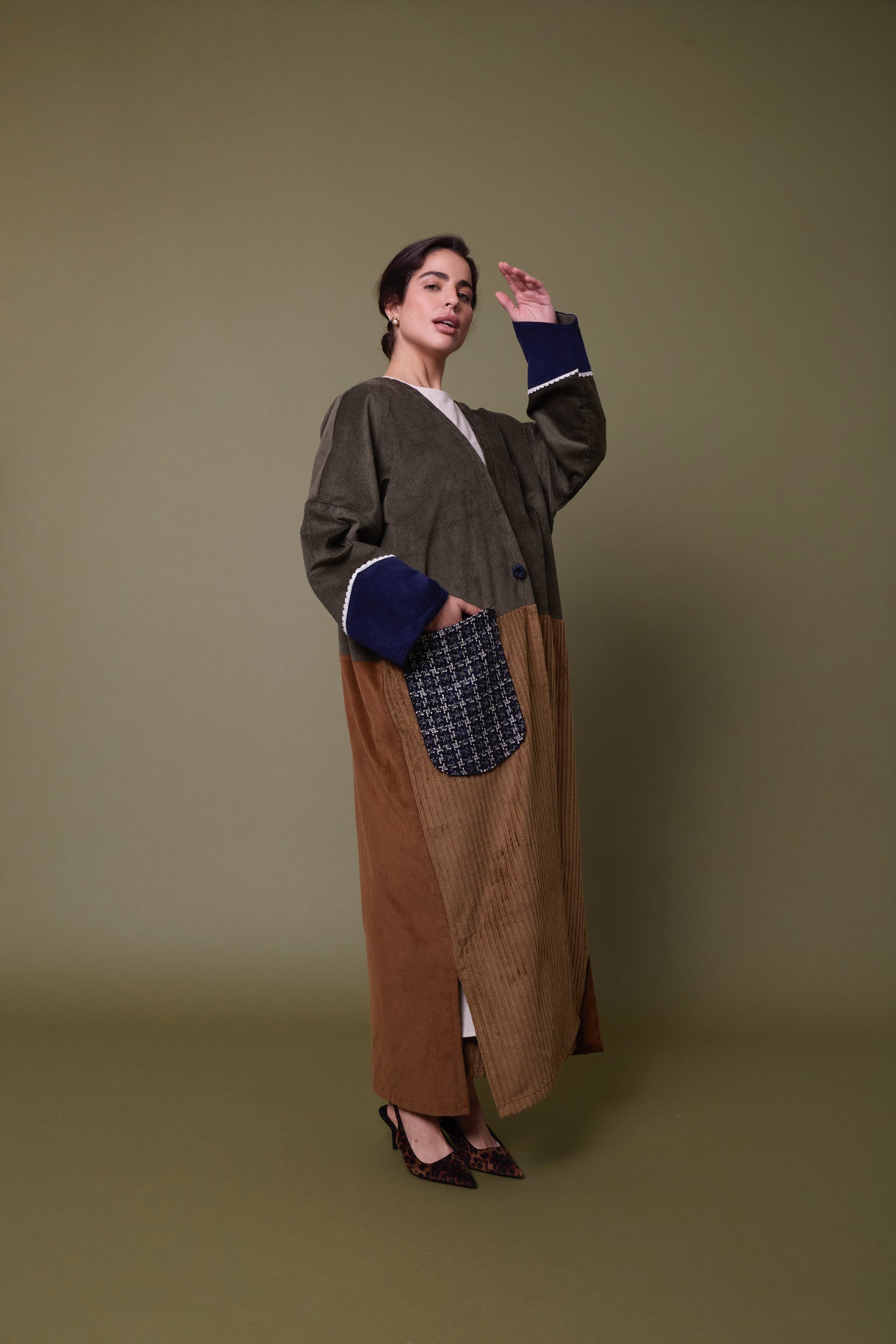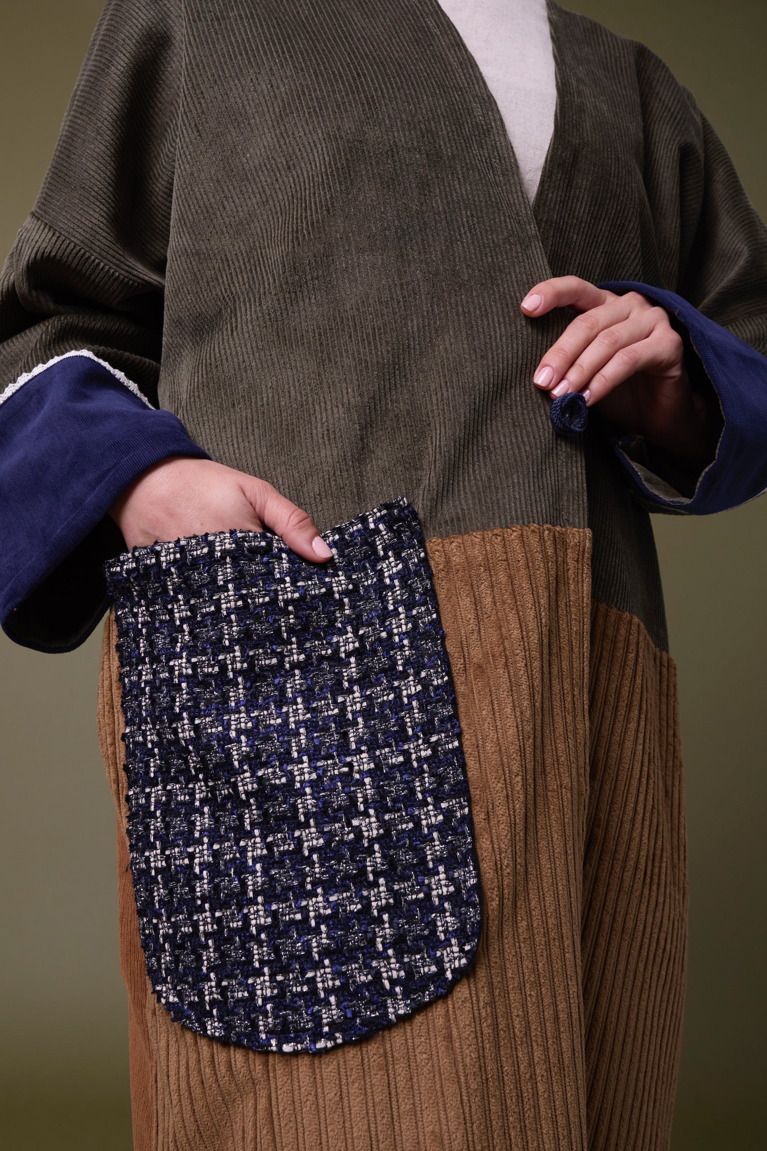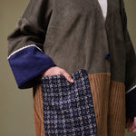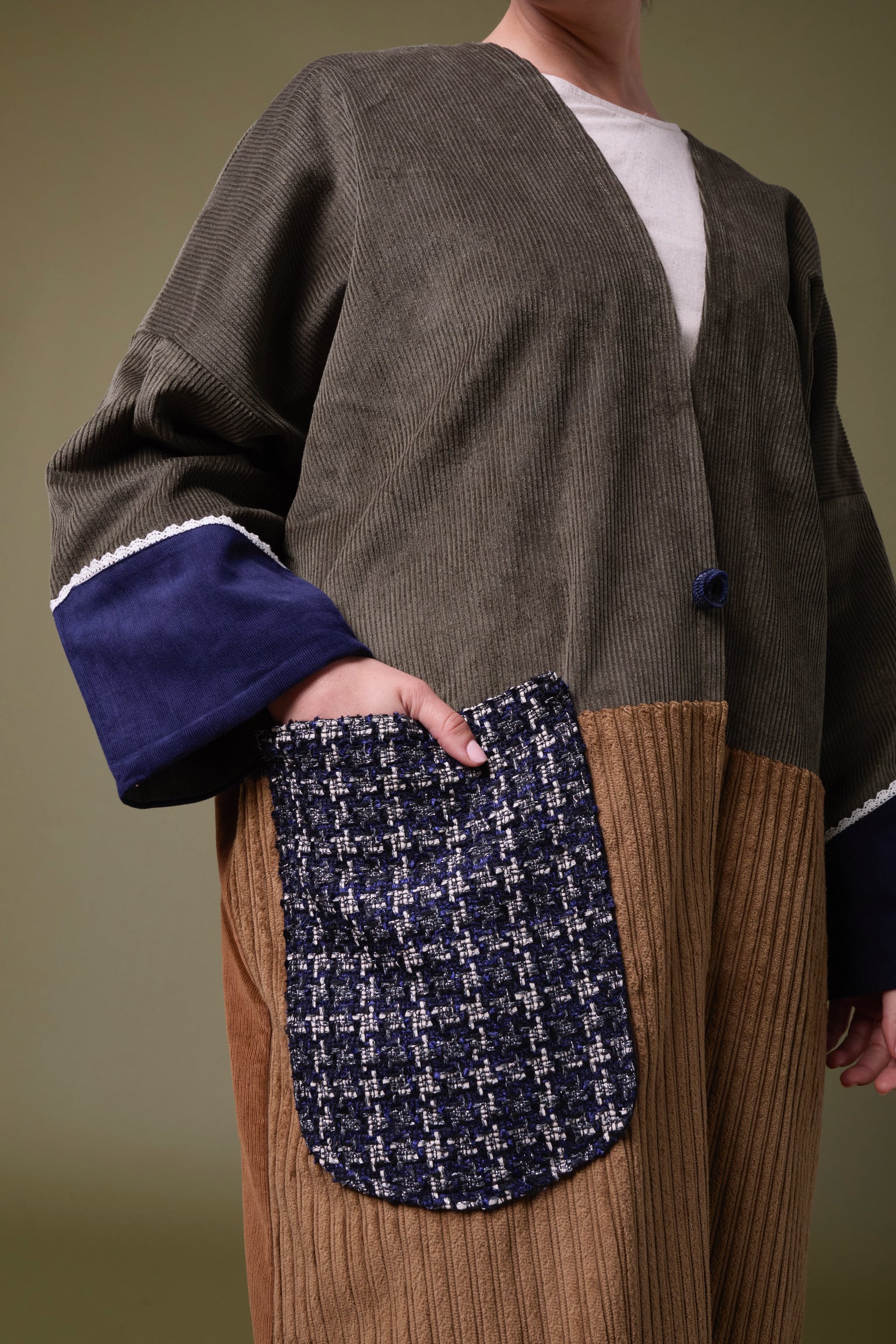 Cotton corduroy abaya handcrafted in fine, medium and jumbo corduroy depths. Finished with lace trim details and a wool mix, textured pocket.  This abaya features a vintage button with a handmade buttonhole.