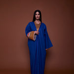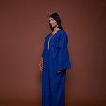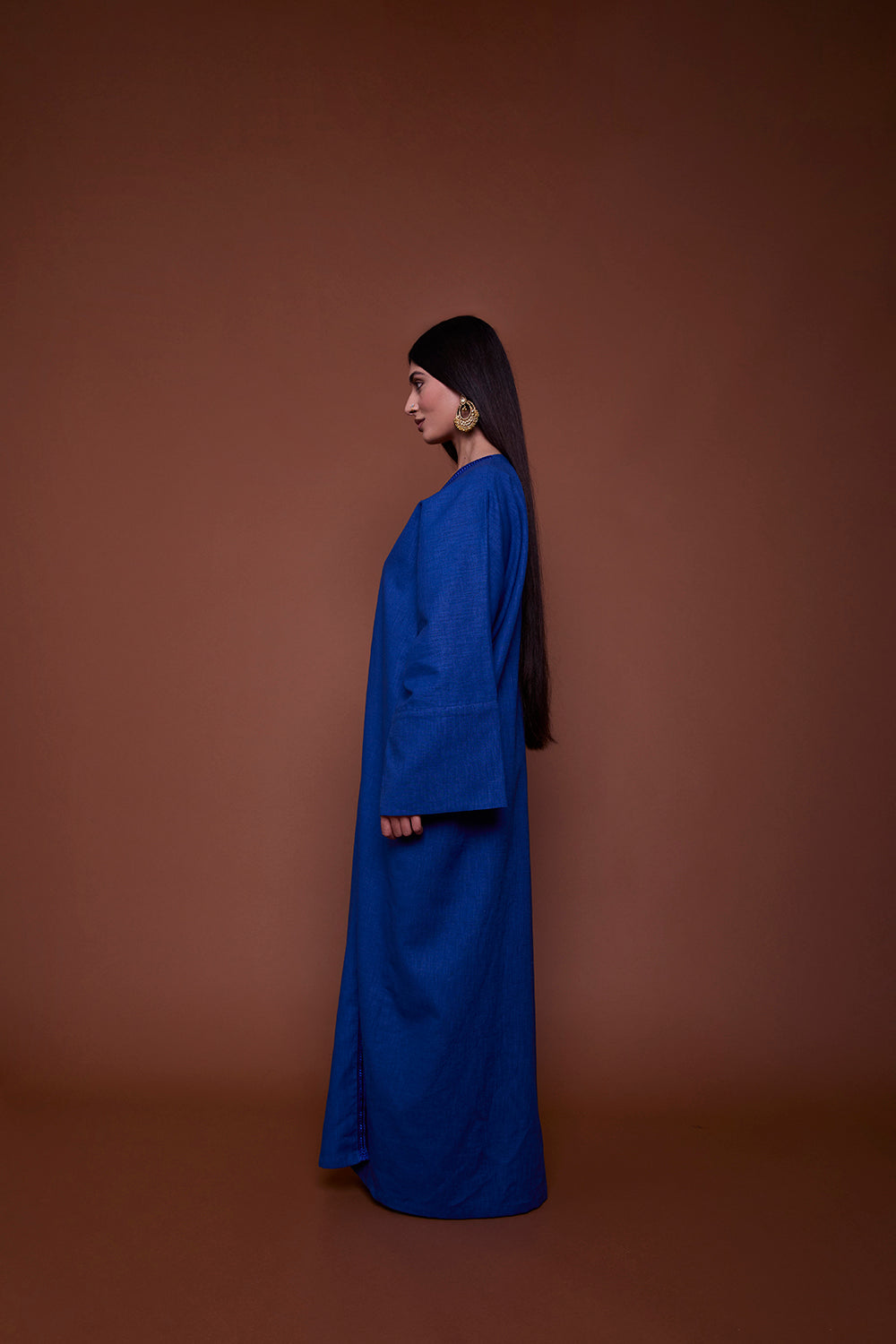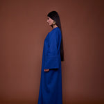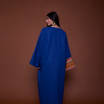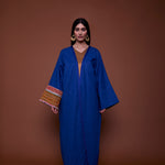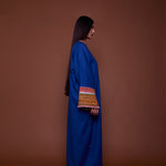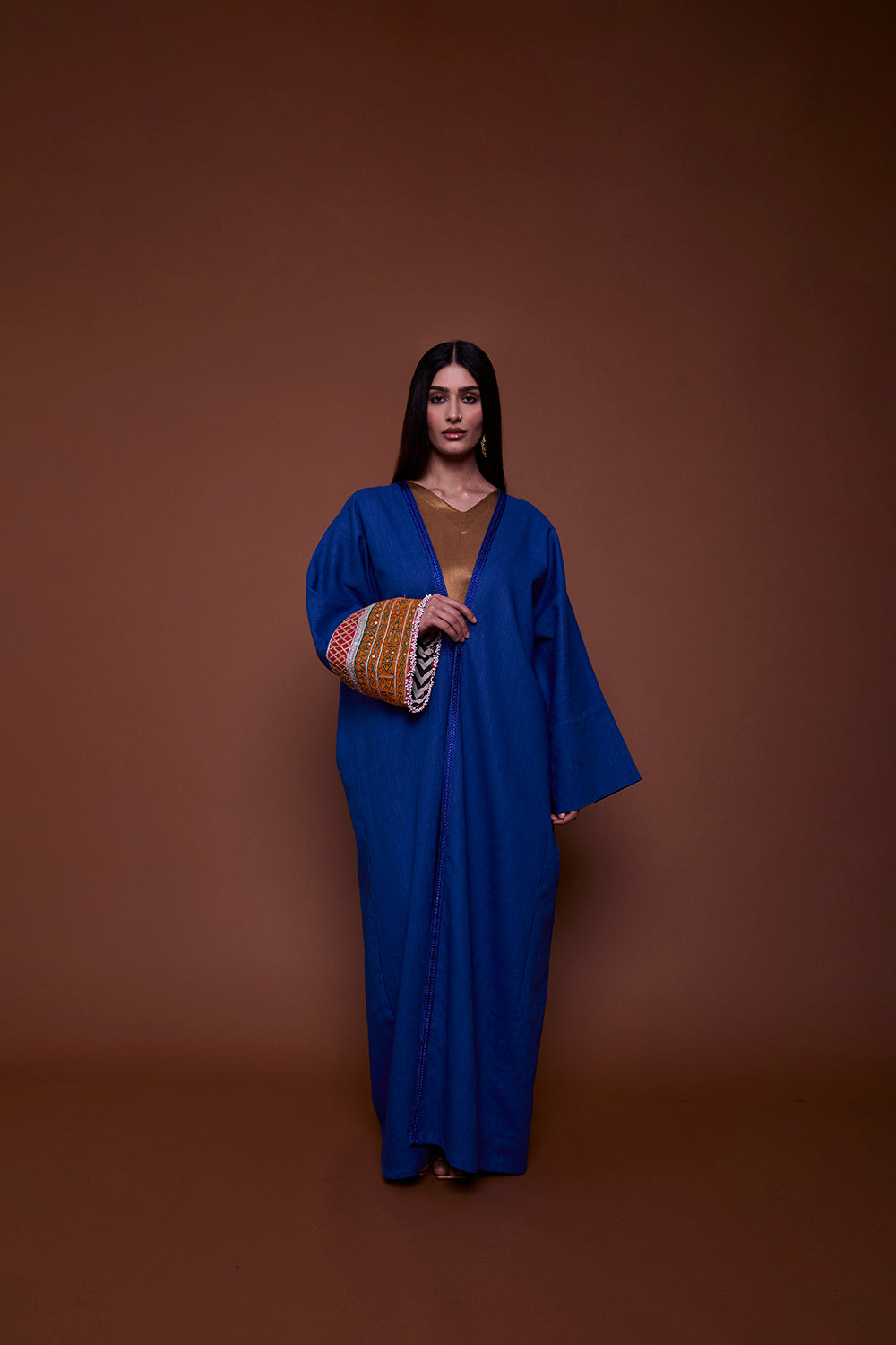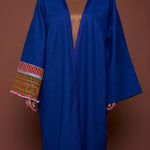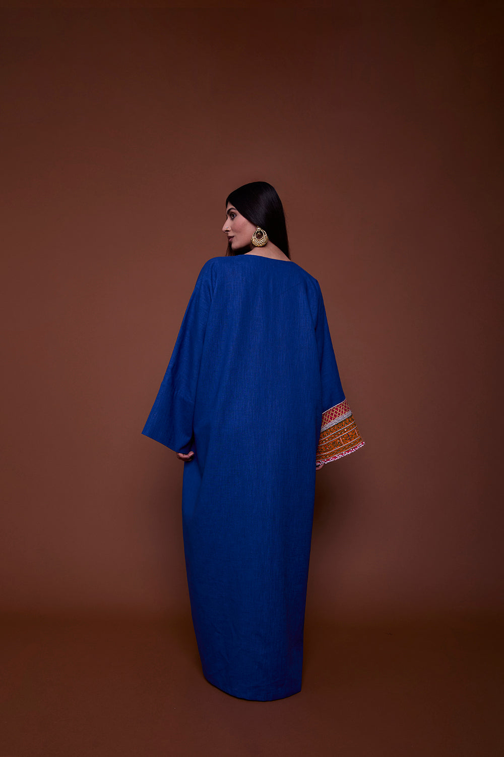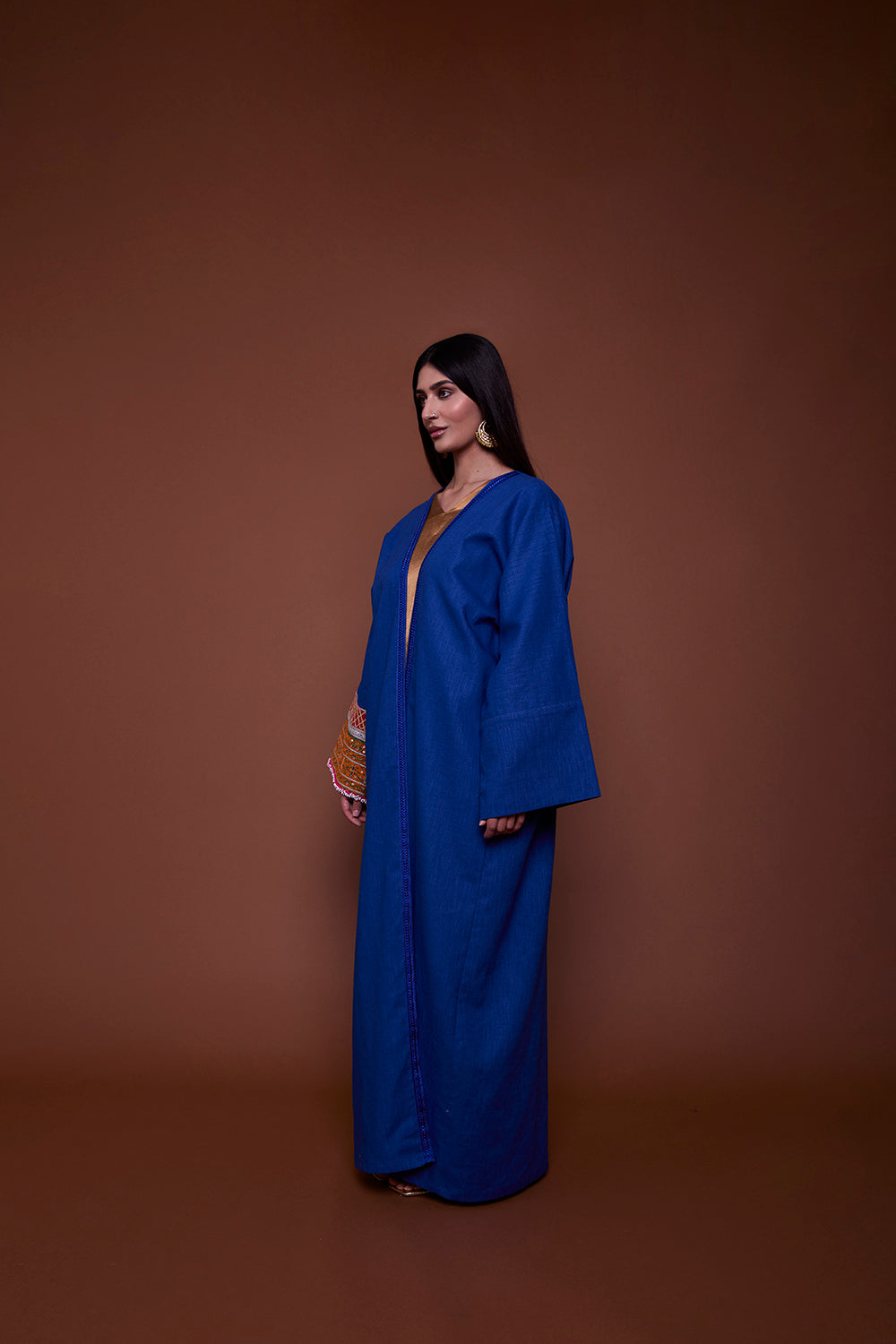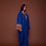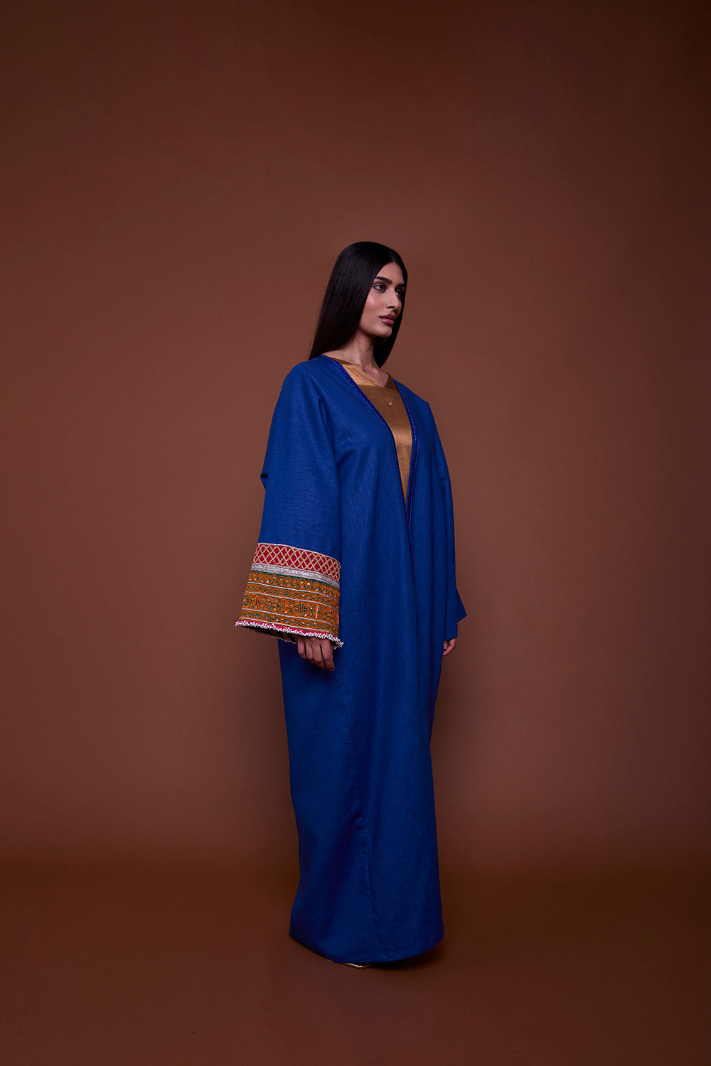 Linen abaya with vintage Banjara trim, sourced from India. Finished with Moroccan sfifa trim.
