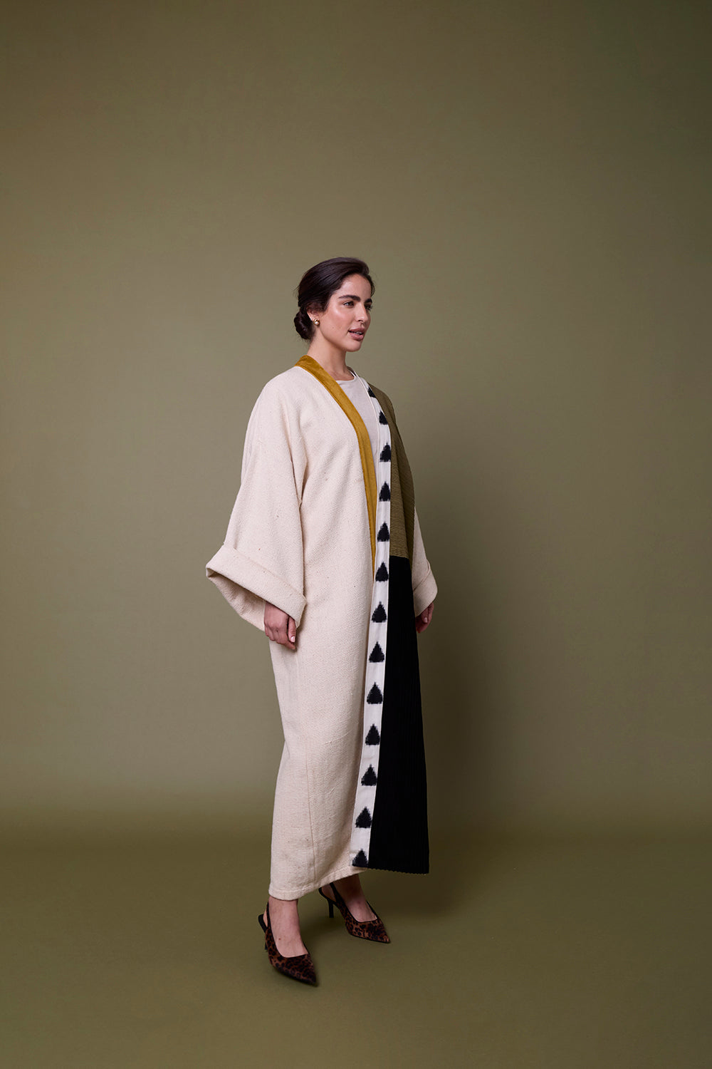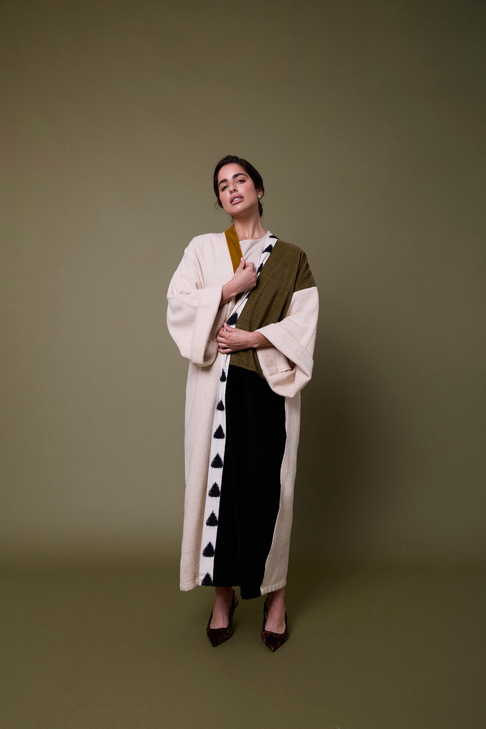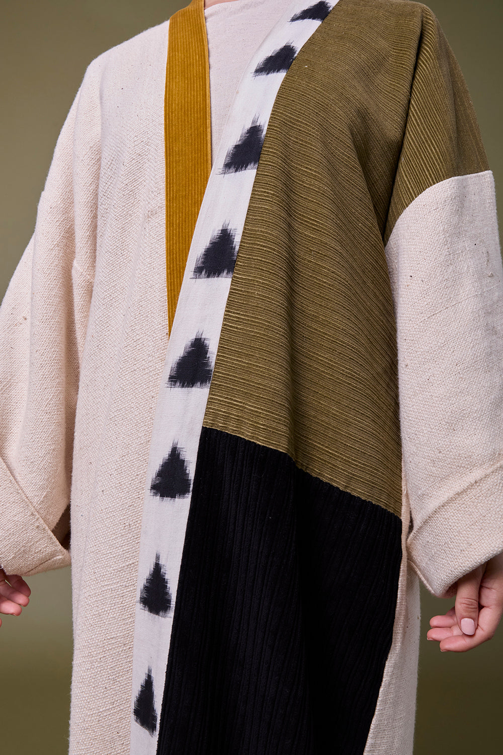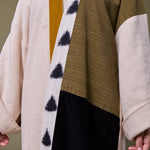 Hand woven, untreated and natural Indian cotton and luxurious cotton corduroy kimono. Finished with warm mustard hue and Indian ikat cotton collar.