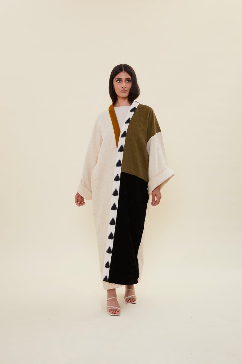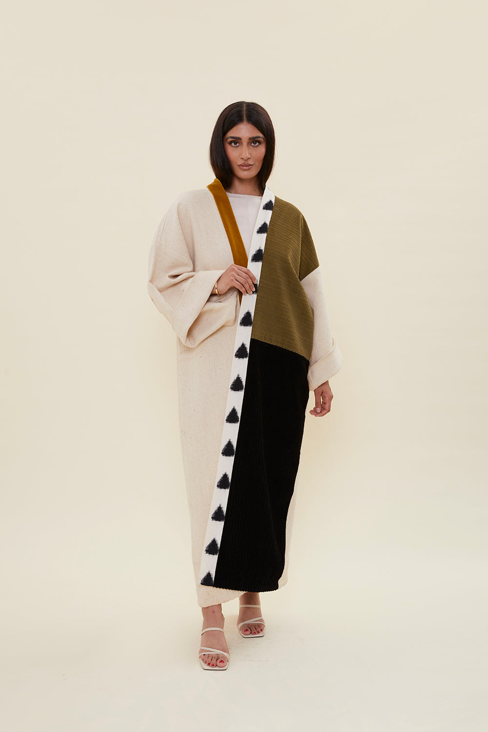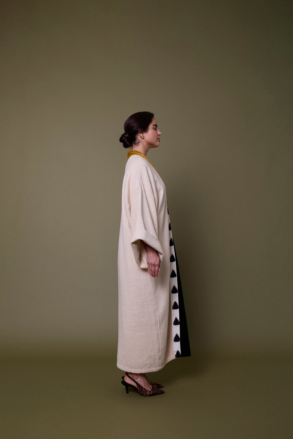Hand woven, untreated and natural Indian cotton and luxurious cotton corduroy kimono. Finished with warm mustard hue and Indian ikat cotton collar.