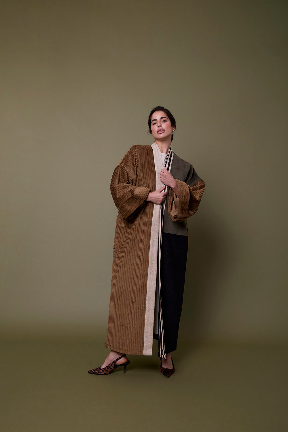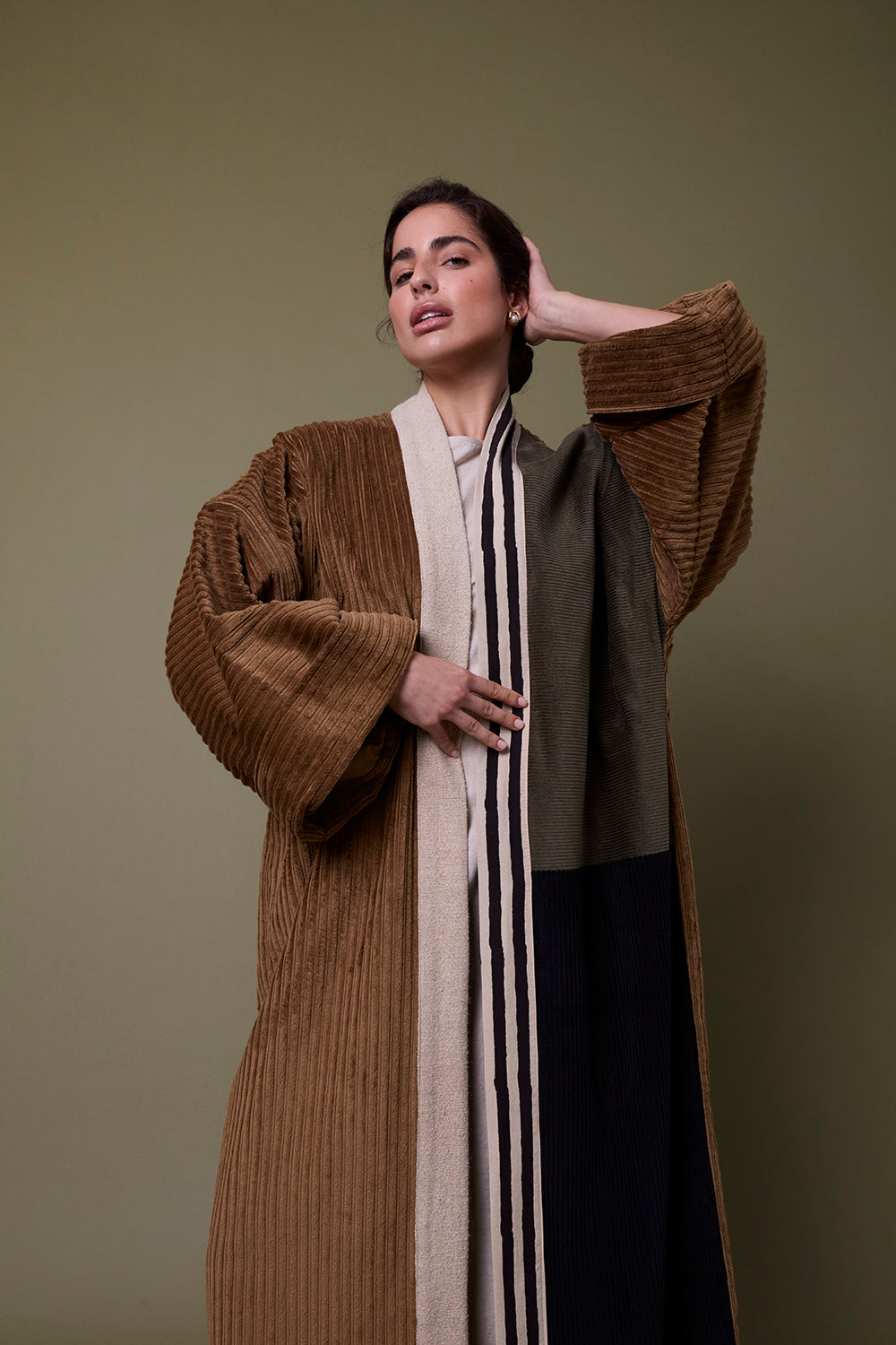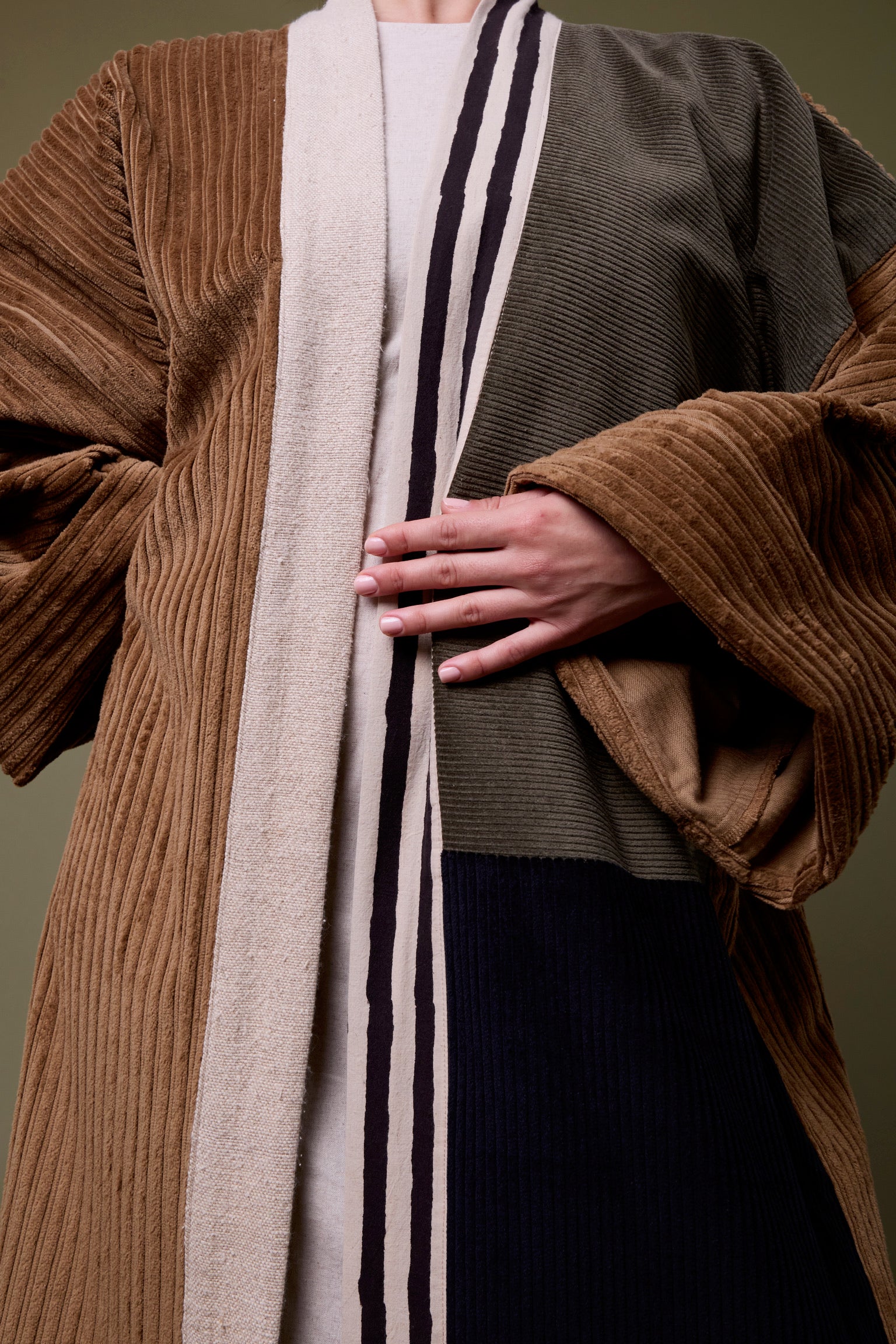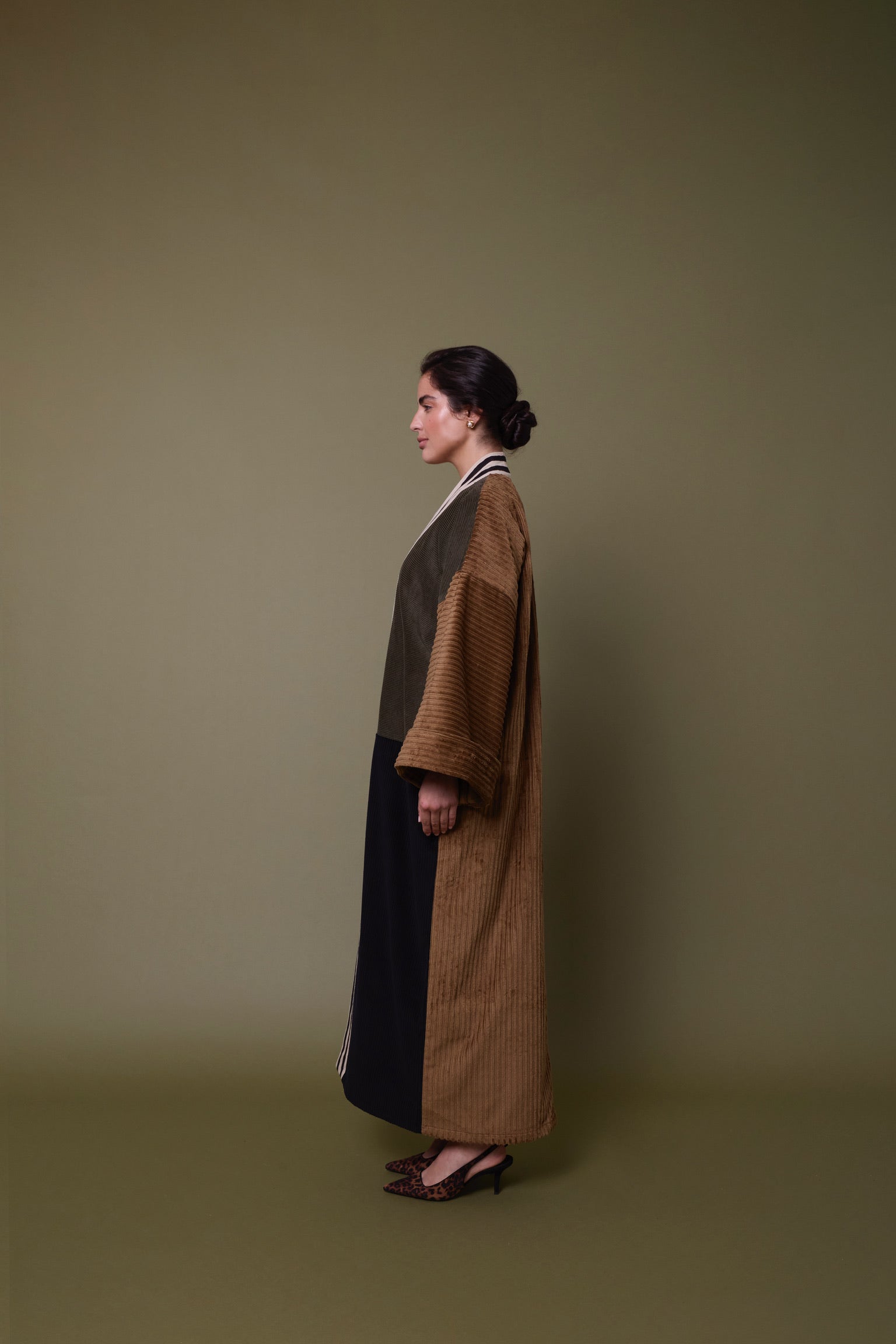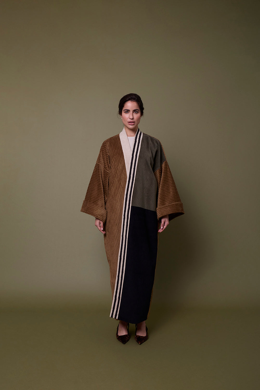 Cotton corduroy kimono abaya, finished with collar details in hemp/cotton mix and Indian block print.