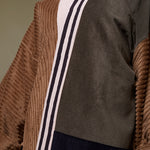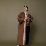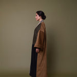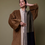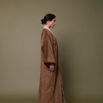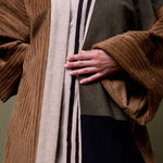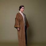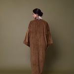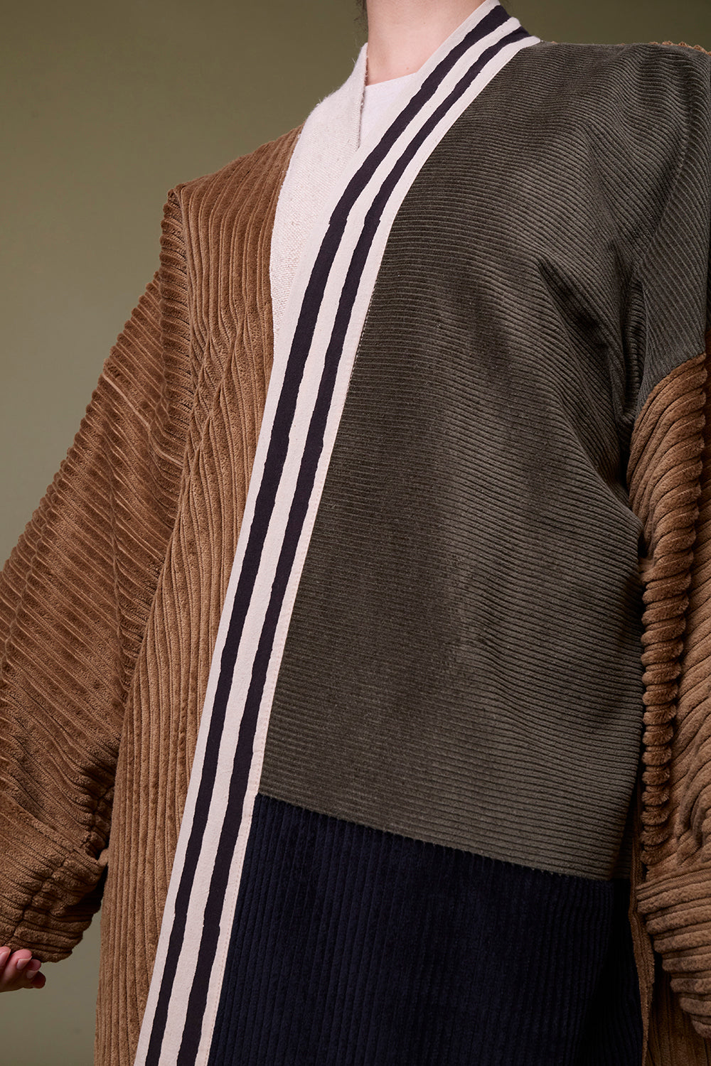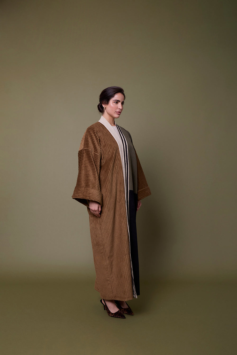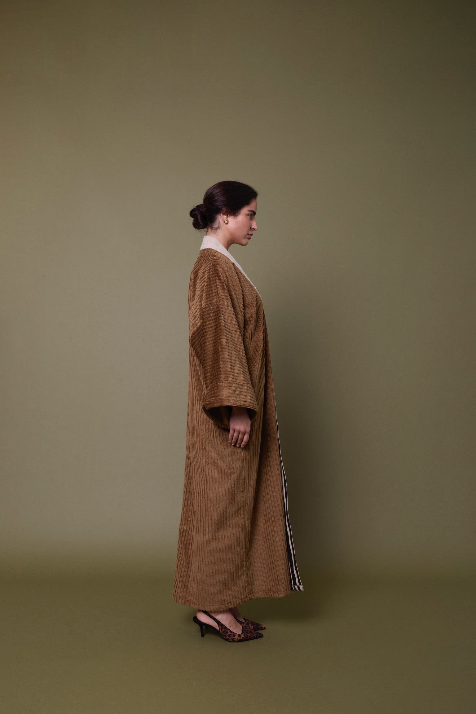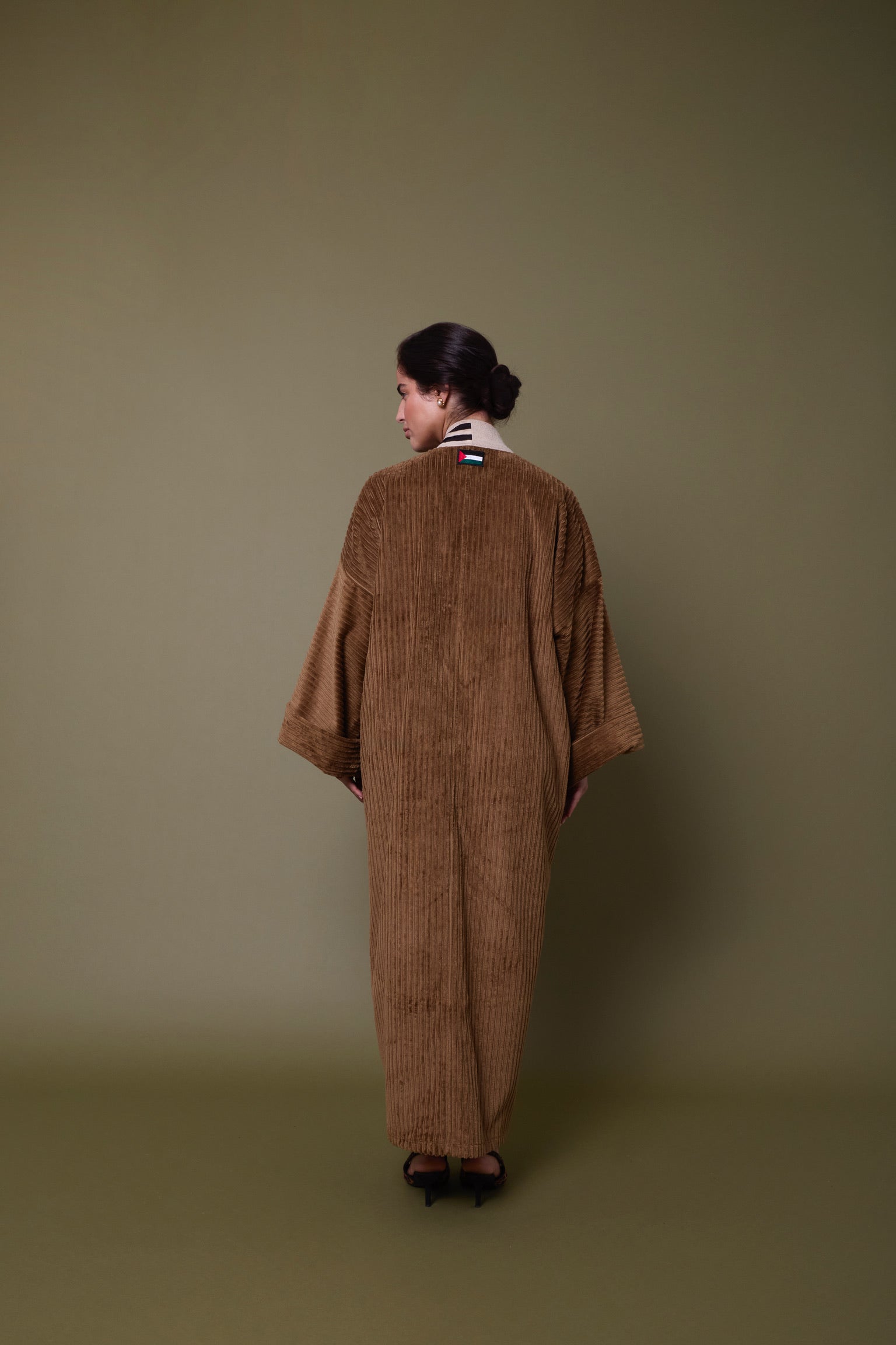 Cotton corduroy kimono abaya, finished with collar details in hemp/cotton mix and Indian block print.