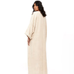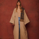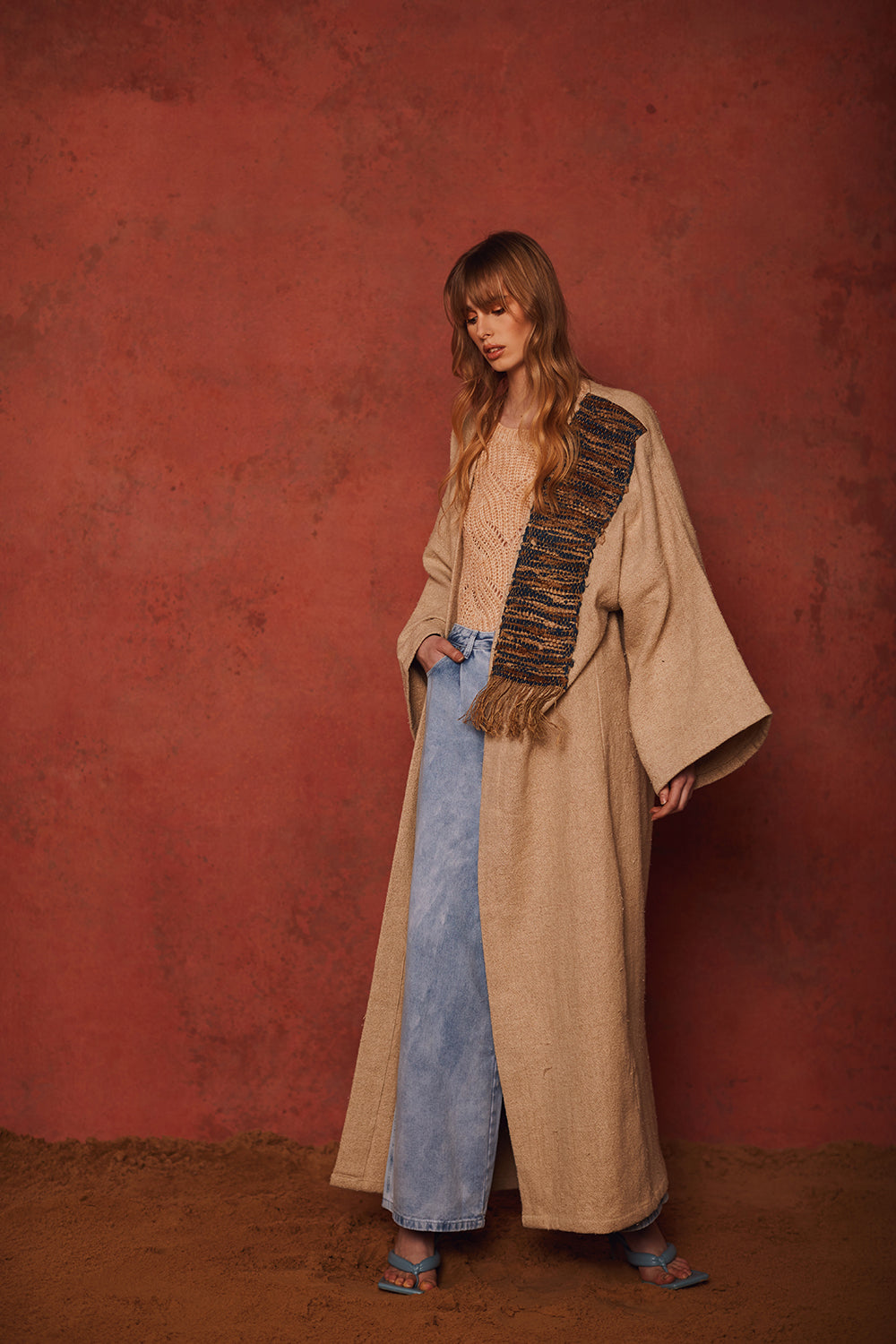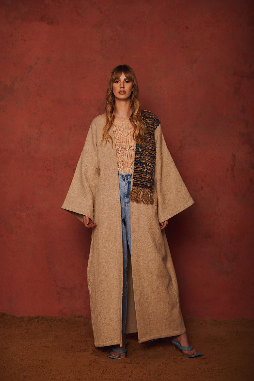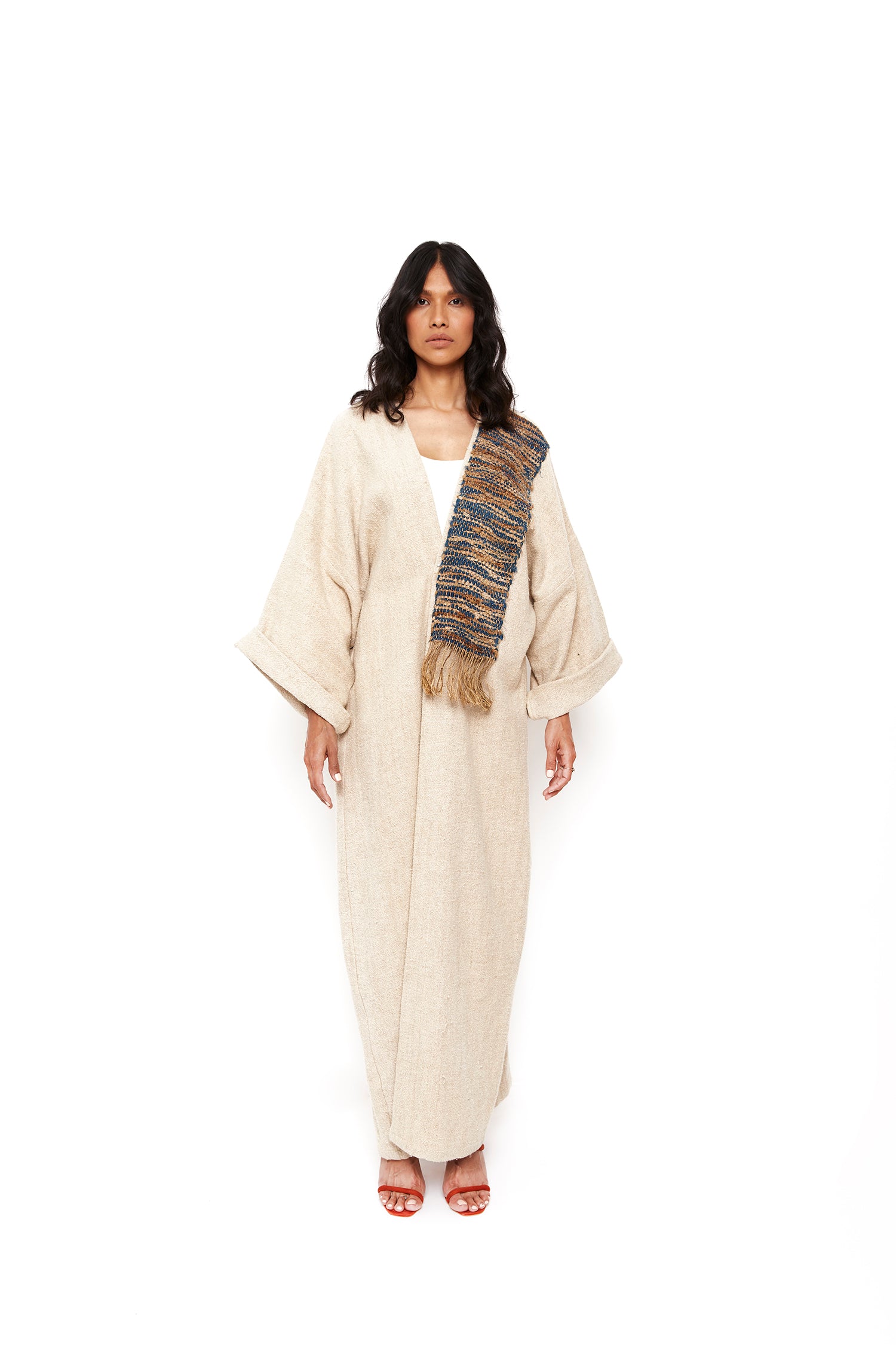 A specially developed untreated and natural hemp and cotton mix dropped shoulder abaya with a very soft and drapey handle. Handwoven in a plain weave with a beautiful slubby texture. Finished with an unusual and textured woven trim.