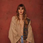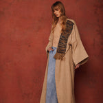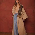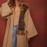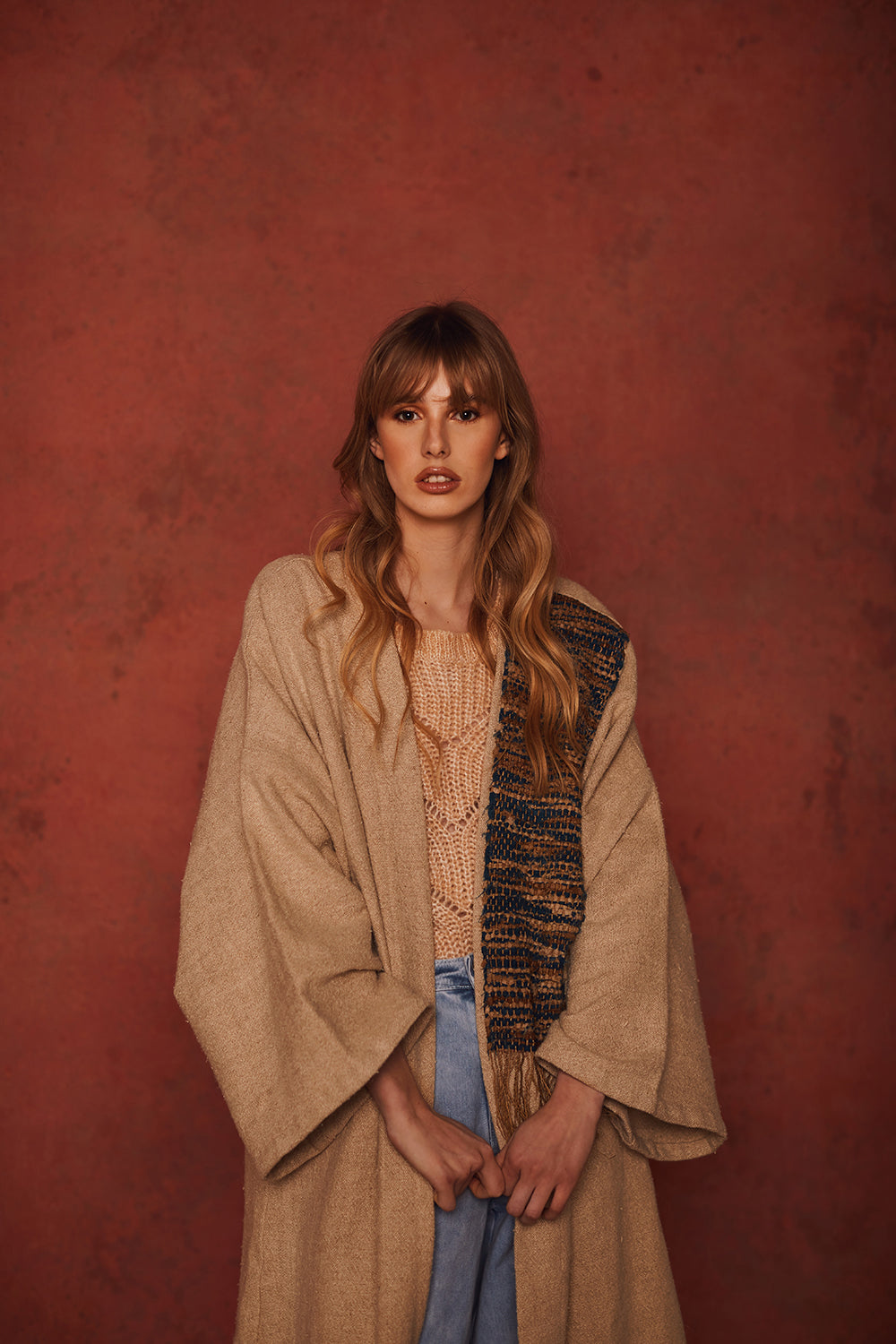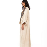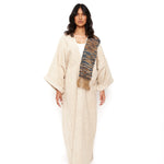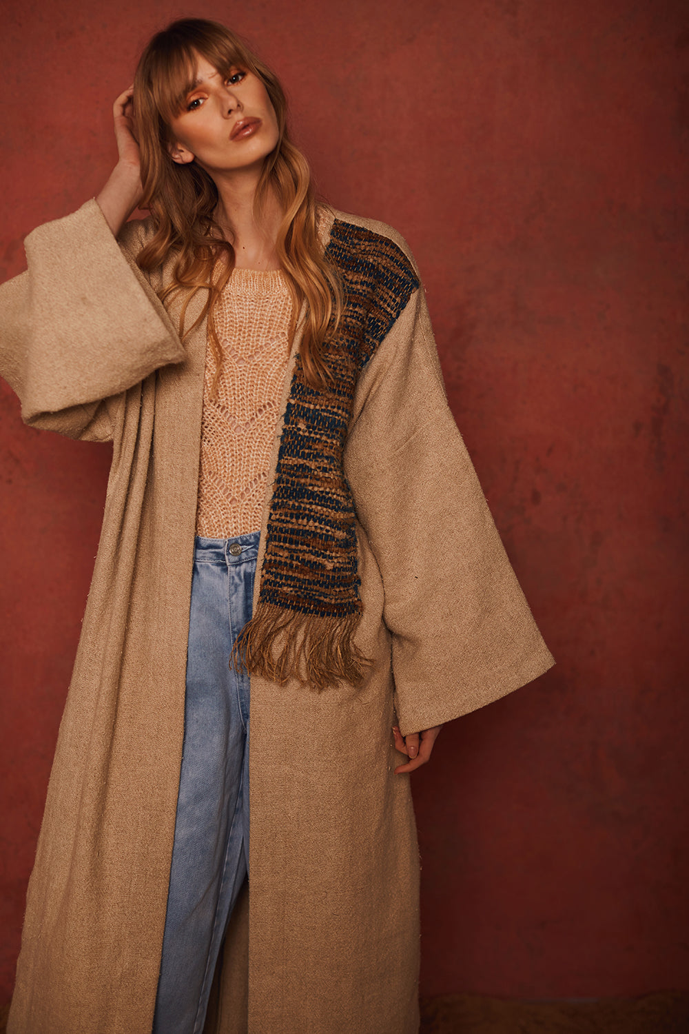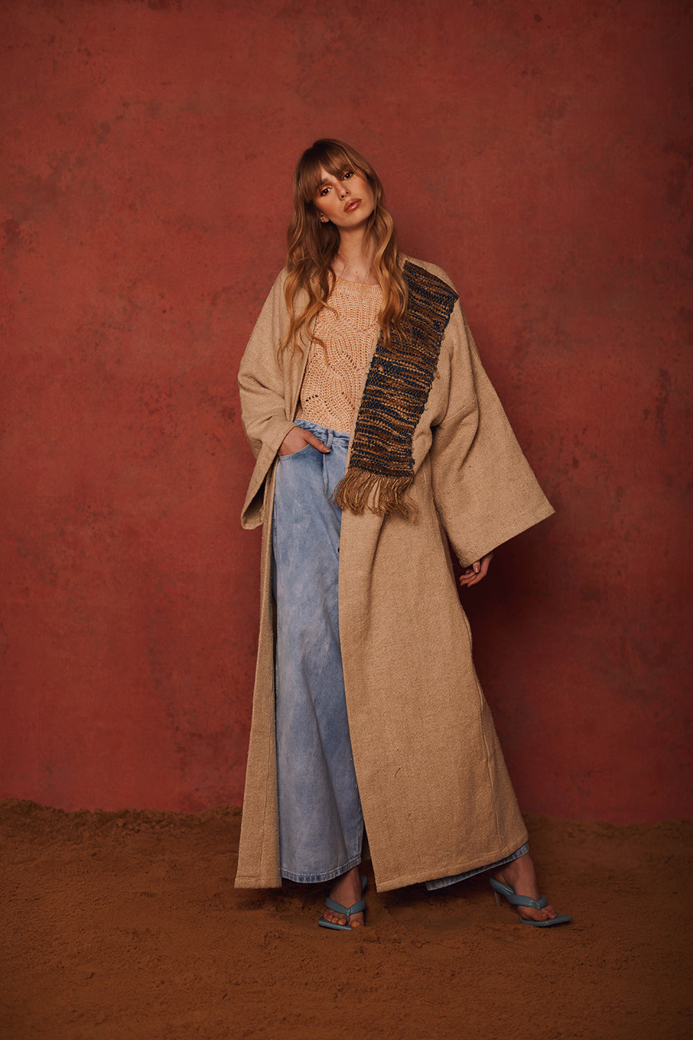 A specially developed untreated and natural hemp and cotton mix dropped shoulder abaya with a very soft and drapey handle. Handwoven in a plain weave with a beautiful slubby texture. Finished with an unusual and textured woven trim.