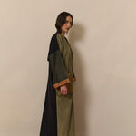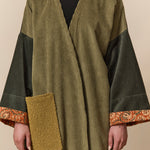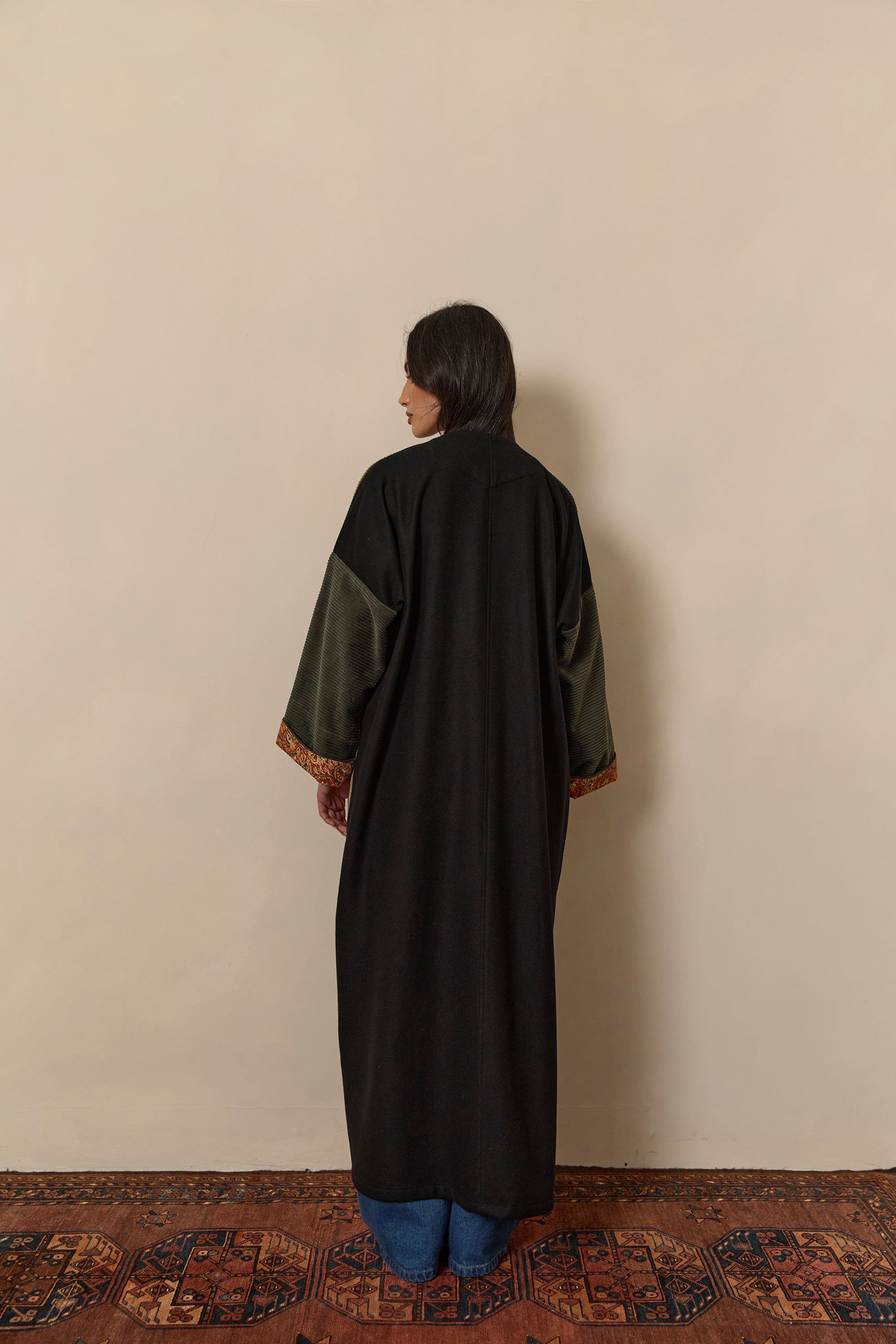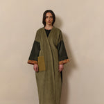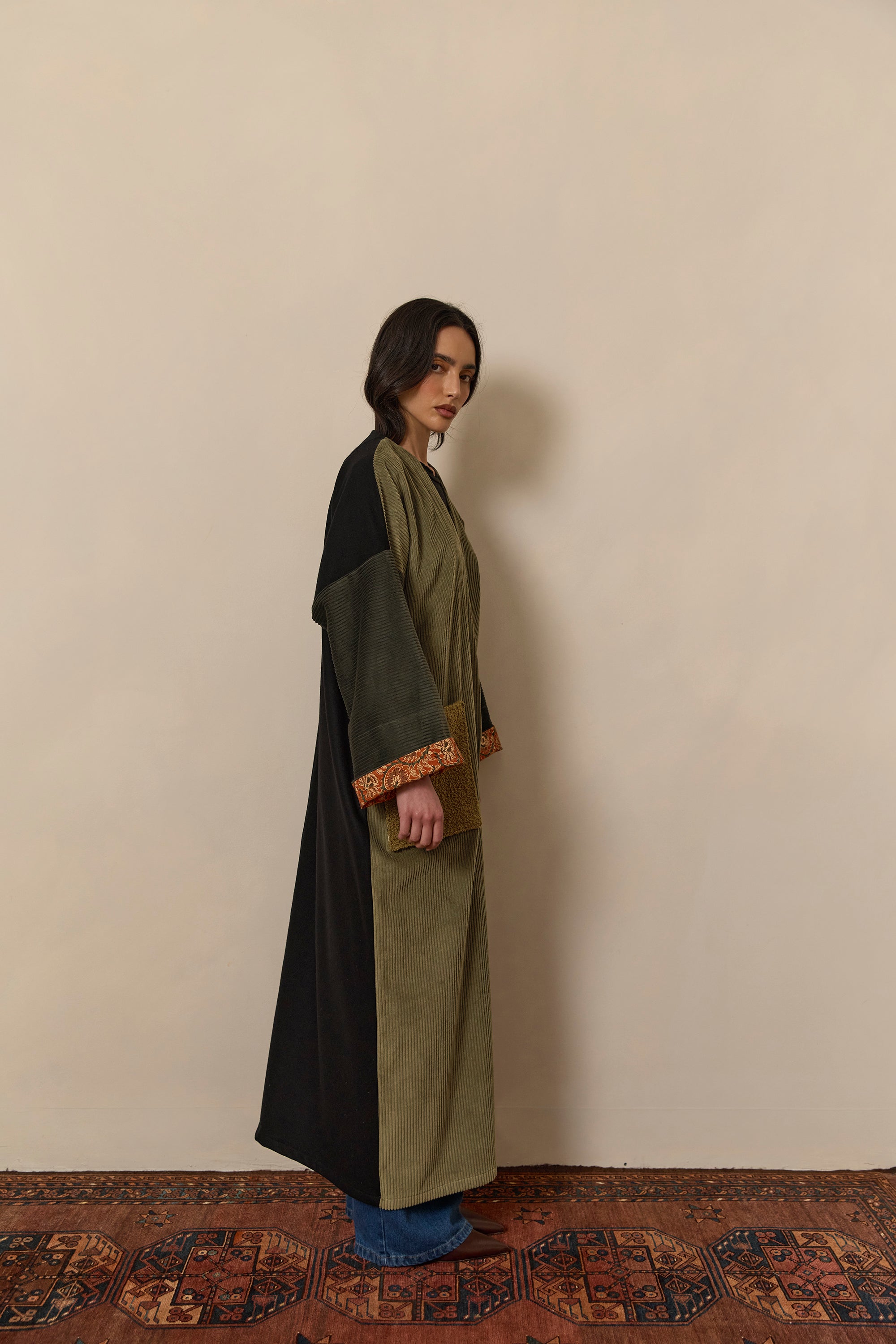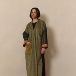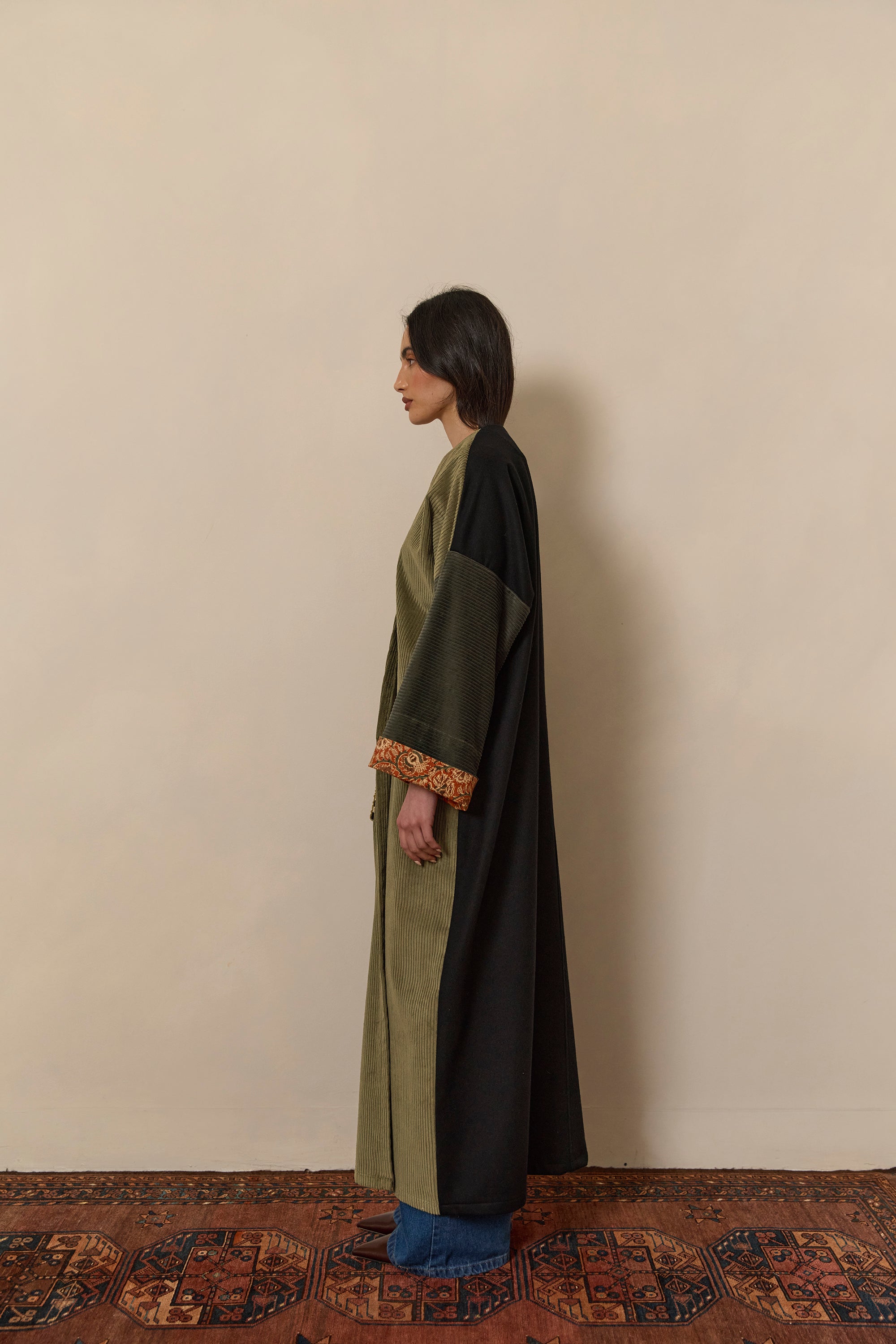 Olive green corduroy, and black wool abaya coat. Finished with Indian Block print inner cuffs, and a vintage textile pocket.