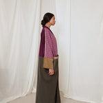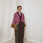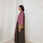 What we did: We have have specially hand selected all the components for this abaya. We love the contrast between all the textures. The wool used for this abaya has been homegrown by Marcia, a friend of AYWA. It was hand-dyed, handspun into yarn, handwoven and finished with a stripe pattern.