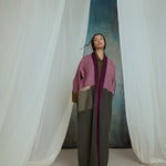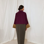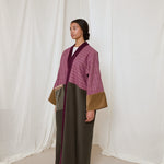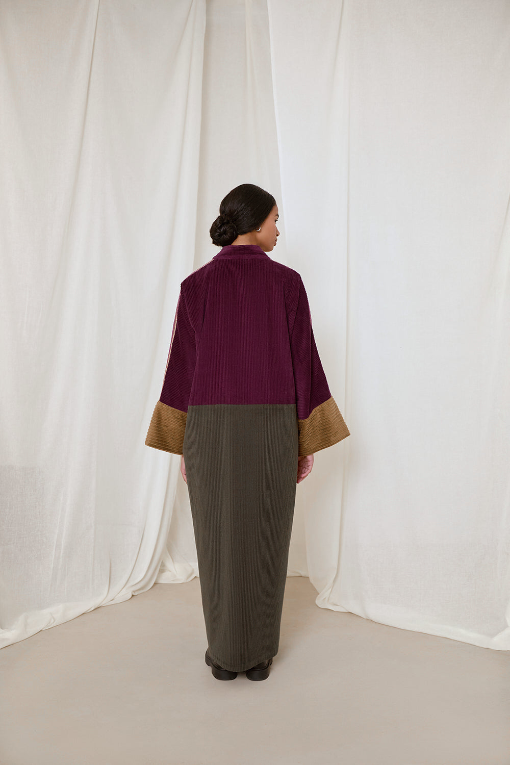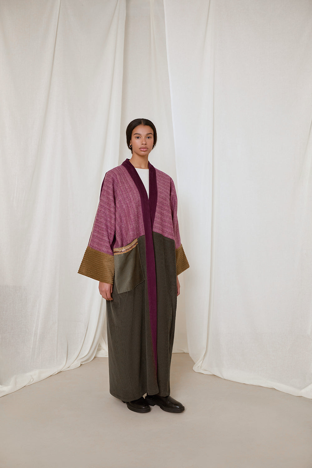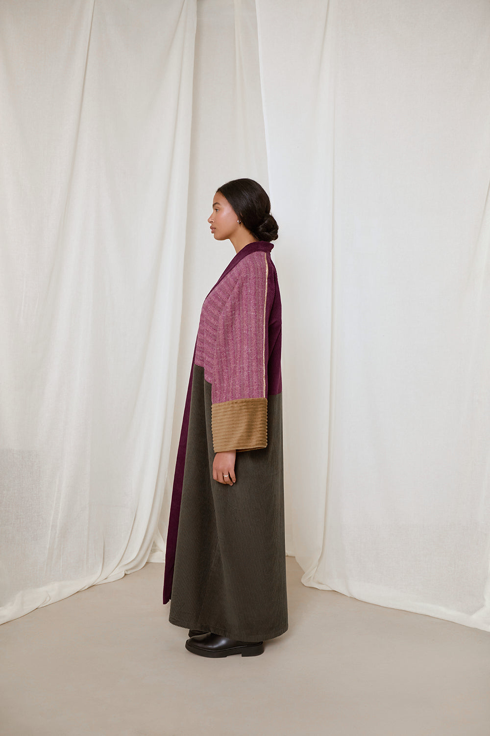 British home-grown and hand made wool abaya, paired with luxe cotton corduroy. Finished with vintage metal work trims sourced in India.